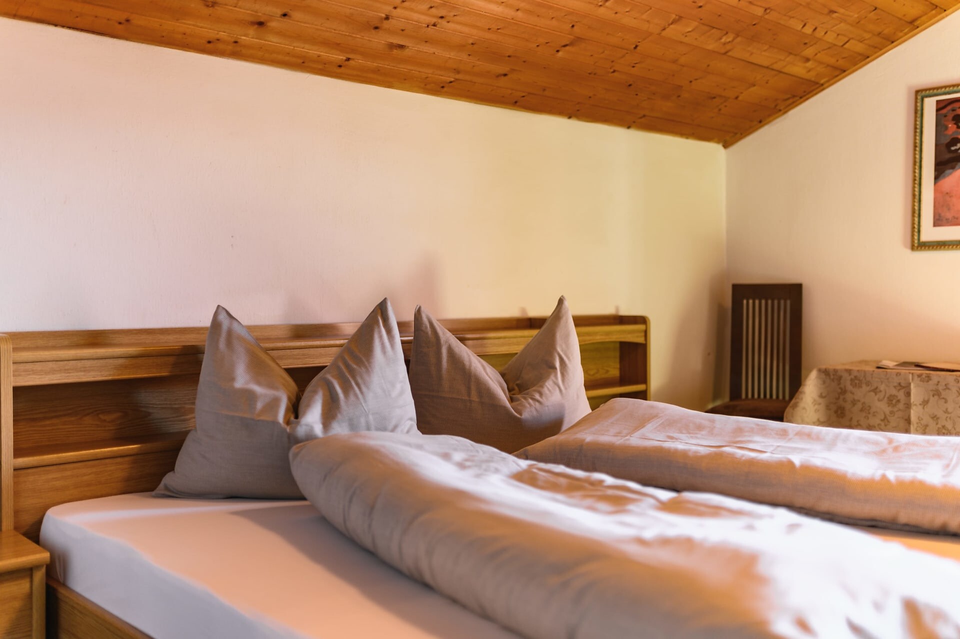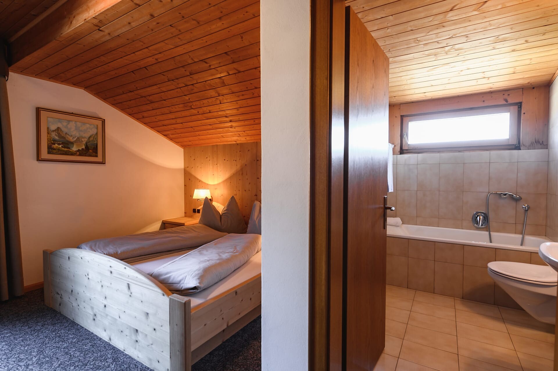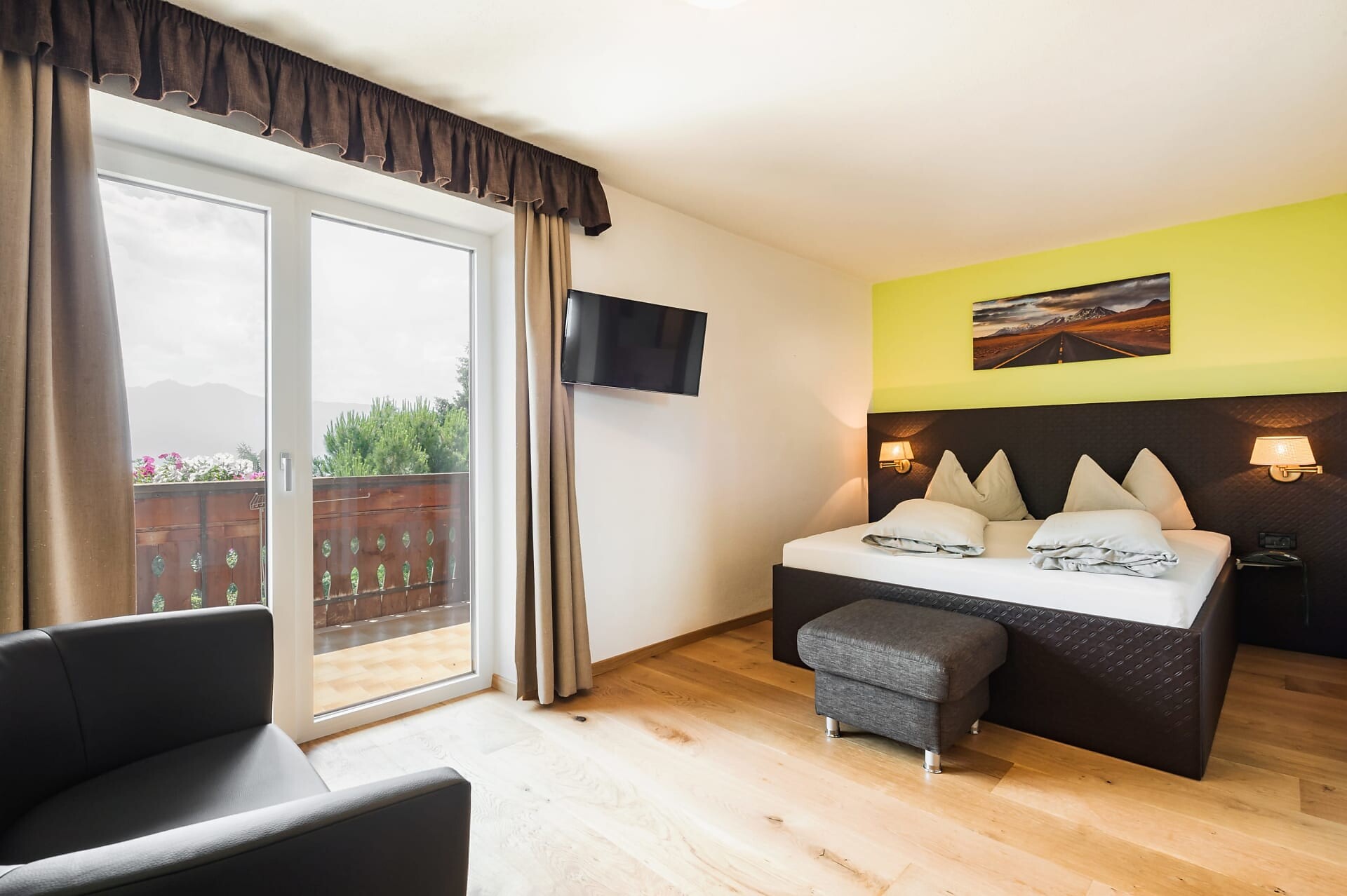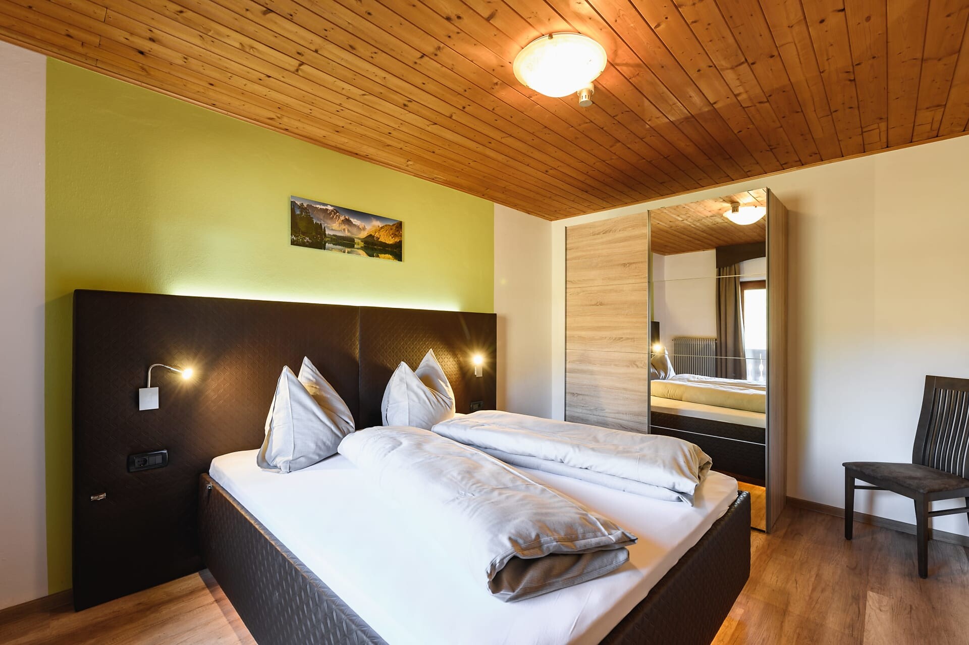Troverete camere confortevoli con bagno/doccia/WC e balcone, sala di soggiorno, terrazza solarium e bar a disposizione degli ospiti. Nella nostra accogliente "Stube" serviamo specialità locali e piatti nazionali, accompagnati da vini scelti dell'Alto Adige.