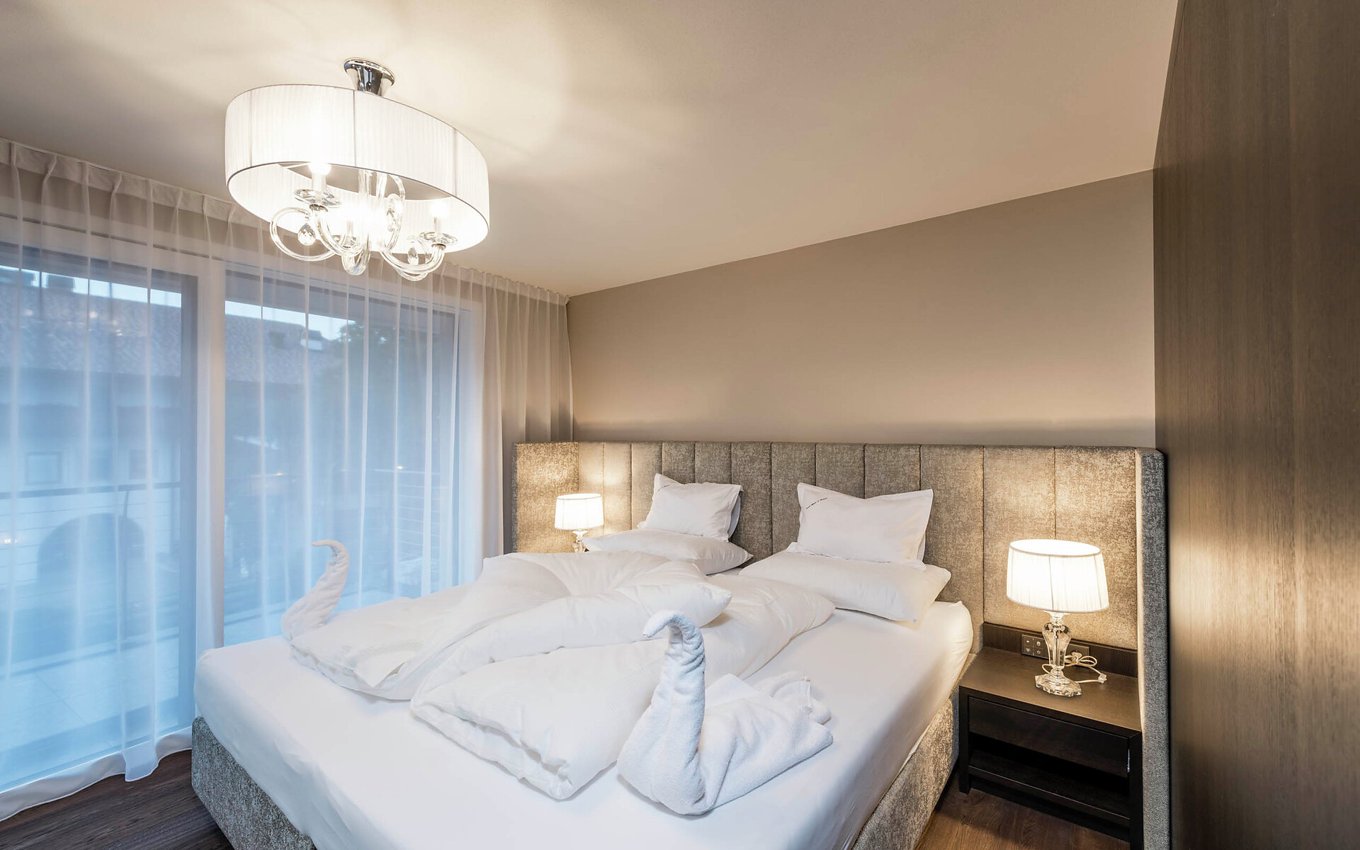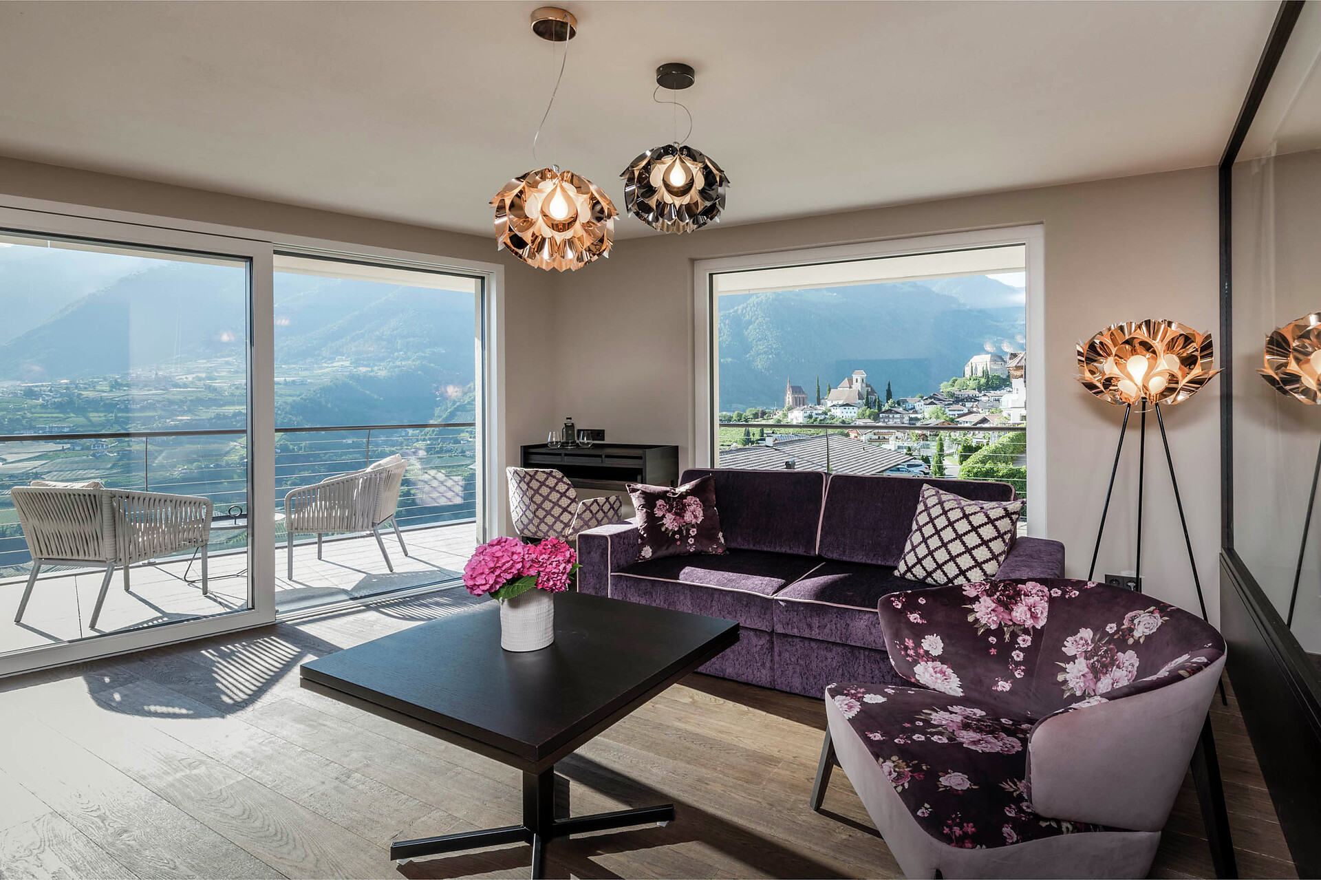 Caratteristiche: Camera da letto e soggiorno separati, comodo divano e poltrona in soggiorno, finestre insonorizzate senza telaio con tende elettriche e vista panoramica mozzafiato, aria condizionata, letti king-size con materassi su misura da 200 x 210 cm, pavimenti in parquet di legno naturale, WiFi in fibra ottica, scrivania, TV FLAT 55', cassa acustica portatile, riviste online, cartella digitale per gli ospiti, minibar, macchina per caffè espresso italiano, bollitore con tè altoatesini selezionati, guardaroba con illuminazione a LED, bagno wellness di design con cabina a infrarossi, prodotti per la cura "Rituals", specchio cosmetico con illuminazione automatica a LED, WC separato con bidet, infradito, borsa SPA a noleggio con morbido e soffice accappatoio e teli per la sauna, asciugacapelli, spugna di cotone, pino cembro, menù di cuscini per il collo, in piuma e anallergici su richiesta, coperta di peluche, cassaforte per laptop