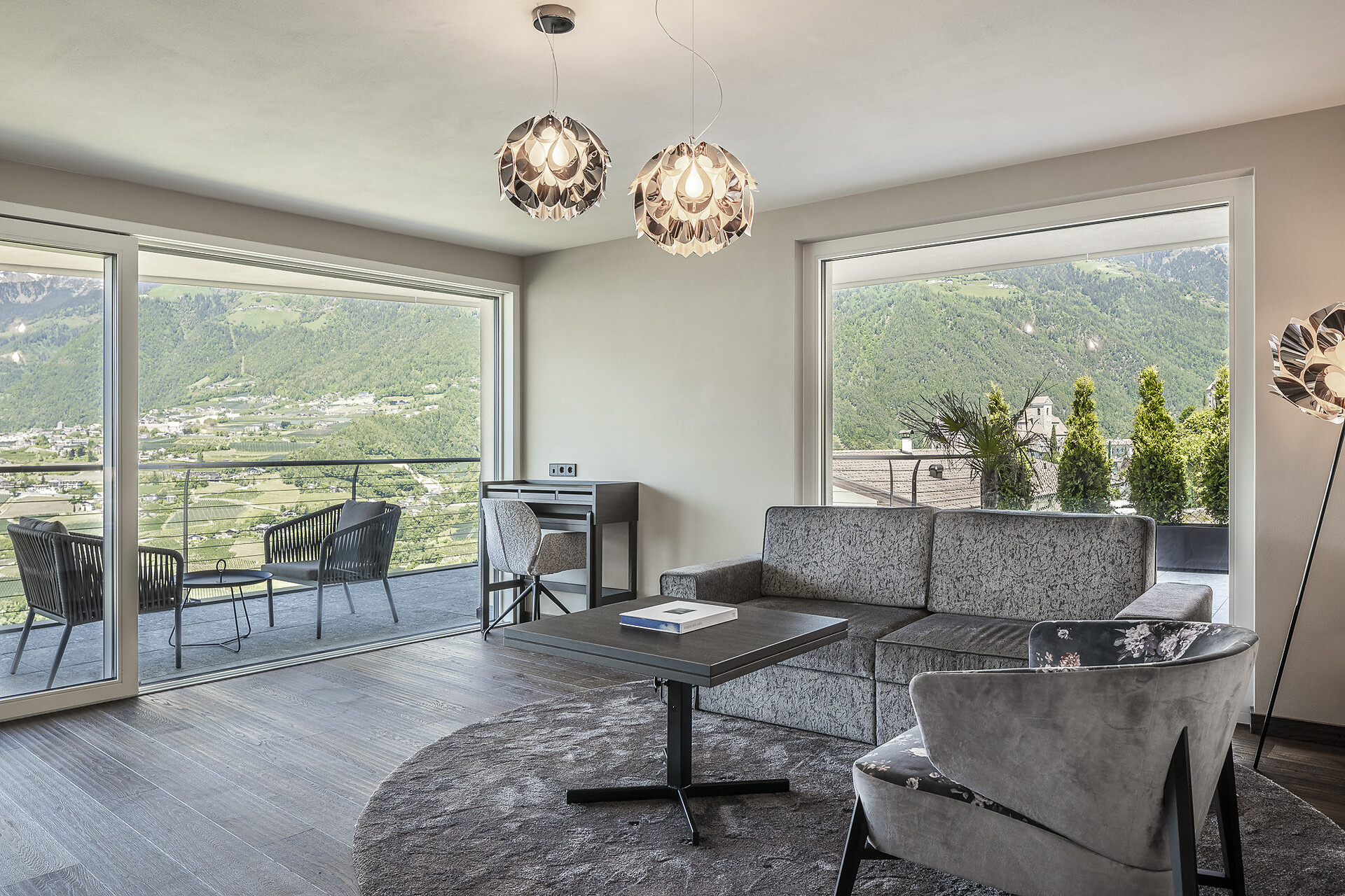 Esposte a sud-ovest con una magnifica vista panoramica sul parco naturale "Texelgruppe" e sulla campagna meranese. Gli amanti del sole e della natura possono godere della grande terrazza coperta tra i 22 m² e i 24 m². Una cabina a infrarossi per 2 persone completa il benessere. Questa suite offre spazio per un massimo di 4 persone - suite per non fumatori