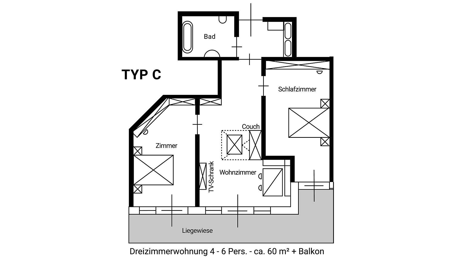 (per 2 - 6 persona/e | 60 m² | 3 appartamenti di questo tipo )