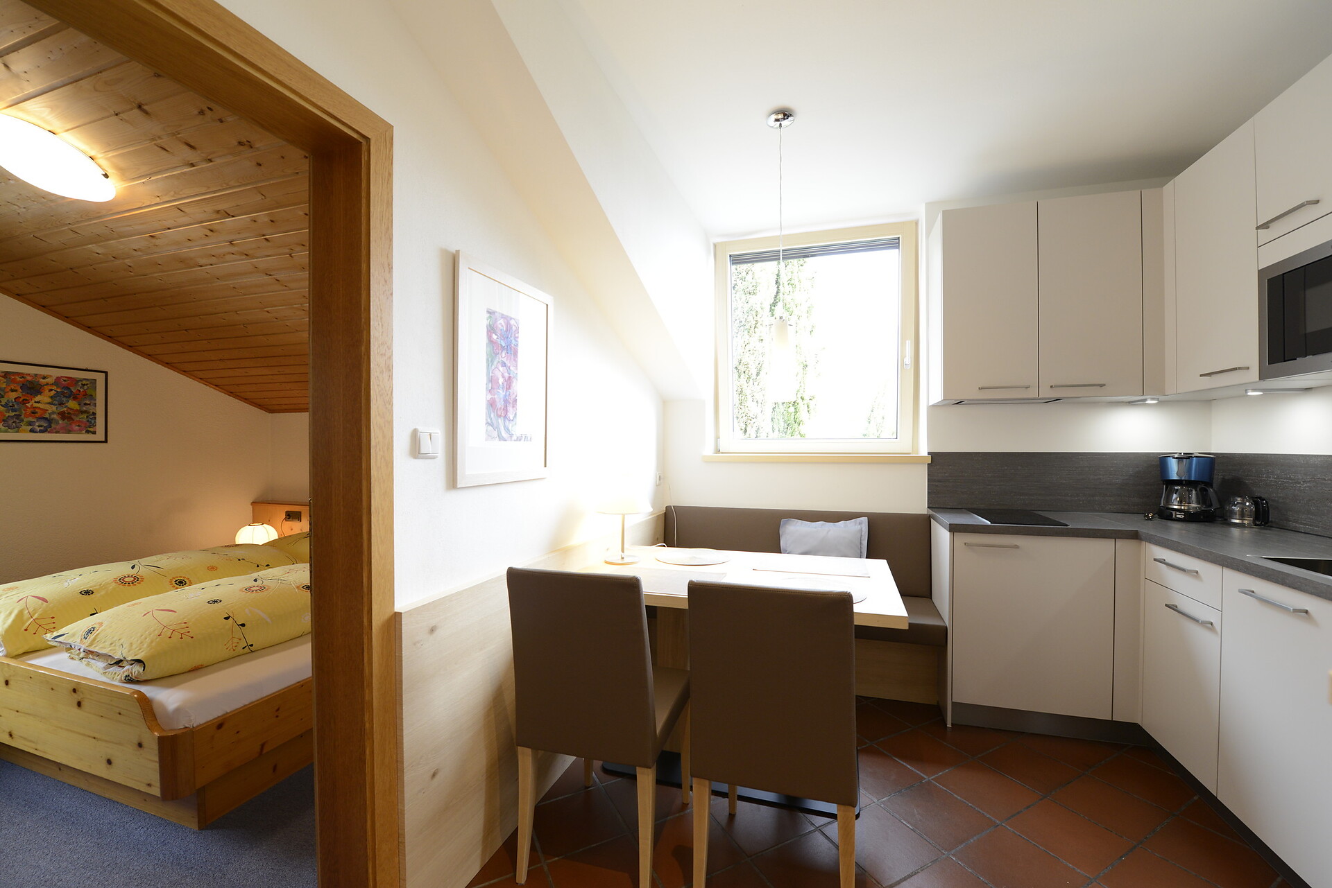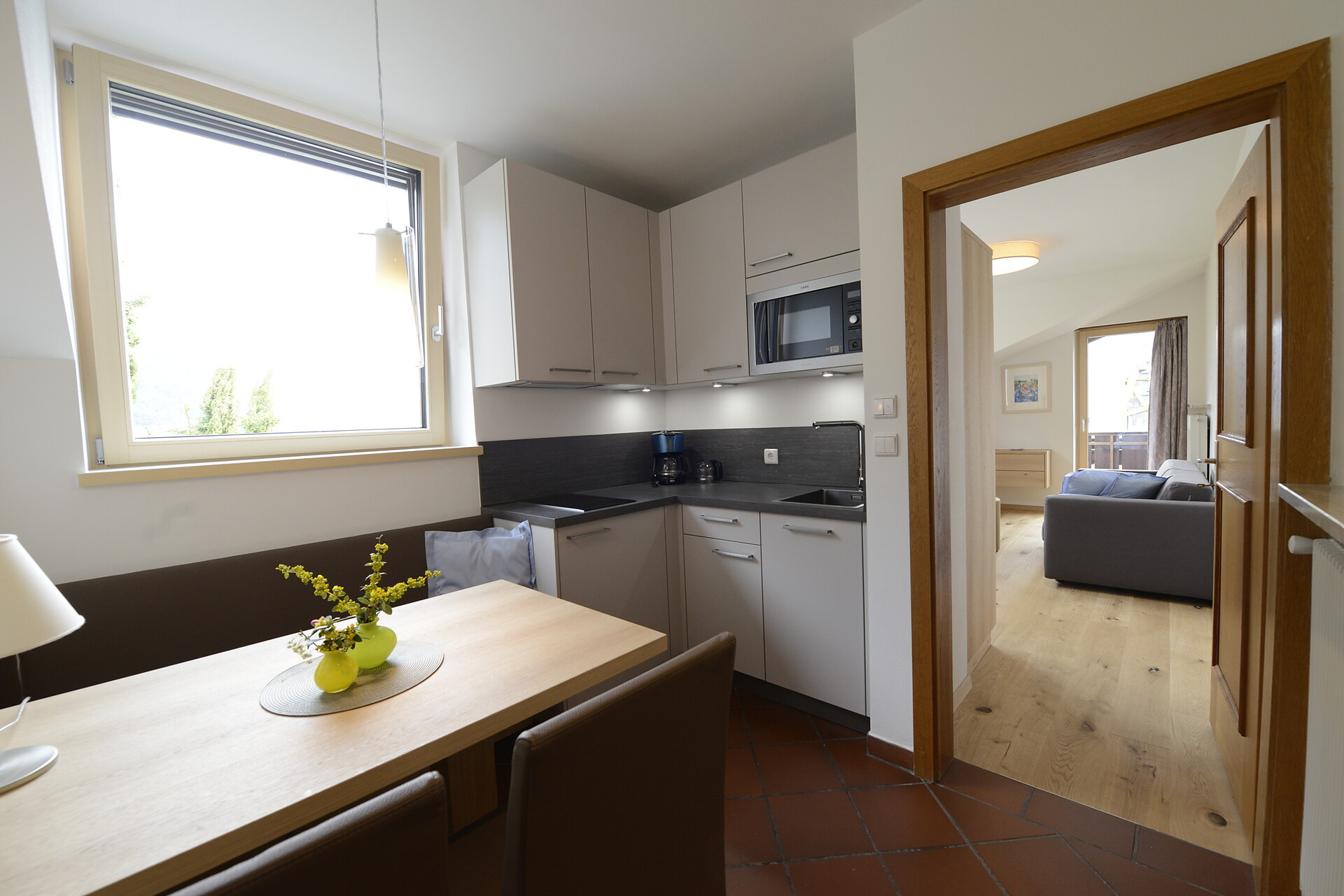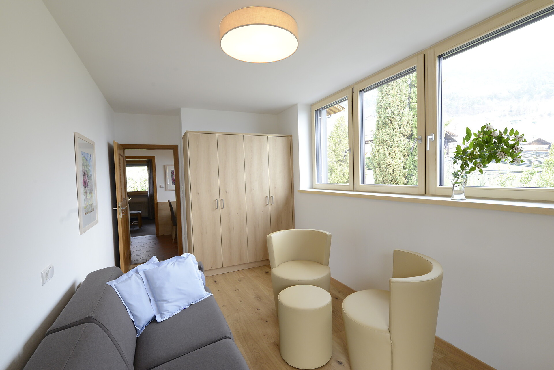 Camera da letto e soggiorno separati. Due appartamenti con vista Merano e uno con balcone diretto verso Nord-Est (vista Parcines) Ideale per due persone, ma anche una terza persona puó dormire in soggiorno sul divano letto