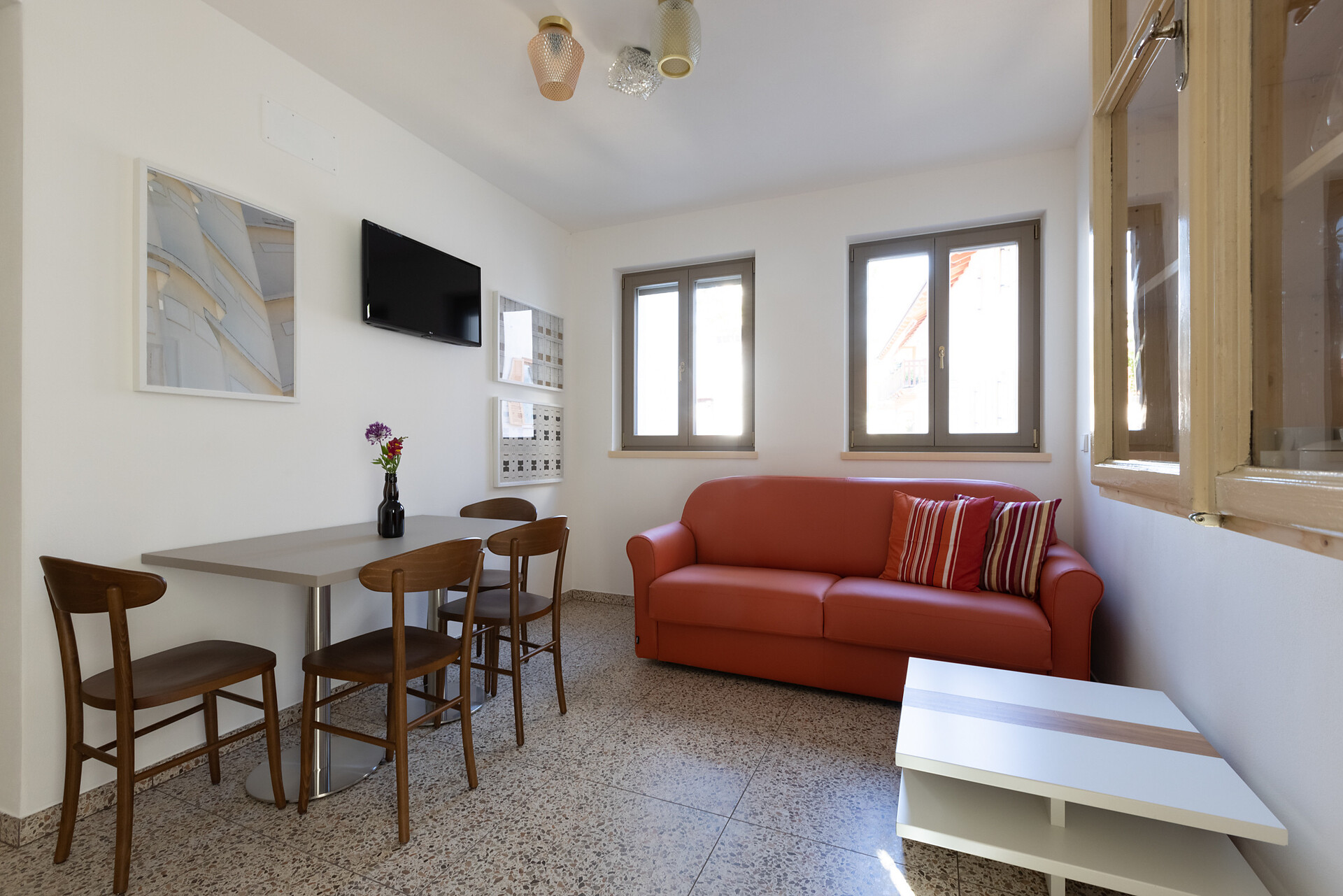 1 x camera matrimoniale con soggiorno integrato, divano letto matrimoniale, zona soggiorno e angolo cottura, bagno con doccia/WC