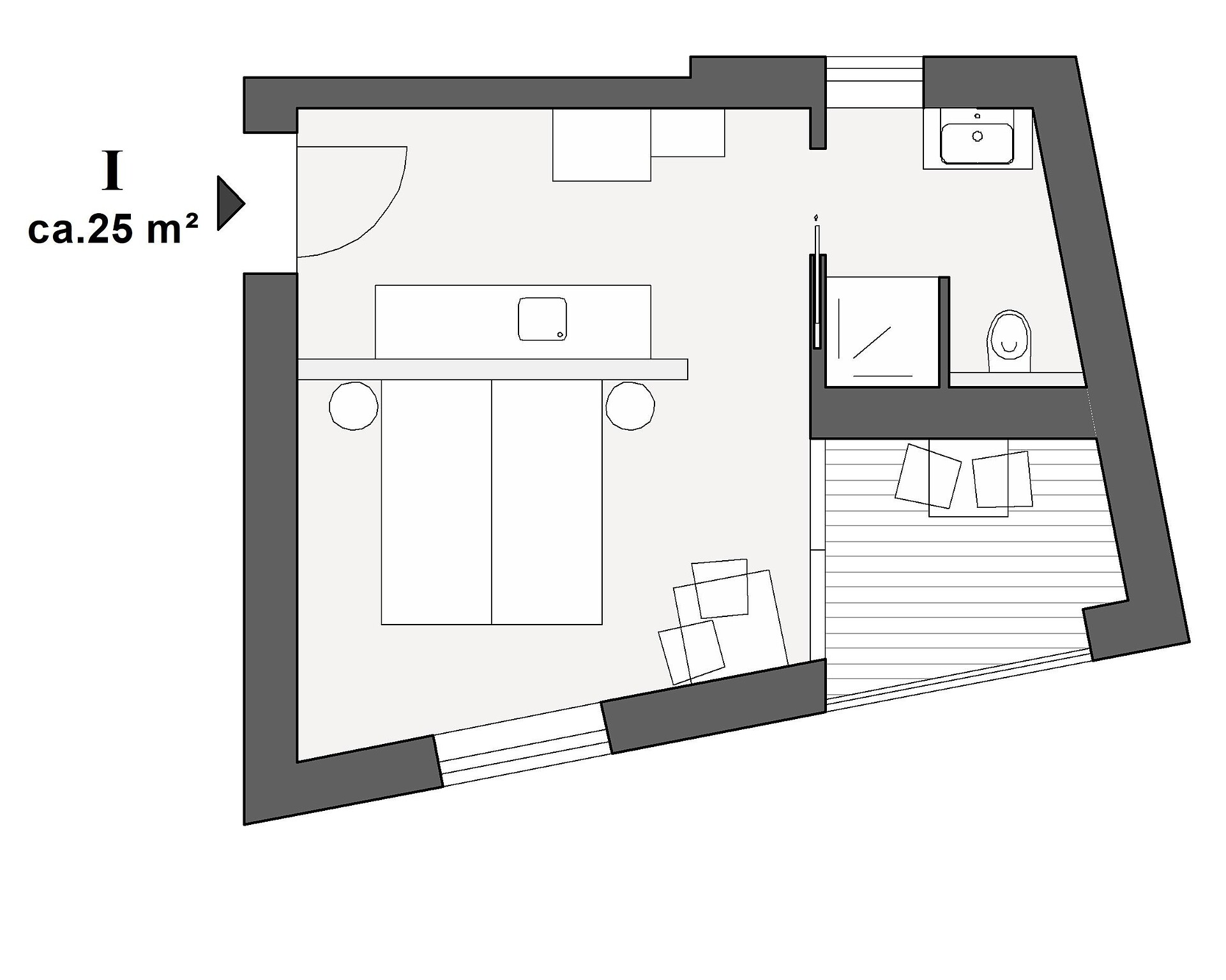 Camera matrimoniale con balcone, tavolino da pranzo, poltrona, bagno con doccia/WC, angolo cottura