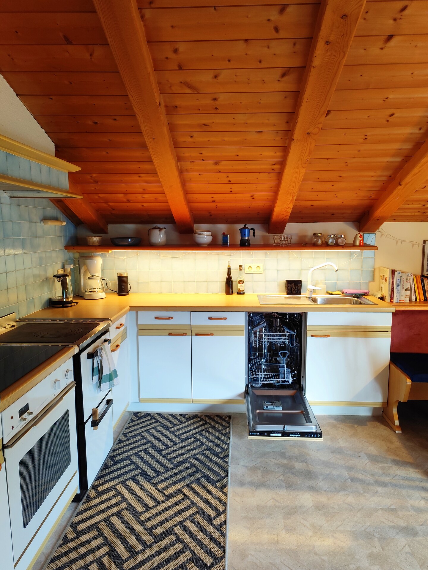 Cucina completamente attrezzata con macchina da caffè a filtro, moka, nuovo piano cottura a induzione, forno e nuova lavastoviglie