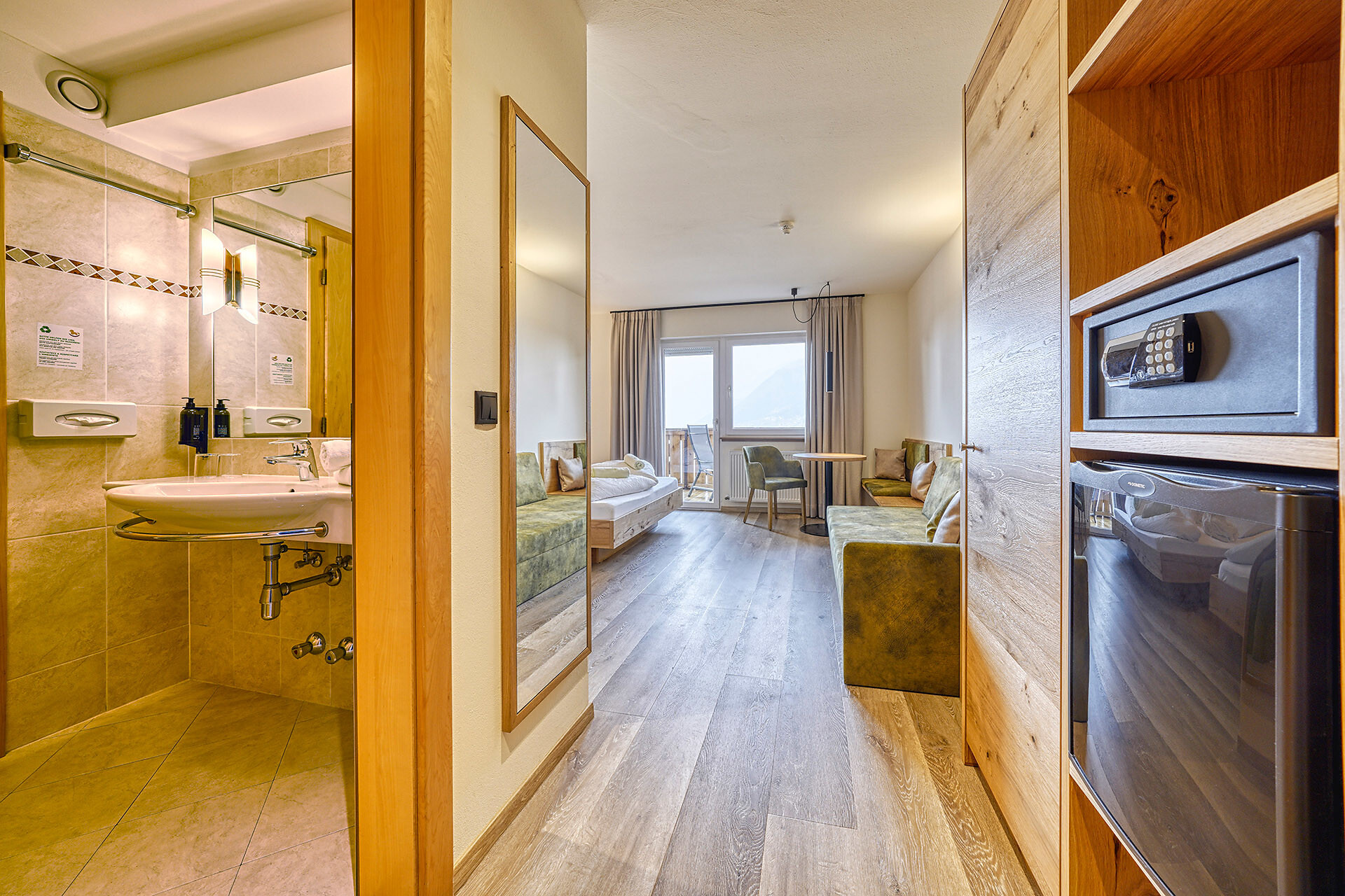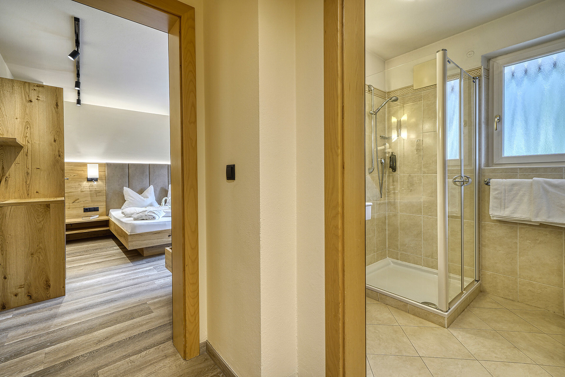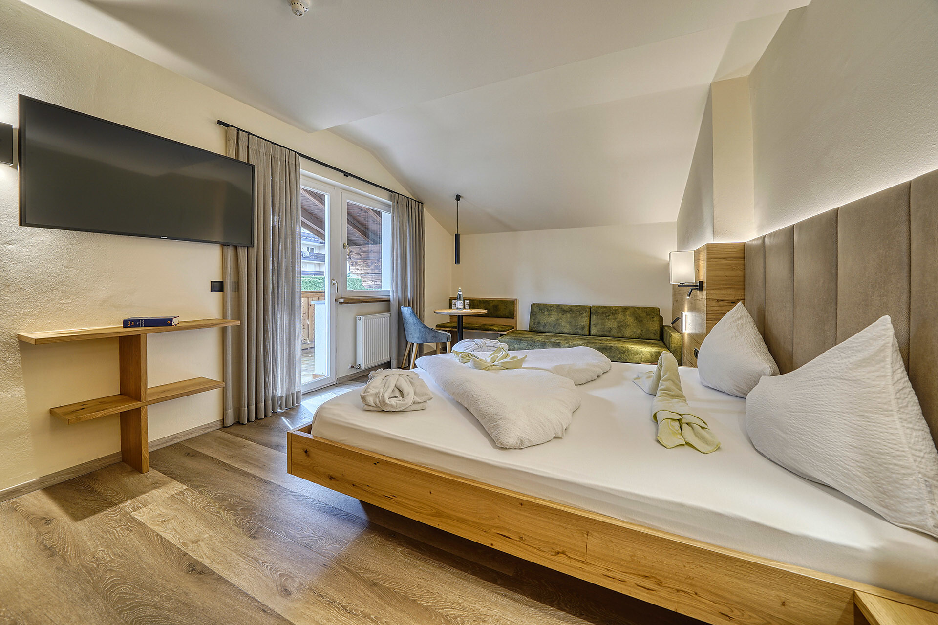 Family Suite Cervo - ca. 40 mq. Camera doppia matrimoniale con camera separata per bambini con 2 letti e finestra, angolo soggiorno, TV satellitare, cassaforte, frigo e WiFi. Bagno provvisto di doccia, asciugacapelli, WC, bidet e accappatoi. Balcone est con vista panoramica.