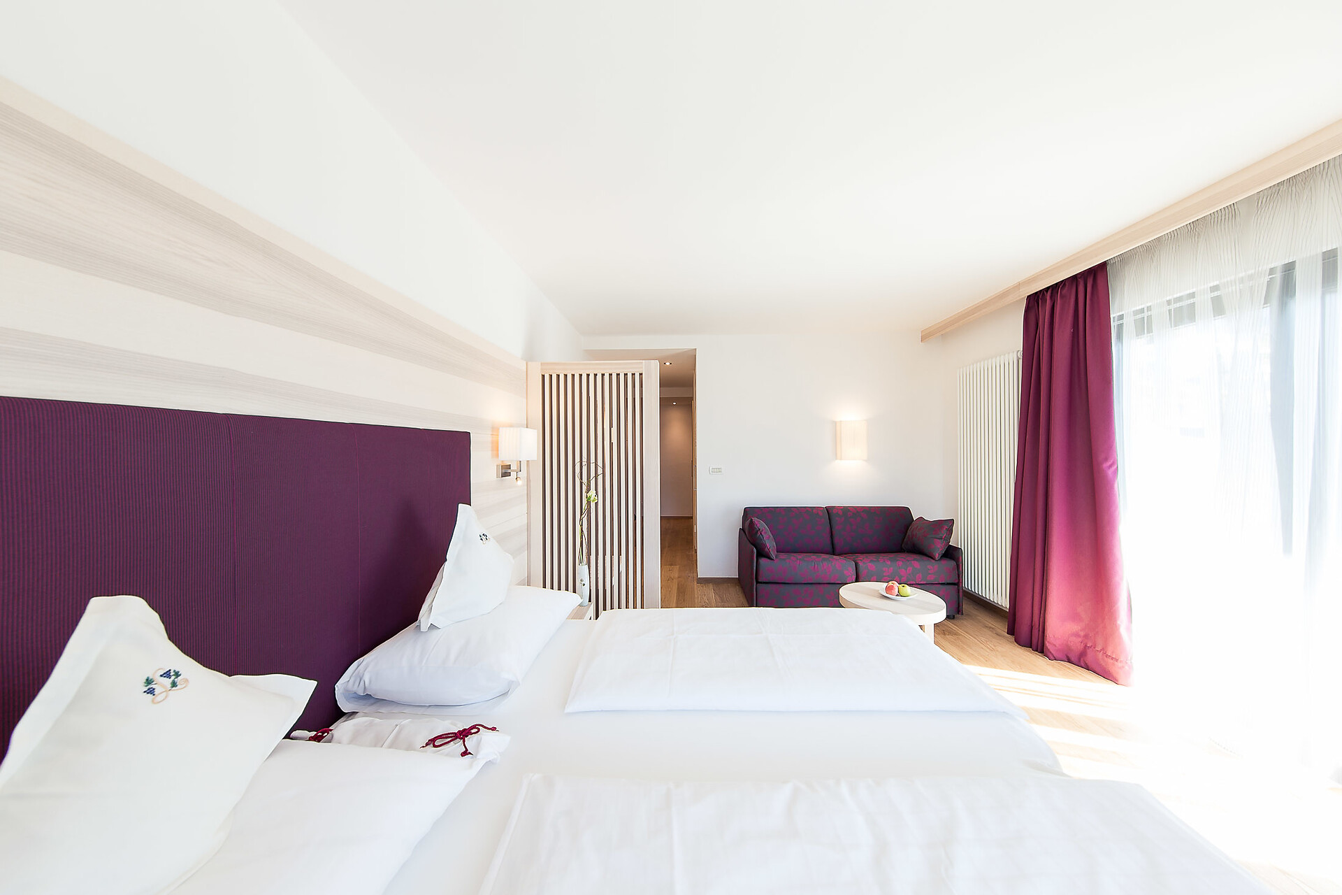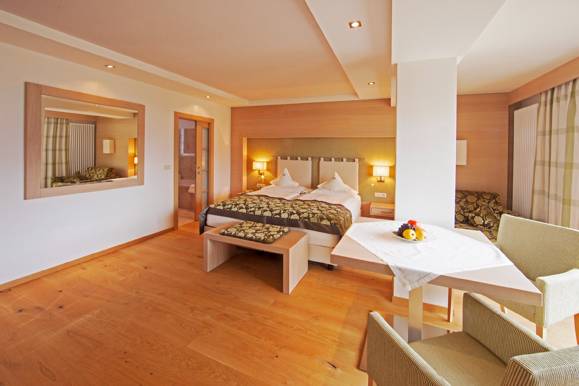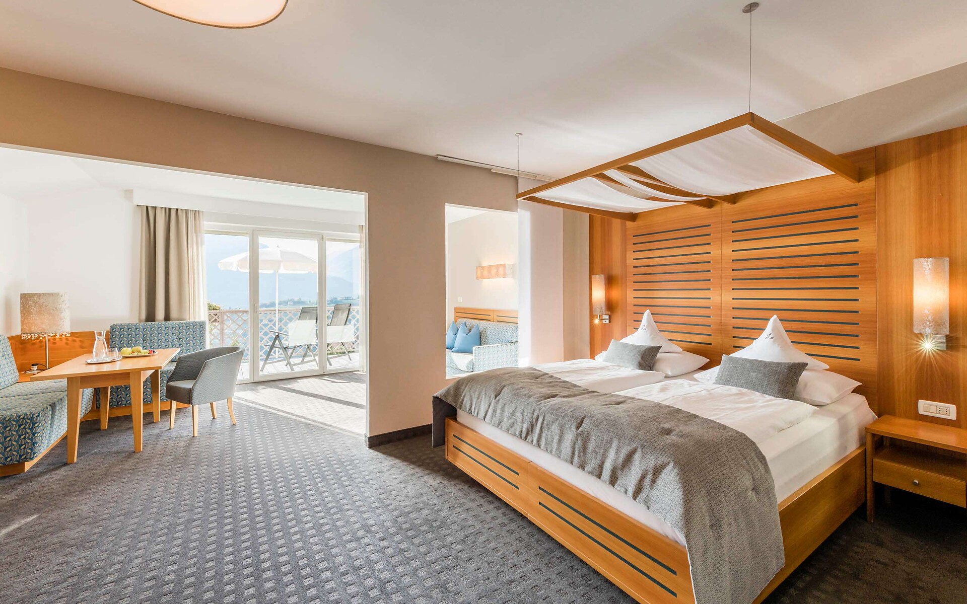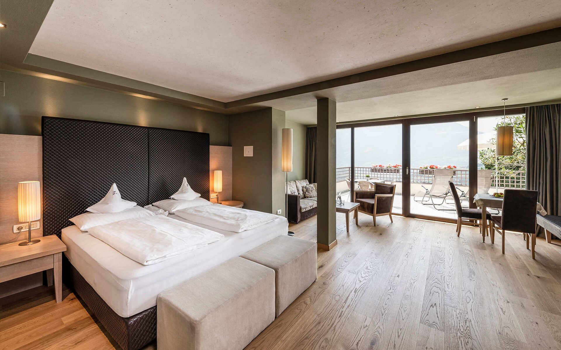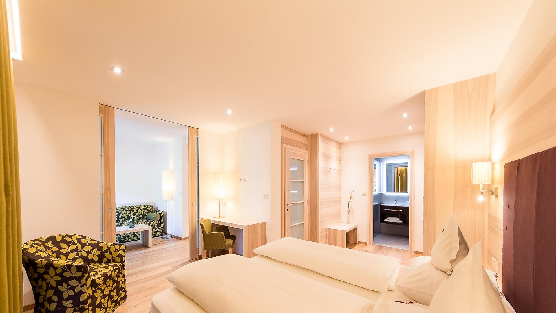 ca. 75 m² - Le esclusive suite PALMA in legno di larice o rovere con tessuti eleganti dispongono di due camere separate, di cui una con ampia zona soggiorno con comodo tavolo ad angolo e divano. Un bagno giorno separato, due TV a schermo piatto, cassaforte, telefono, frigorifero, ampio bagno con doccia e vasca da bagno, lavabo doppio, WC, bidet, asciugacapelli, specchio cosmetico e connessione Wi-Fi gratuita fanno della vacanza nella suite PALMA un’avventura superlativa e indimenticabile. Il grande e soleggiato balcone esposto a sud ovest offre una vista mozzafiato sulle montagne circostanti e su tutta Merano (lato giardino).