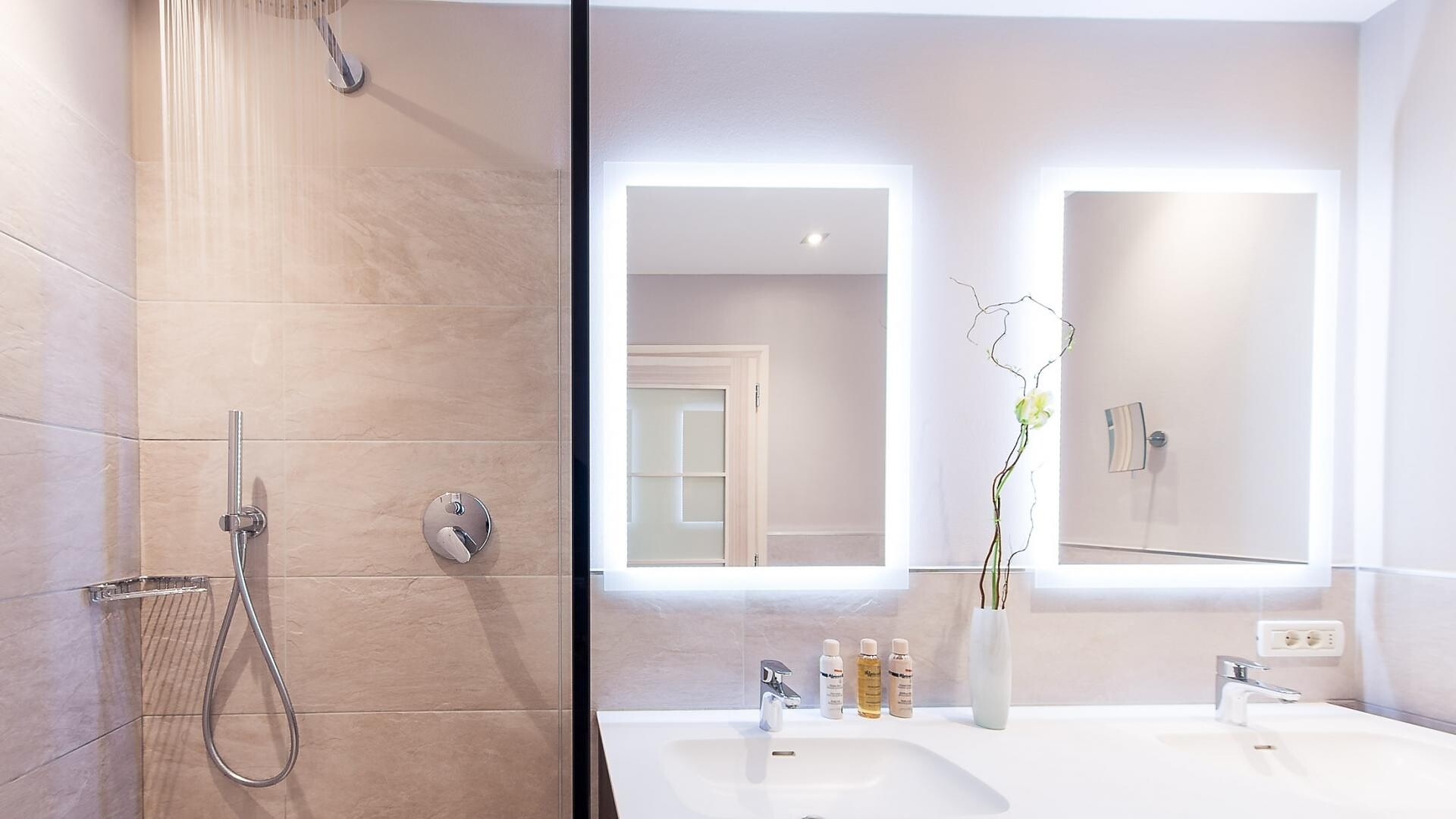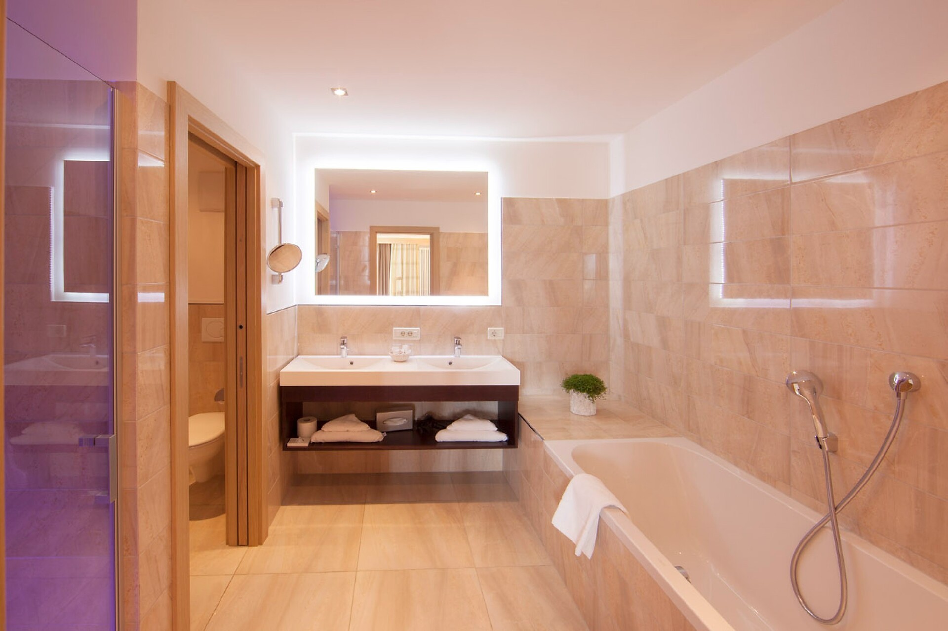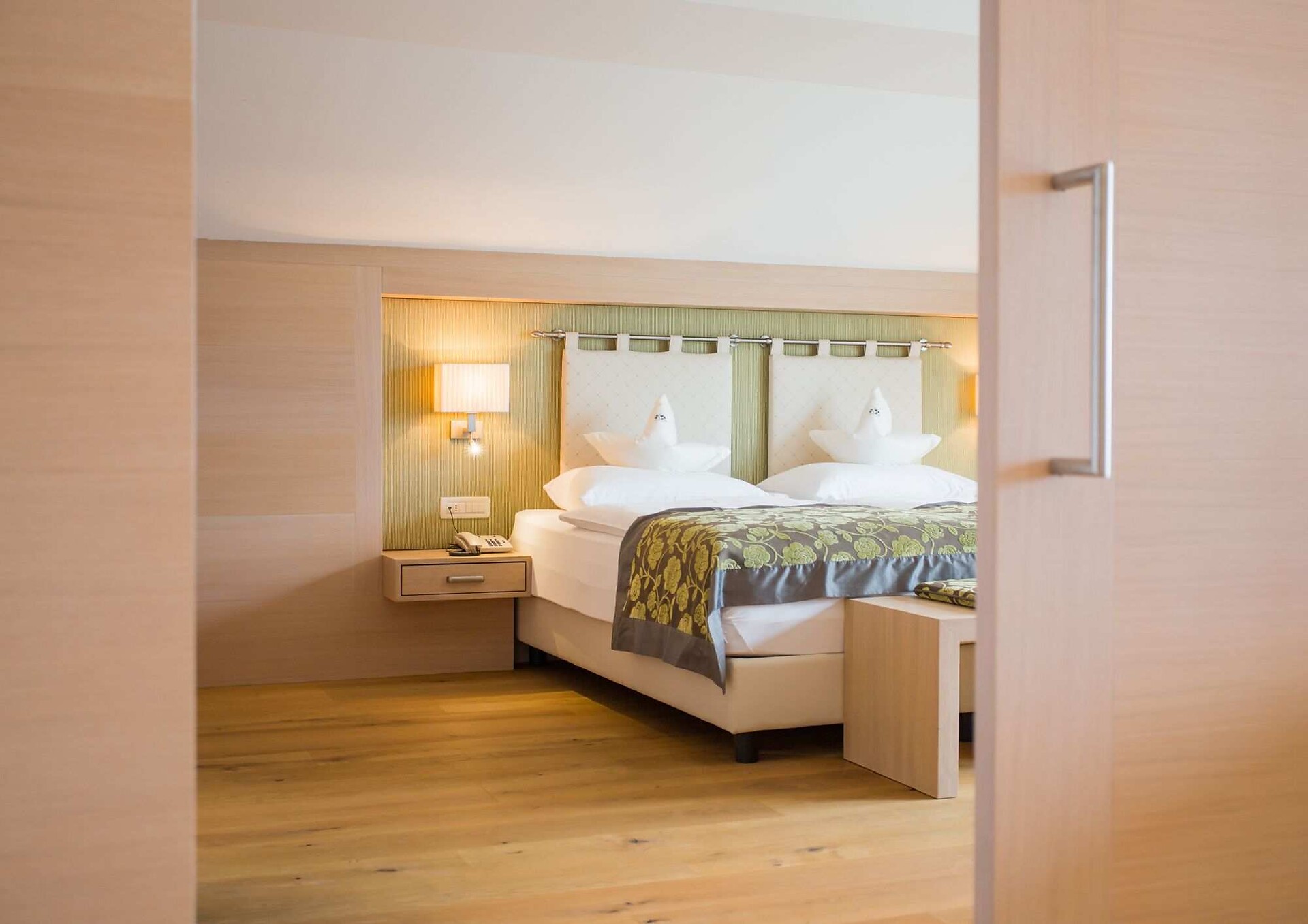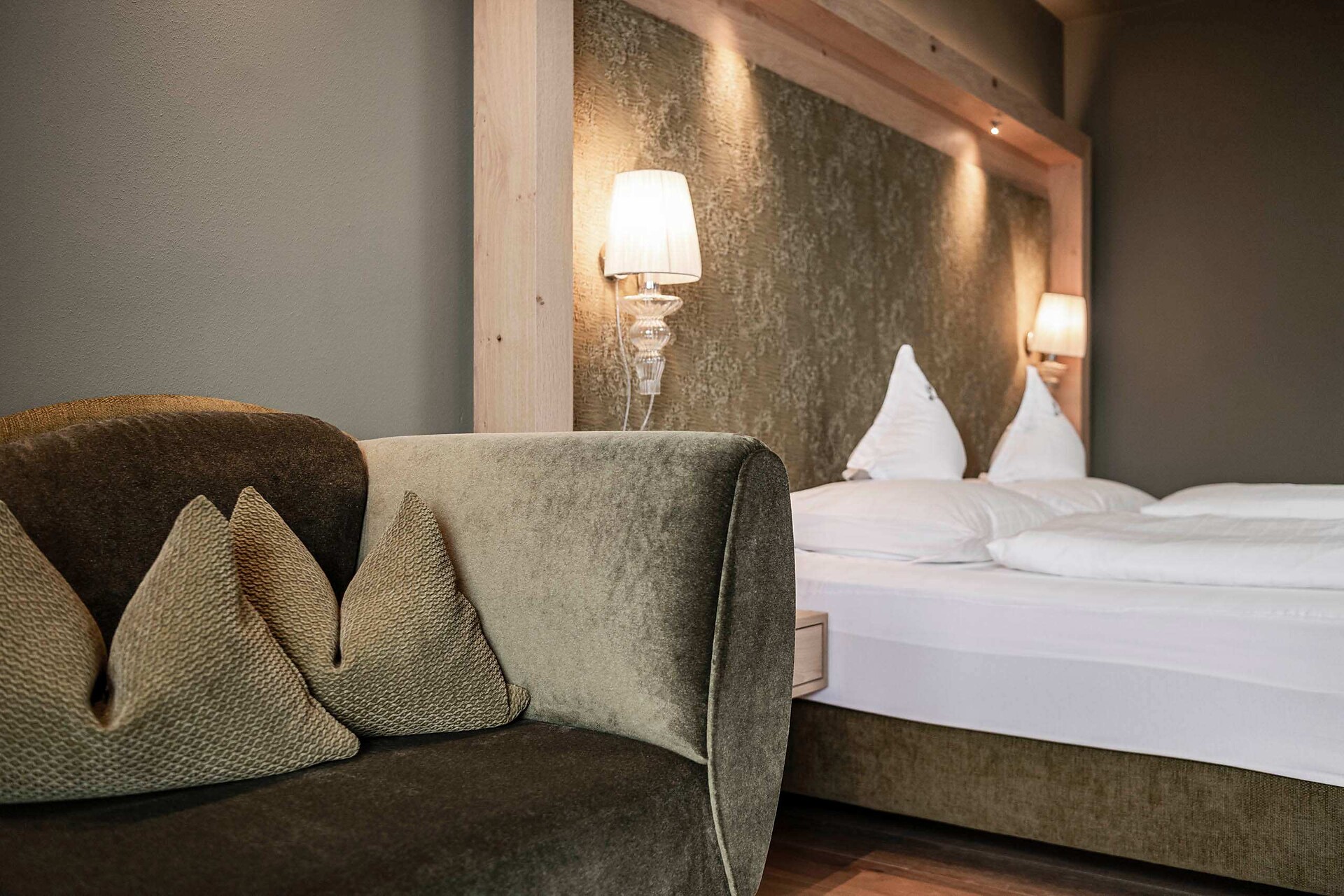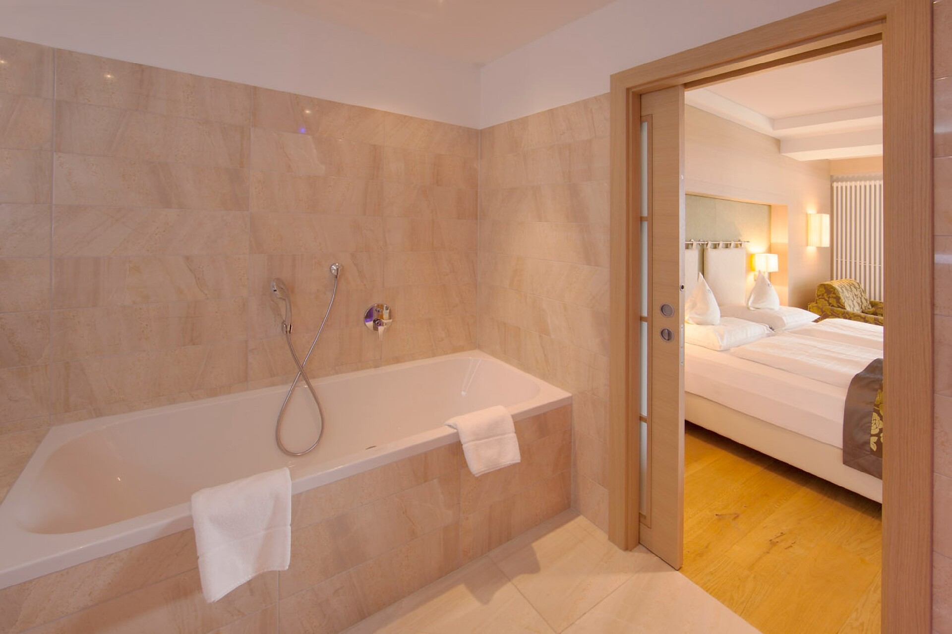 ca. 75 m² - Le esclusive suite PALMA in legno di larice o rovere con tessuti eleganti dispongono di due camere separate, di cui una con ampia zona soggiorno con comodo tavolo ad angolo e divano. Un bagno giorno separato, due TV a schermo piatto, cassaforte, telefono, frigorifero, ampio bagno con doccia e vasca da bagno, lavabo doppio, WC, bidet, asciugacapelli, specchio cosmetico e connessione Wi-Fi gratuita fanno della vacanza nella suite PALMA un’avventura superlativa e indimenticabile. Il grande e soleggiato balcone esposto a sud ovest offre una vista mozzafiato sulle montagne circostanti e su tutta Merano (lato giardino).