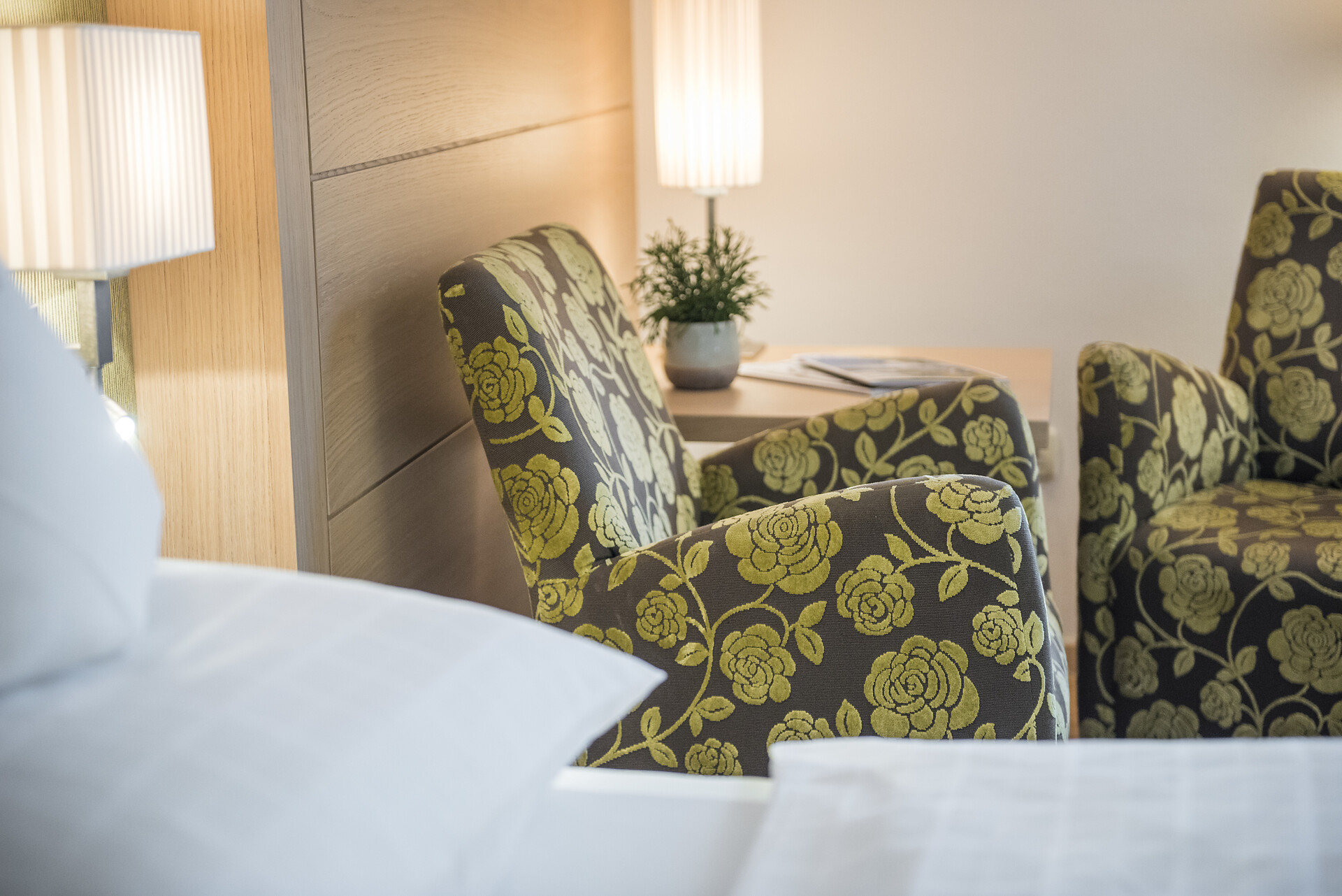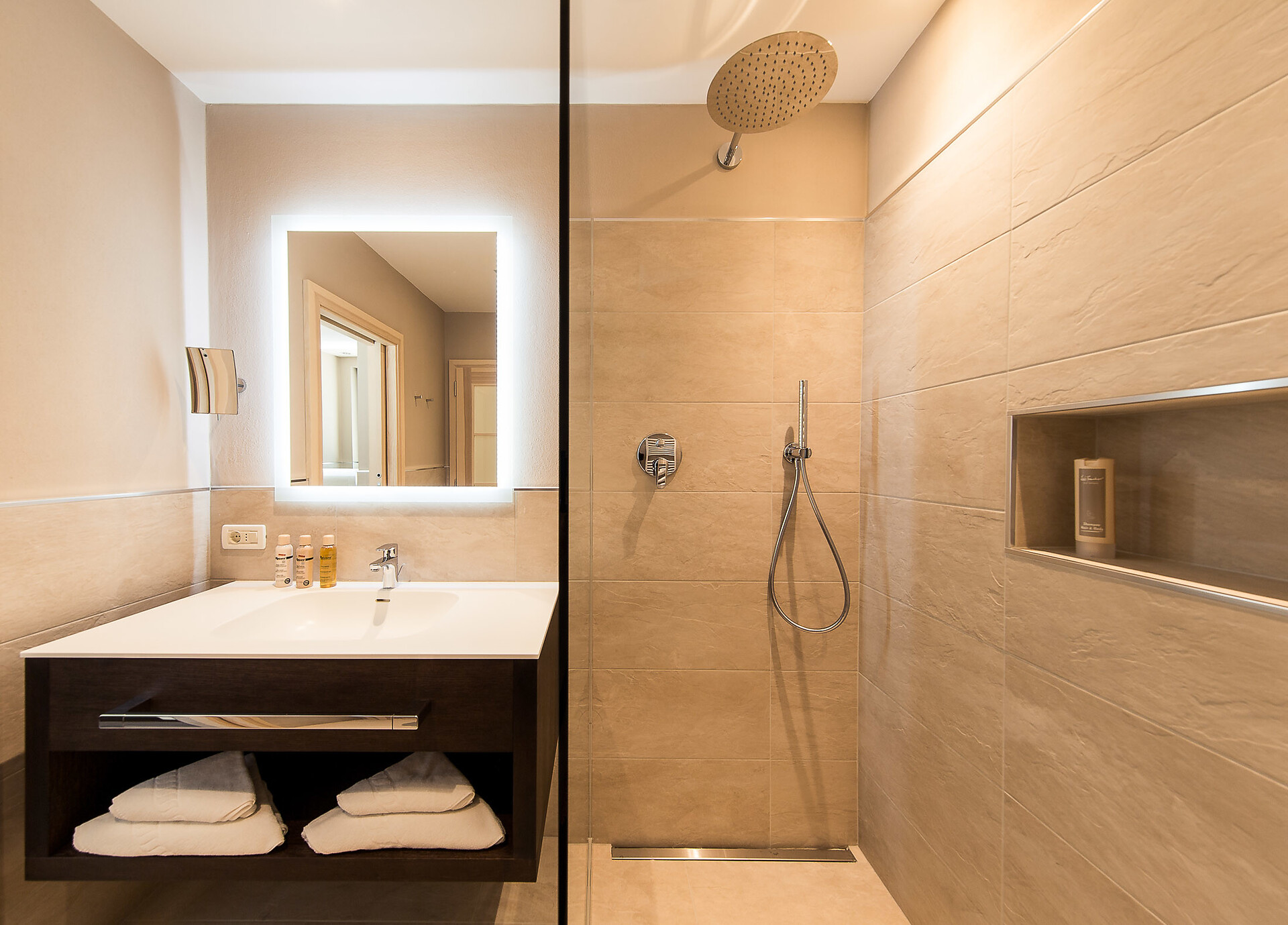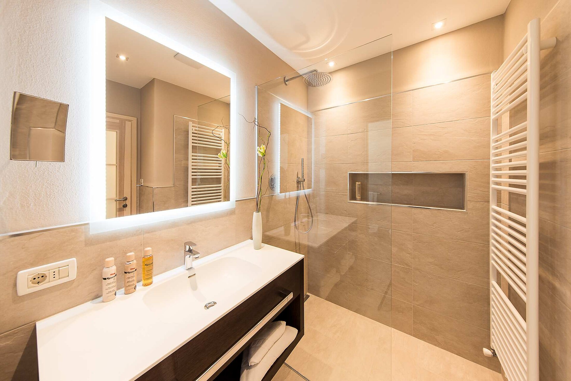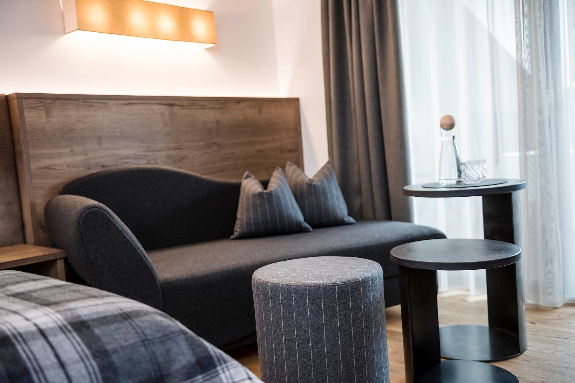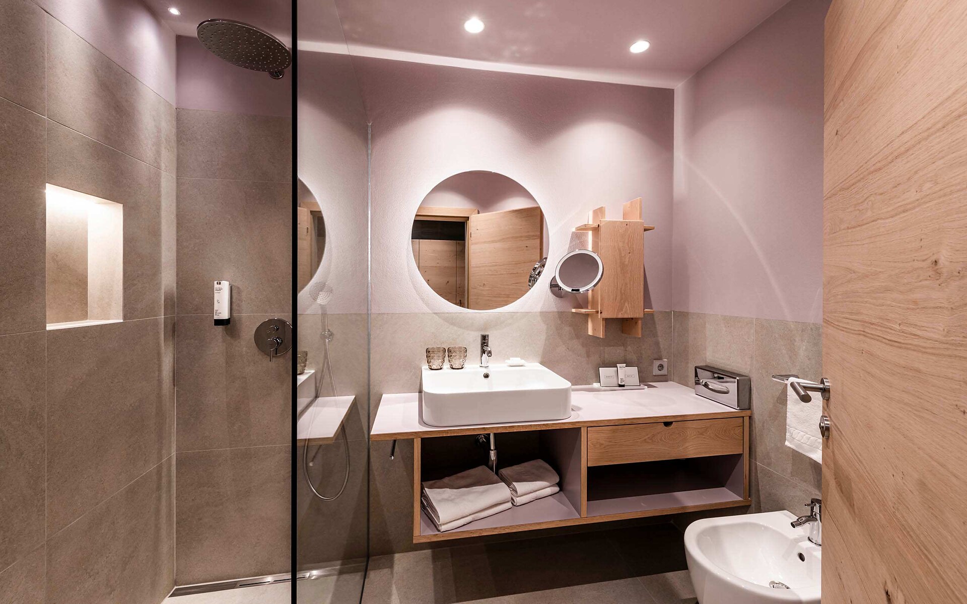 ca. 75 m² - Le esclusive suite PALMA in legno di larice o rovere con tessuti eleganti dispongono di due camere separate, di cui una con ampia zona soggiorno con comodo tavolo ad angolo e divano. Un bagno giorno separato, due TV a schermo piatto, cassaforte, telefono, frigorifero, ampio bagno con doccia e vasca da bagno, lavabo doppio, WC, bidet, asciugacapelli, specchio cosmetico e connessione Wi-Fi gratuita fanno della vacanza nella suite PALMA un’avventura superlativa e indimenticabile. Il grande e soleggiato balcone esposto a sud ovest offre una vista mozzafiato sulle montagne circostanti e su tutta Merano (lato giardino).