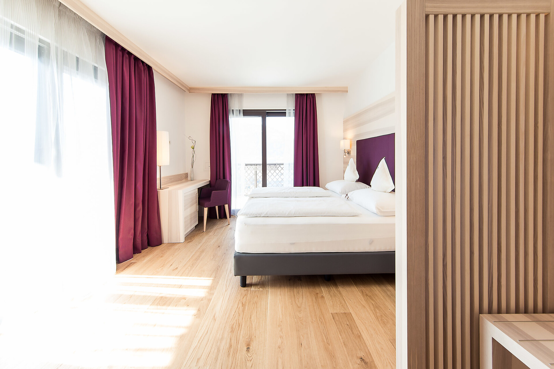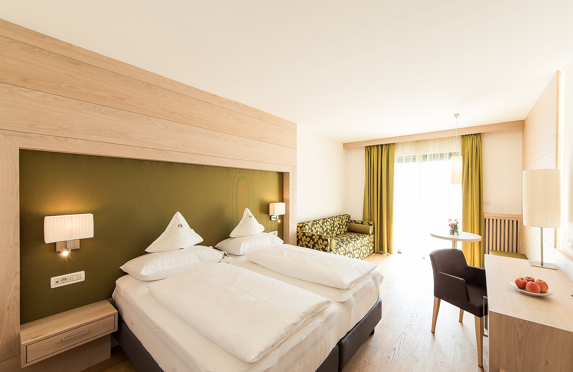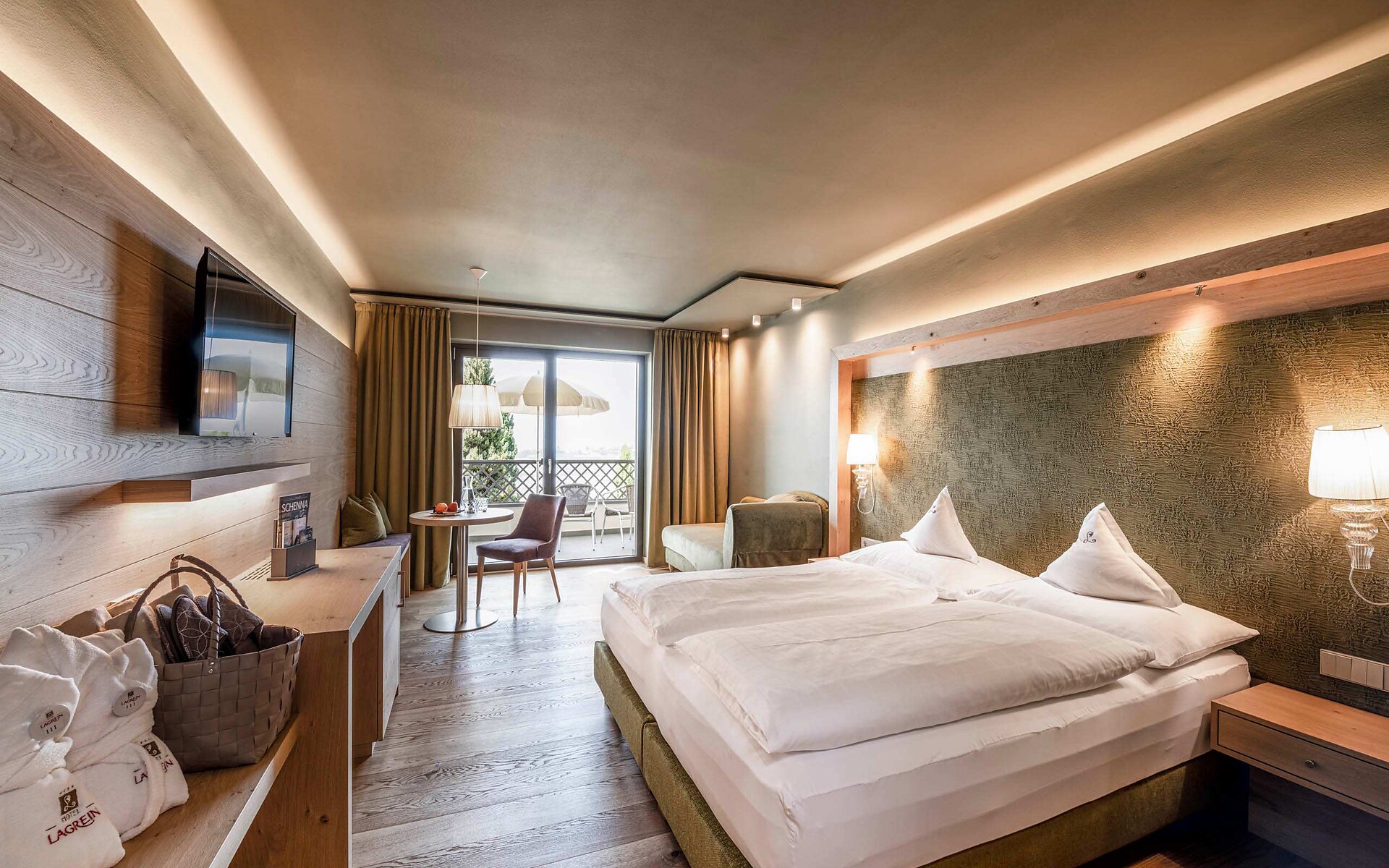 ca. 28 m² - Le accoglienti camere doppie CIPRESSO sono state rinnovate completamente con pregiati pavimenti in legno e conquistano ora con caldi toni naturale oppure con arredi in legno di rovere chiaro. Esse dispongono di TV a schermo piatto, cassaforte, telefono, radio, bagno con doccia, WC, alcune con bidet, asciugacapelli, specchio cosmetico, connessione Wi-Fi gratuita, balcone lato est con vista sui frutteti (lato strada), arredato con mobili da esterno; aria condizionata