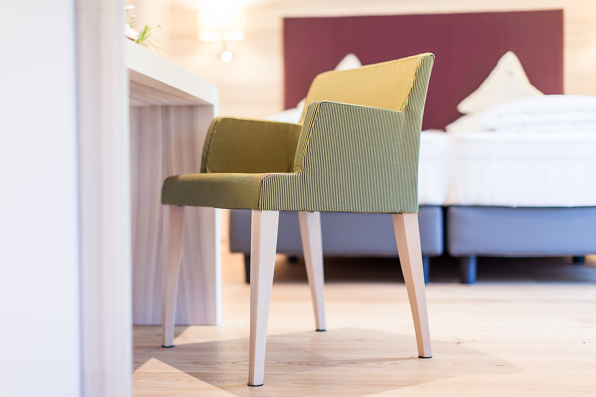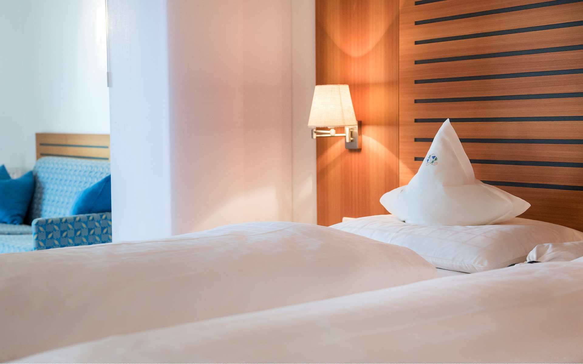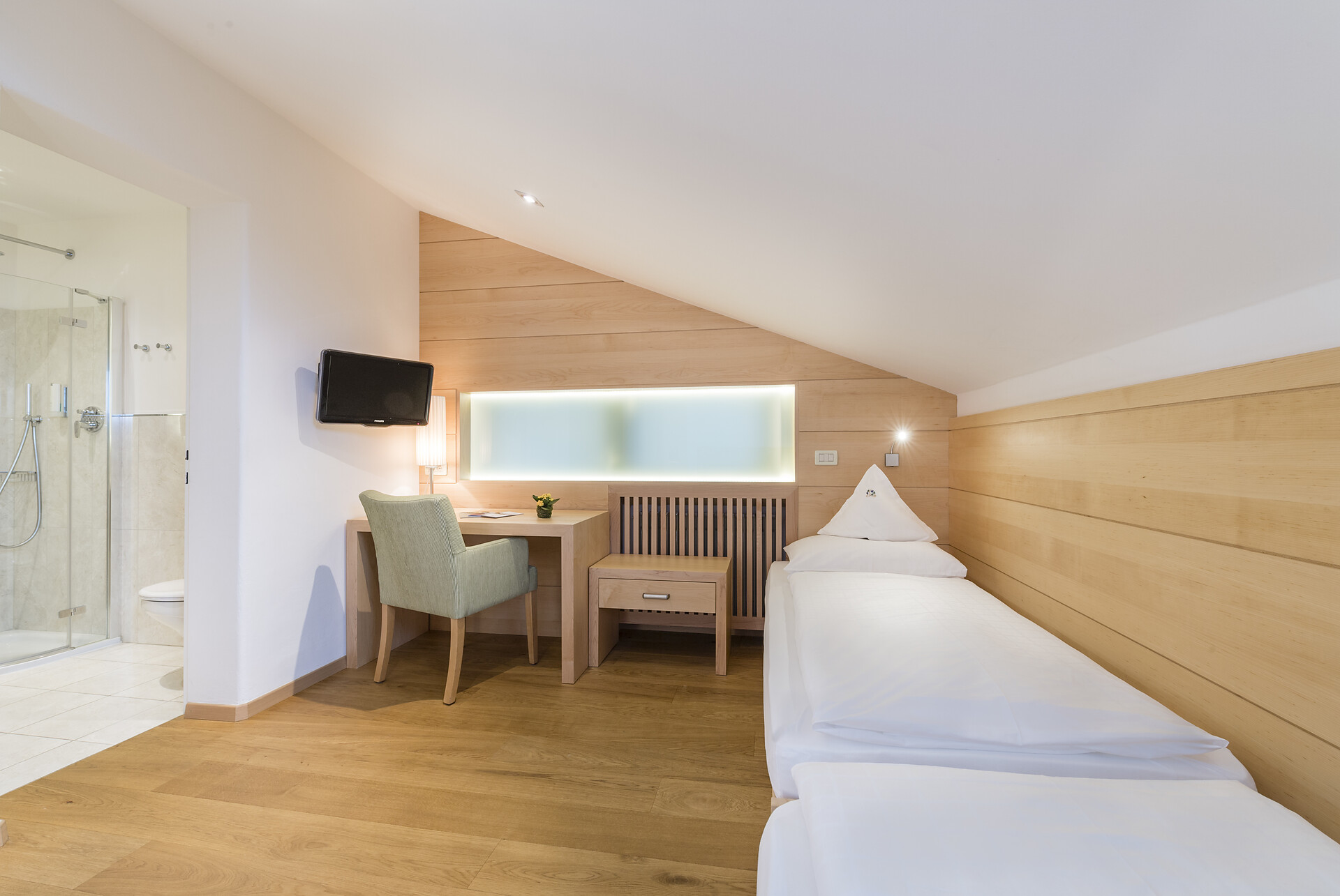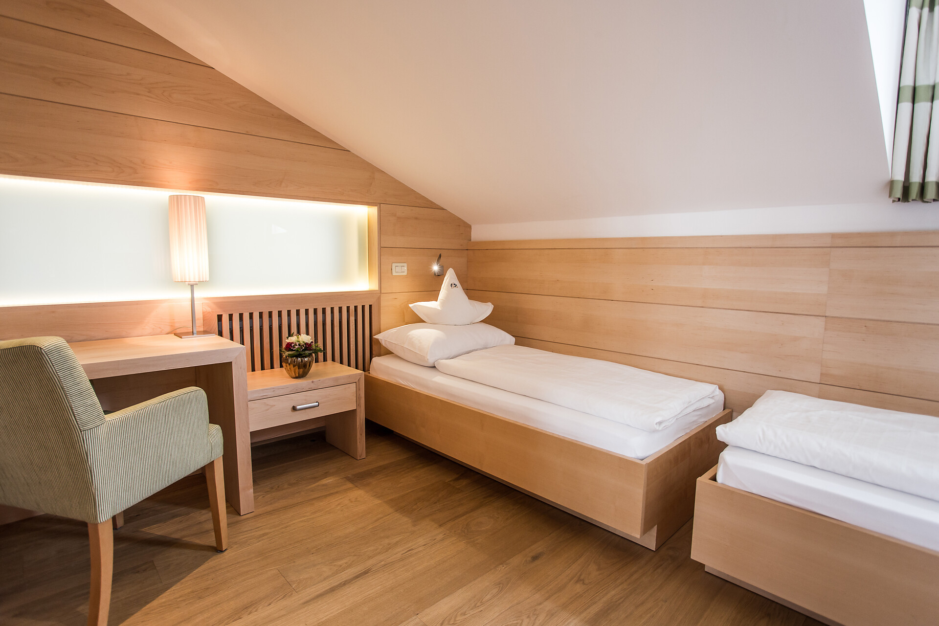 ca. 28 m² - Le accoglienti camere doppie CIPRESSO sono state rinnovate completamente con pregiati pavimenti in legno e conquistano ora con caldi toni naturale oppure con arredi in legno di rovere chiaro. Esse dispongono di TV a schermo piatto, cassaforte, telefono, radio, bagno con doccia, WC, alcune con bidet, asciugacapelli, specchio cosmetico, connessione Wi-Fi gratuita, balcone lato est con vista sui frutteti (lato strada), arredato con mobili da esterno; aria condizionata