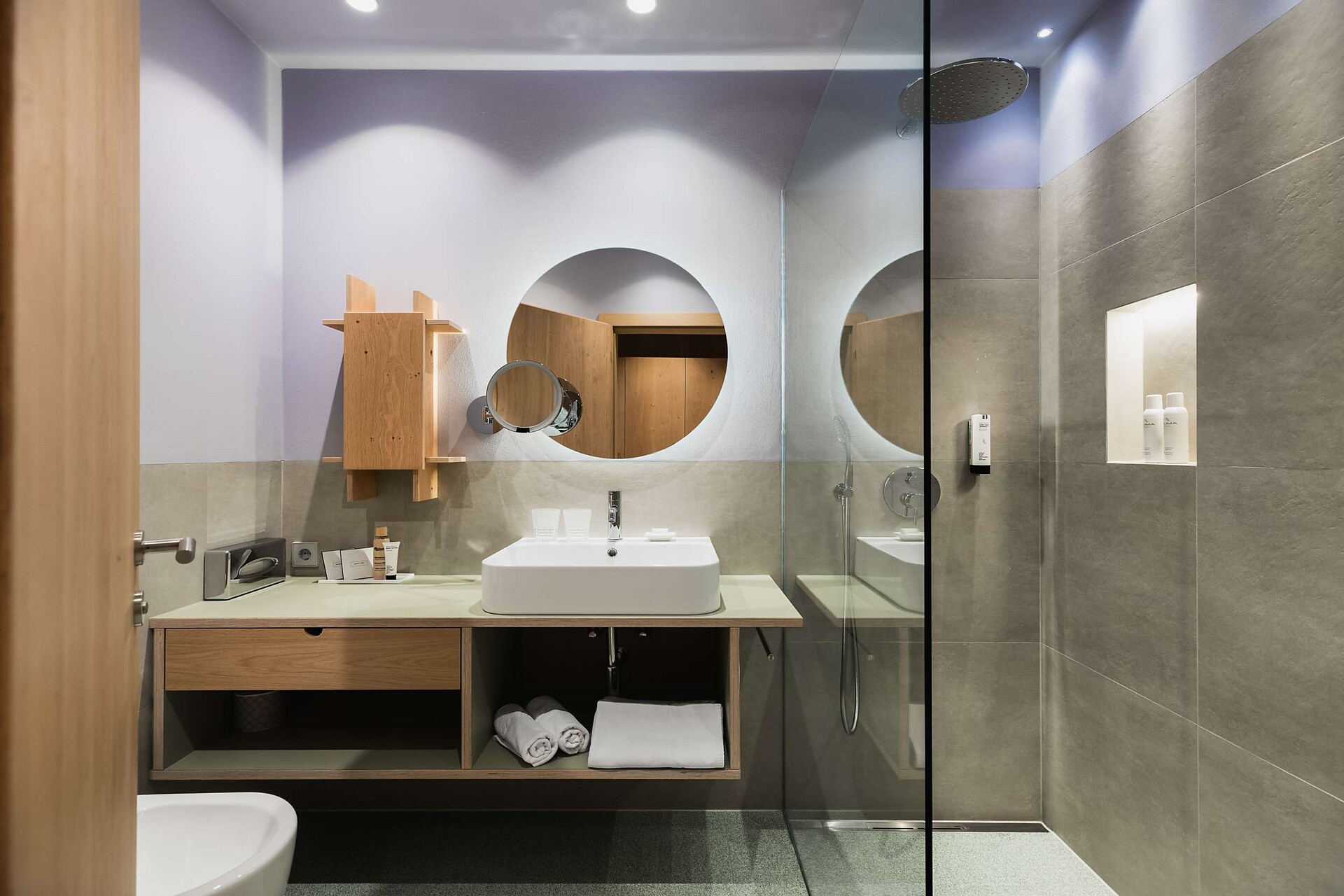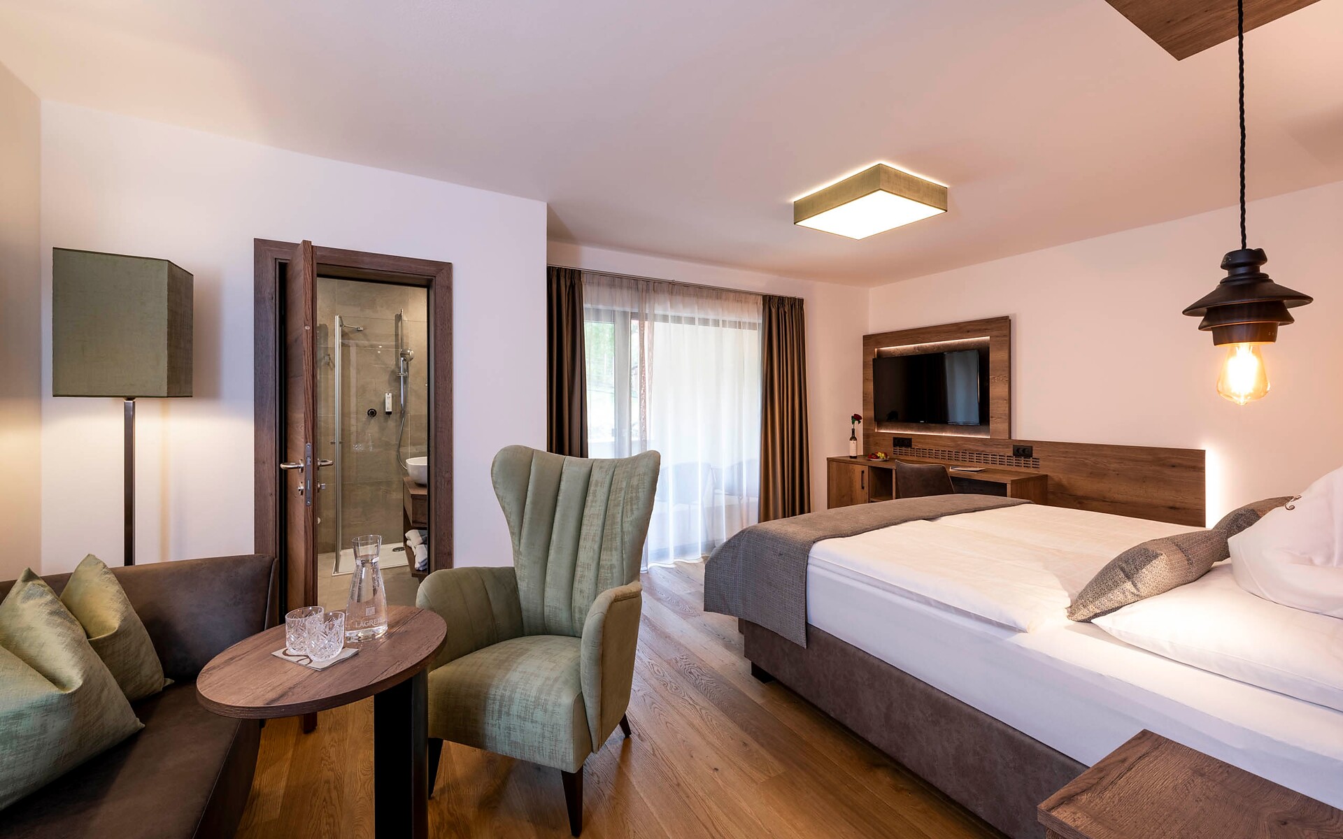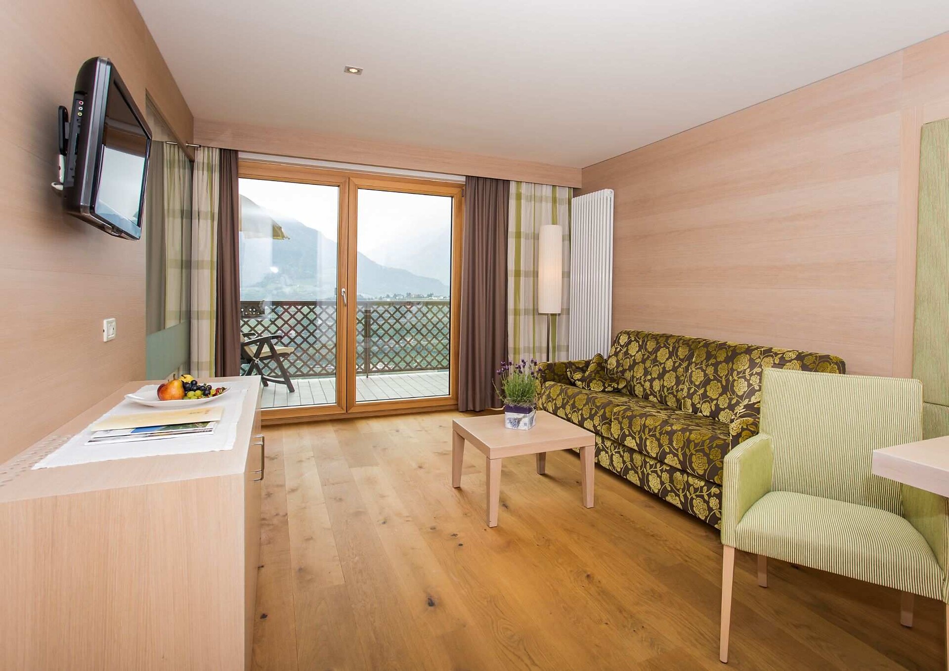 ca. 55 m² - Le meravigliose suite LIMETTA in legno di rovere con armoniche tonalità verde e caffè dispongono di una confortevole zona soggiorno con comodo tavolo ad angolo, divano, TV a schermo piatto, telefono, radio, cassaforte, minibar, ampio bagno con doccia e vasca da bagno, lavabo doppio, WC, bidet, asciugacapelli, specchio cosmetico e connessione WiFi gratuita. Il grande e soleggiato balcone esposto a sud ovest offre una vista mozzafiato sulle montagne circostanti e su tutta Merano.