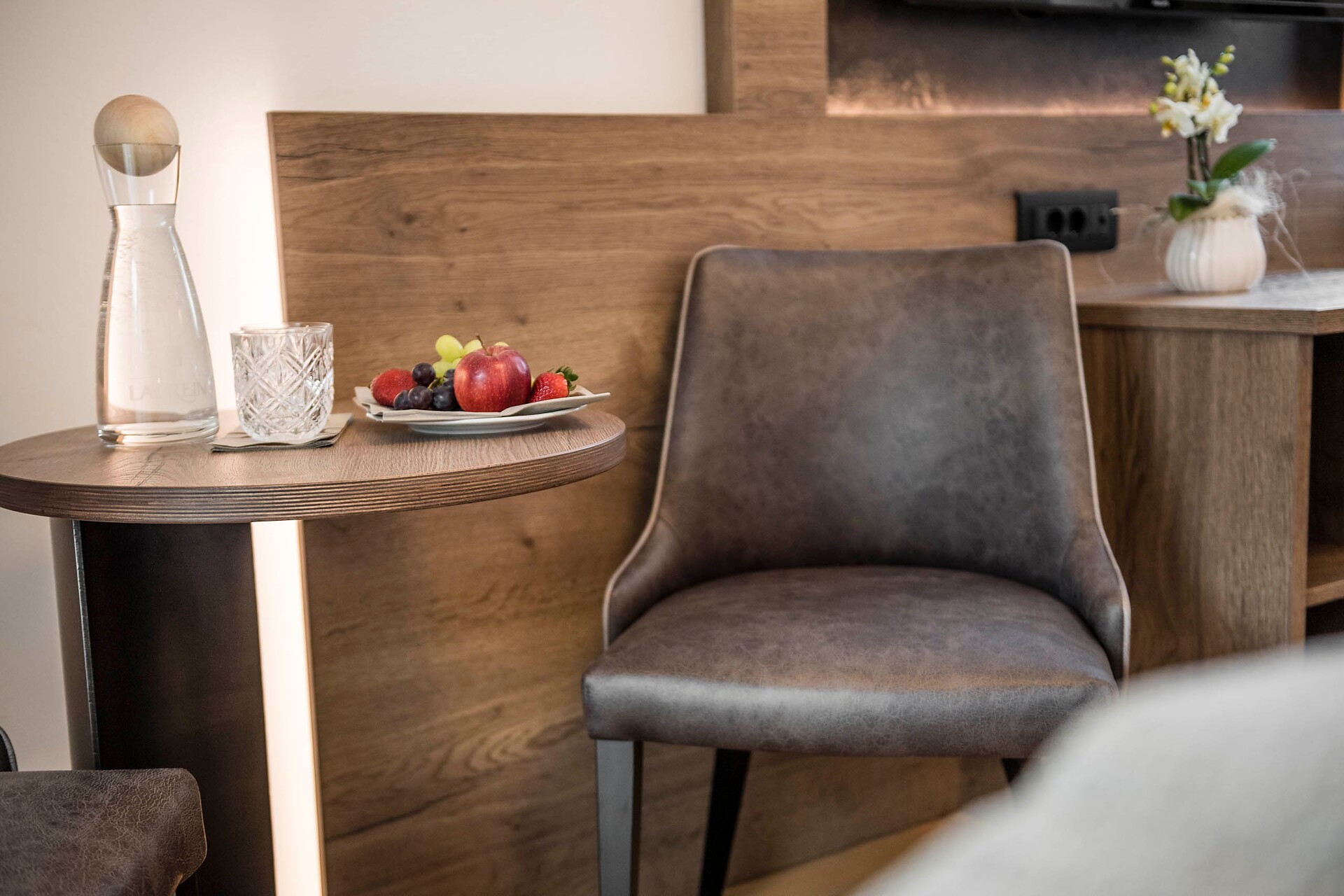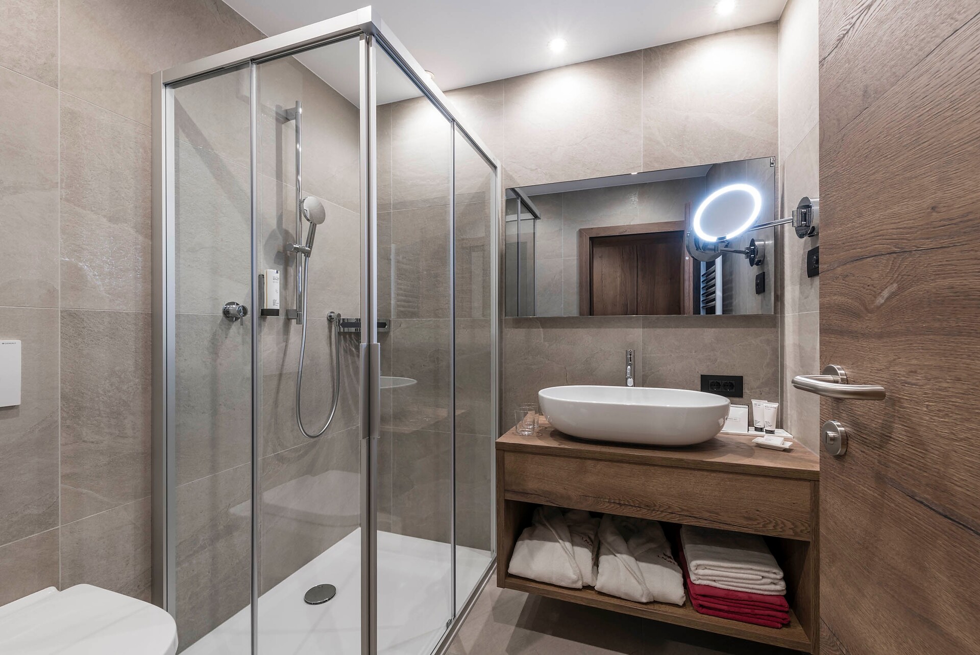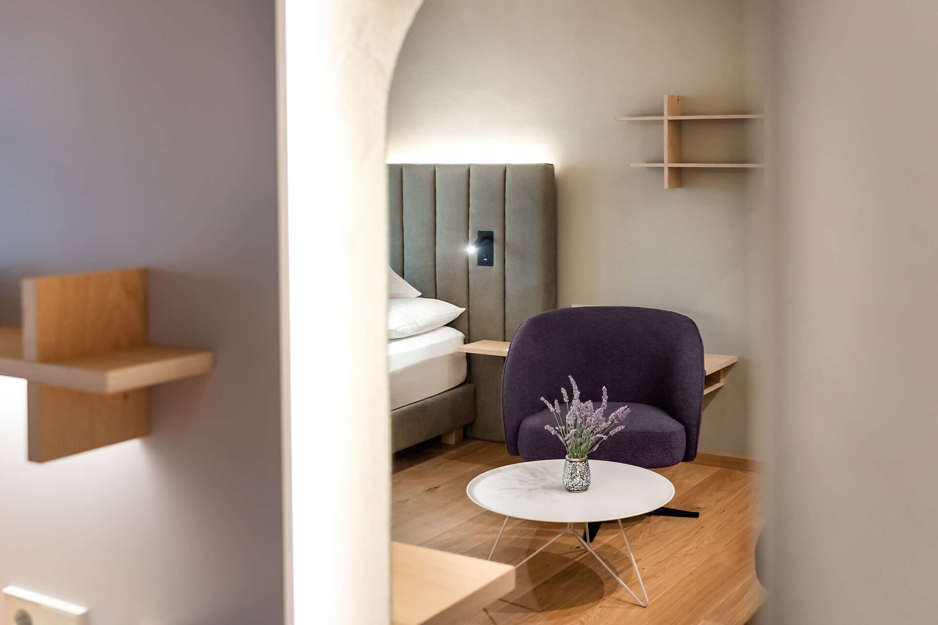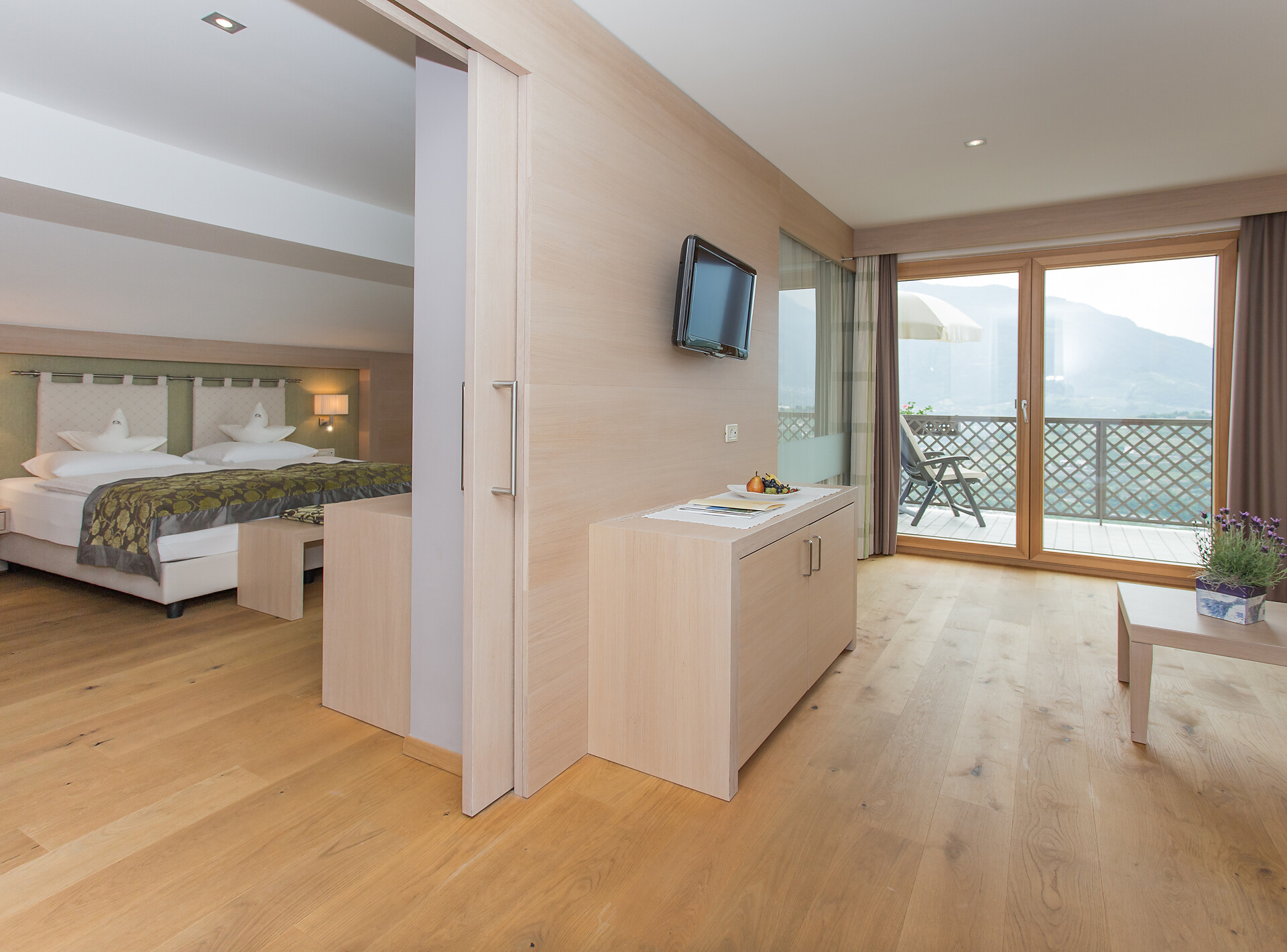 ca. 65 m² - La meravigliosa Suite 335 è arredata con grande eleganza in legno di quercia e materiali naturali splendidi. La camera da letto può essere separata dalla zona giorno da una porta scorrevole, rendendola ideale per le famiglie con un massimo di due bambini. La suite dispone di un bagno con doccia, bidet e WC, nonché di un secondo bagno con vasca, WC, bidet, asciugacapelli e specchio per il trucco. Si trova all'ultimo piano ed è dotata di un ampio balcone soleggiato esposto a sud-ovest con una vista mozzafiato sulle montagne circostanti e sulla zona di Merano. Questa accogliente suite offre ampio spazio per una vacanza di relax perfetta.