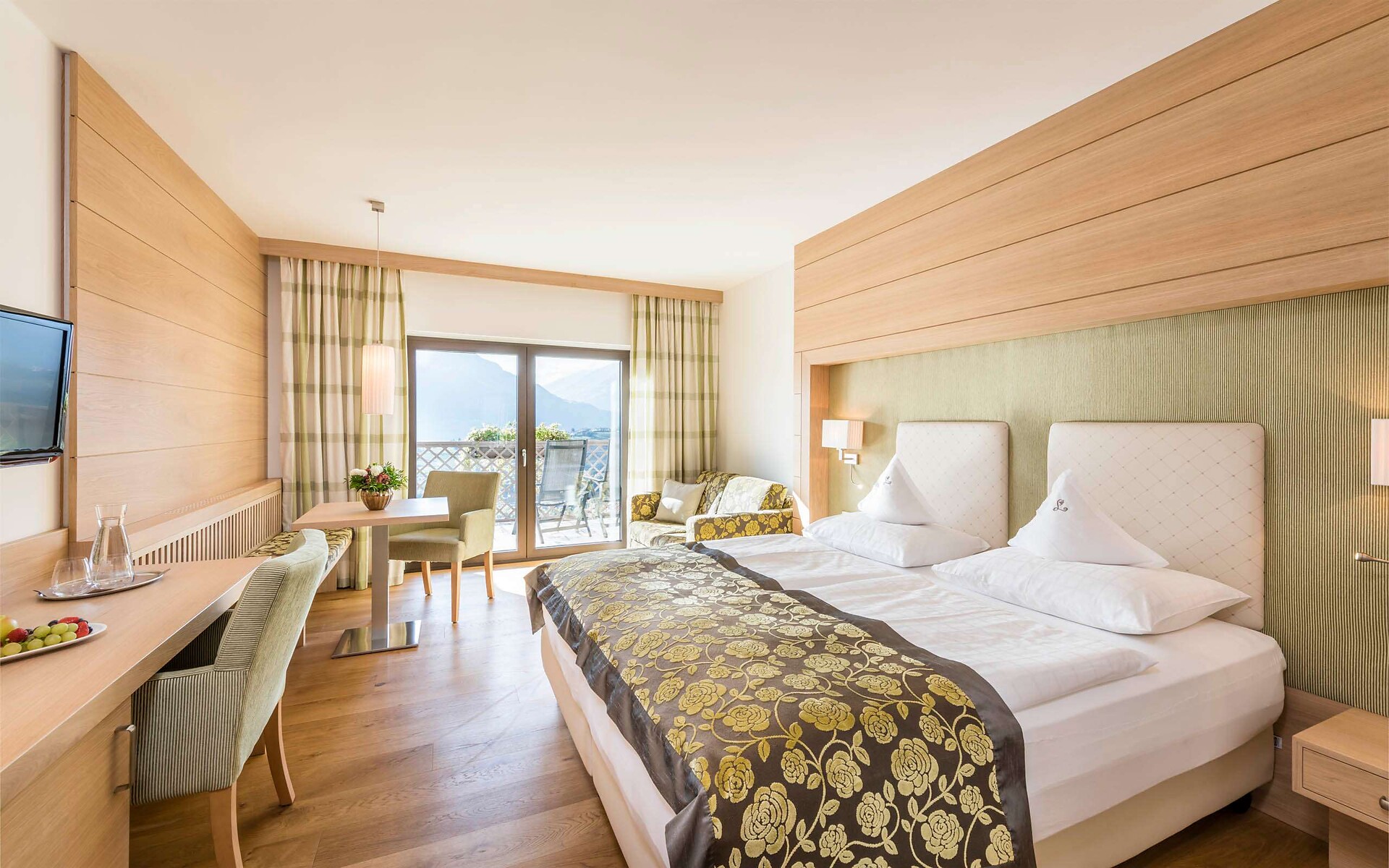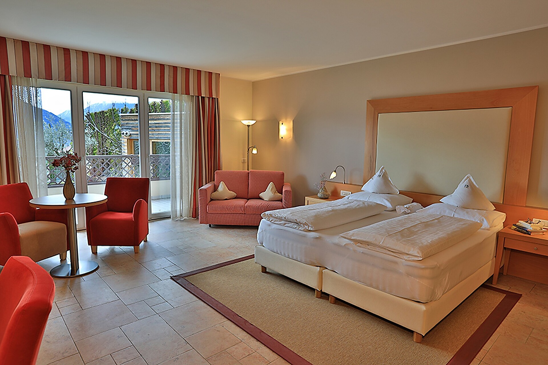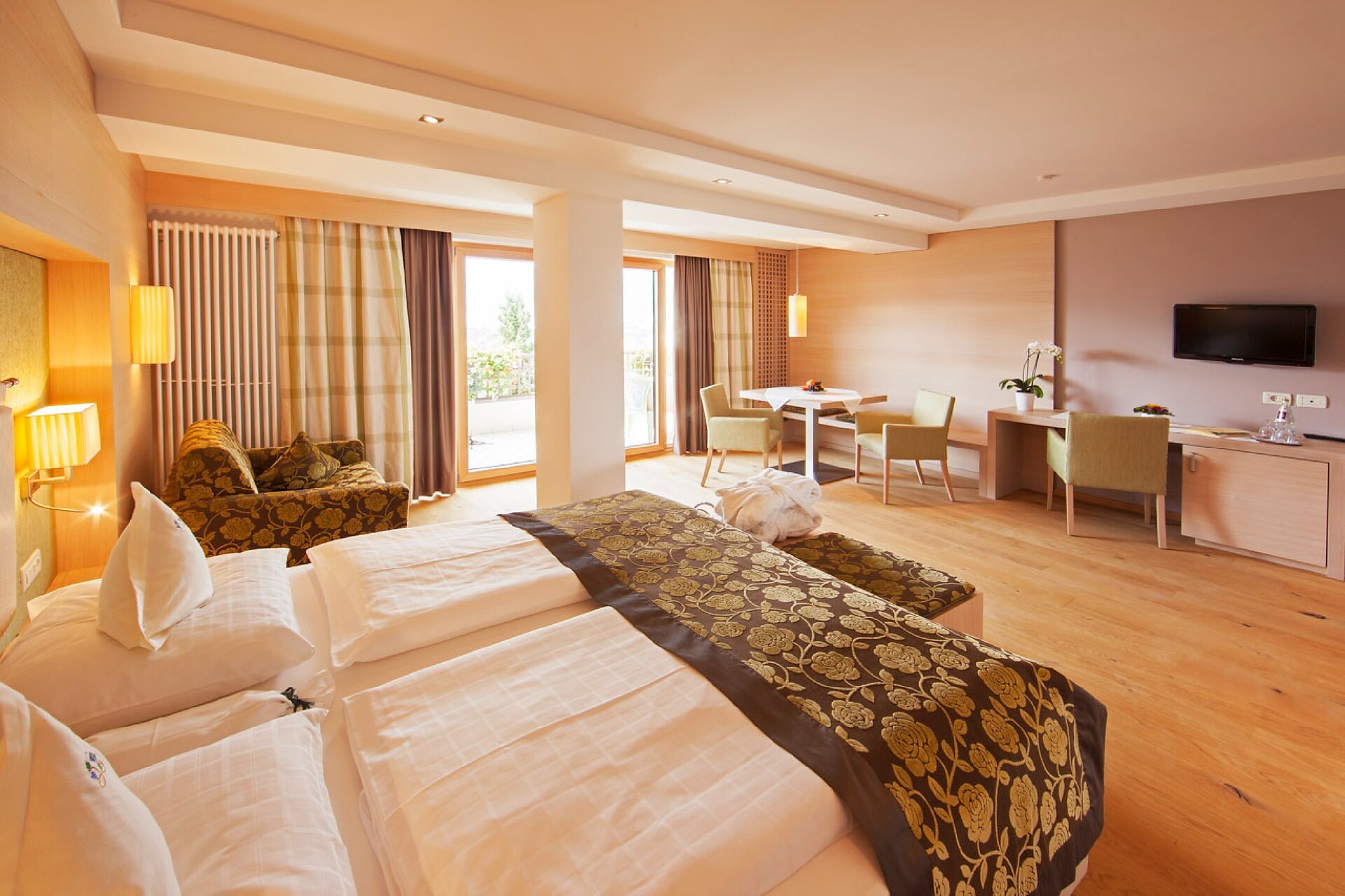 ca. 40 m² - Le romantiche suite GIRASOLE nell’esclusivo ambiente in legno di quercia e le fini tonalità rosso e moca offrono un livello di confort ineguagliabile. Dispongono di pavimento in legno, comodo angolo soggiorno in stile, TV a schermo piatto, cassaforte, telefono, radio, frigorifero, bagno con doccia, lavabo doppio, asciugacapelli, specchio cosmetico, WC e bidet separati e connessione Wi-Fi gratuita. Grazie al balcone panoramico, le suite offrono una vista mozzafiato integrale su tutta Merano e le circostanti montagne altoatesine (lato giardino).