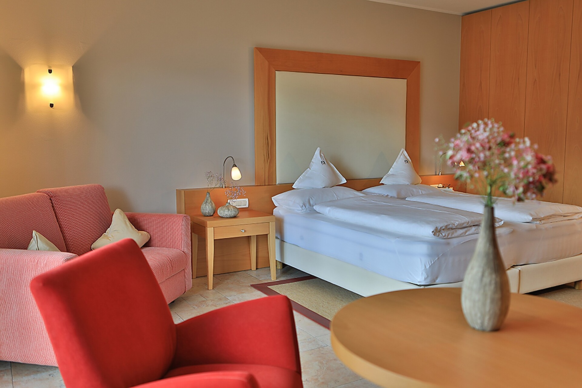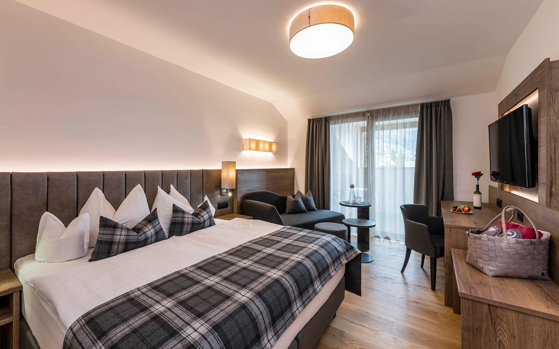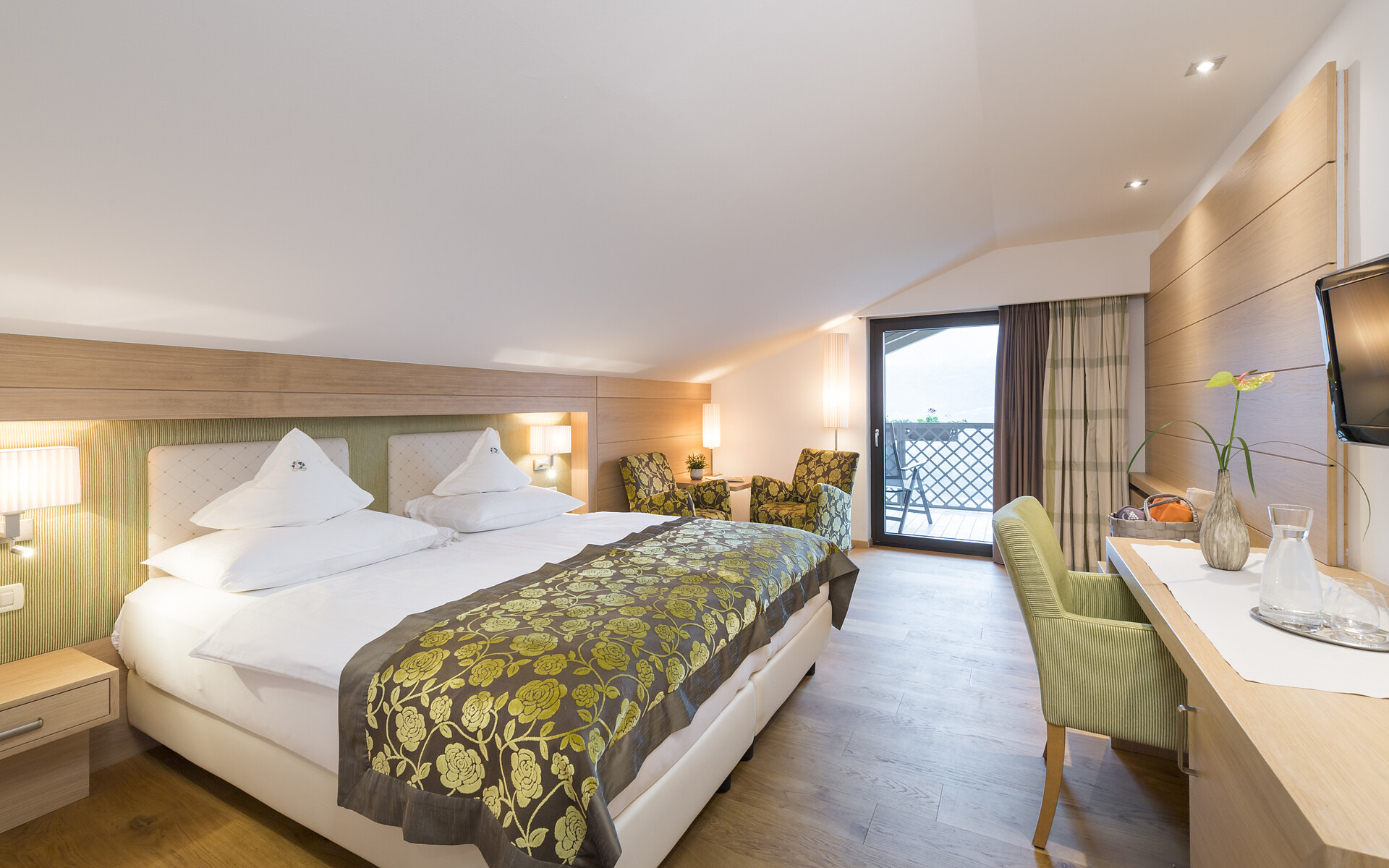 ca. 40 m² - Le romantiche suite GIRASOLE nell’esclusivo ambiente in legno di quercia e le fini tonalità rosso e moca offrono un livello di confort ineguagliabile. Dispongono di pavimento in legno, comodo angolo soggiorno in stile, TV a schermo piatto, cassaforte, telefono, radio, frigorifero, bagno con doccia, lavabo doppio, asciugacapelli, specchio cosmetico, WC e bidet separati e connessione Wi-Fi gratuita. Grazie al balcone panoramico, le suite offrono una vista mozzafiato integrale su tutta Merano e le circostanti montagne altoatesine (lato giardino).