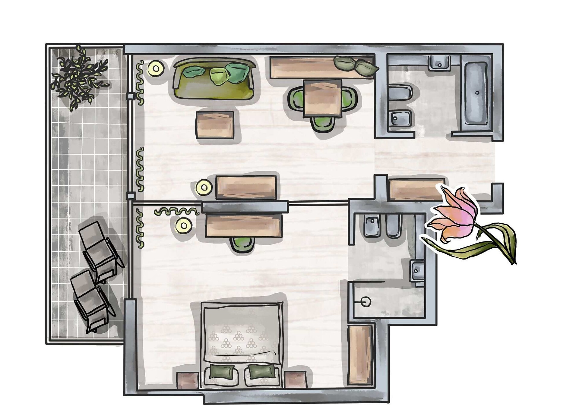 ca. 55 m² - Le meravigliose suite NINFEA in legno di larice, impreziosite dall’armonia delle tonalità che le contraddistinguono, offrono, con la comoda zona soggiorno, divano, TV a schermo piatto, cassaforte, telefono, radio, frigorifero, generoso bagno con doccia e vasca da bagno, lavabo doppio, WC, bidet, asciugacapelli, specchio cosmetico, aria condizionata, connessione Wi-Fi gratuita, tutti i confort di una vacanza rilassante e di lusso. Le accoglienti suite dispongono di un grande balcone esposto a sud ovest con affascinante vista panoramica su tutta Merano e le montagne circostanti (lato giardino).