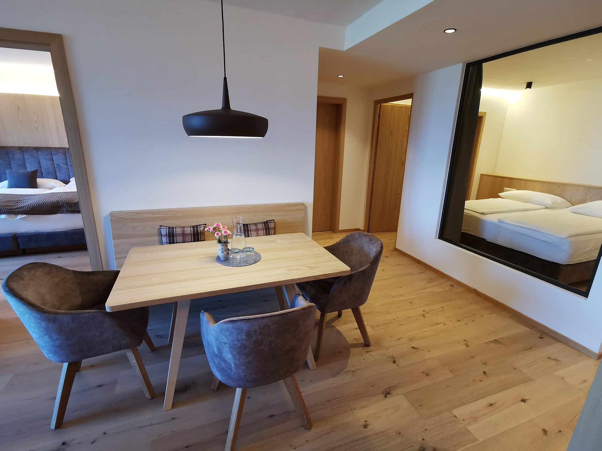 Una vacanza in due, in quattro o in sei – nel nostro “rifugio” potrete godervi una vacanza rilassante insieme a famiglia ed amici in un ambiente che si compone di due ampie camere da letto con un soggiorno spazioso e due bagni. E più tardi la sera, dopo una gustosa cena, potrete rilassarvi giocando a carte insieme ai vostri cari nella veranda, il vostro secondo soggiorno. • Cucina completamente attrezzata con lavastoviglie, frigo con comparto ghiaccio, forno, tostapane, moka, macchina per caffè americano, bollitore e stoviglie per mangiare e cucinare • Macchina da caffè 4 in 1 per caffè macinato, cialde ESE, capsule Dolce Gusto e Nespresso • 2 bagni con WC, bidet, doccia a filo pavimento, scaldasalviette, fon, prodotti per la cura e l’igiene • 1 camera da letto con letto king-size e parete divisoria di vetro verso il soggiorno, provvista di tende oscuranti • 1 camera da letto con letto king-size, secrétaire e vista sulla vallata • 30 mq di balcone vetrato panoramico con vista sulla vallata, 4 sedie, 2 lettini e 1 tavolo • Entrata di generose dimensioni con antica panca, specchio e guardaroba • 43” 4K TV a schermo piatto, telefono, gratis WI-FI con internet a fibra ottica • Soggiorno-cucina con divano estraibile • Accappatoi, teli da sauna e ciabatte • Finestre a tutta altezza • Riscaldamento a pavimento • Impianto di condizionamento • Stufa • Privo di barriere architettoniche