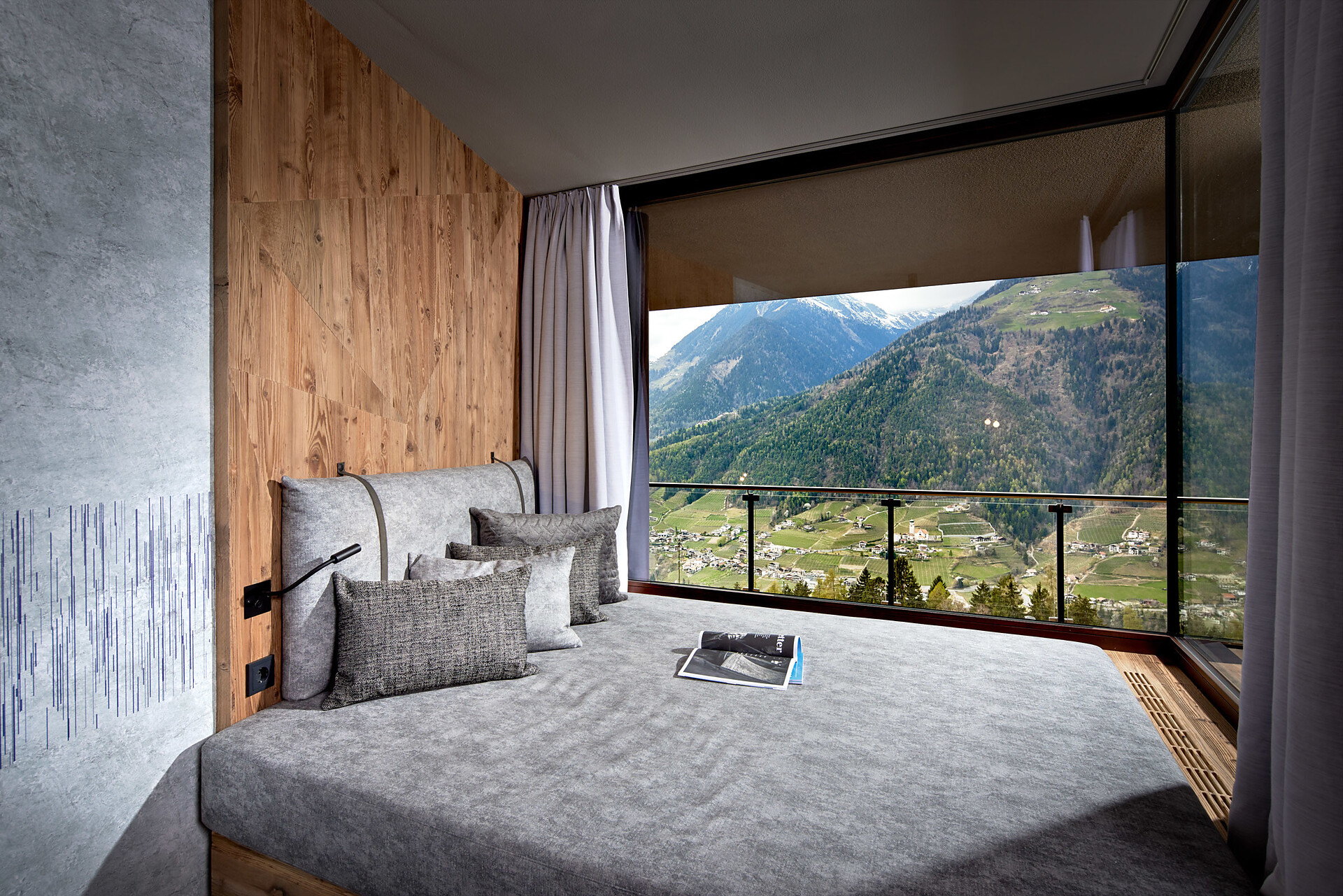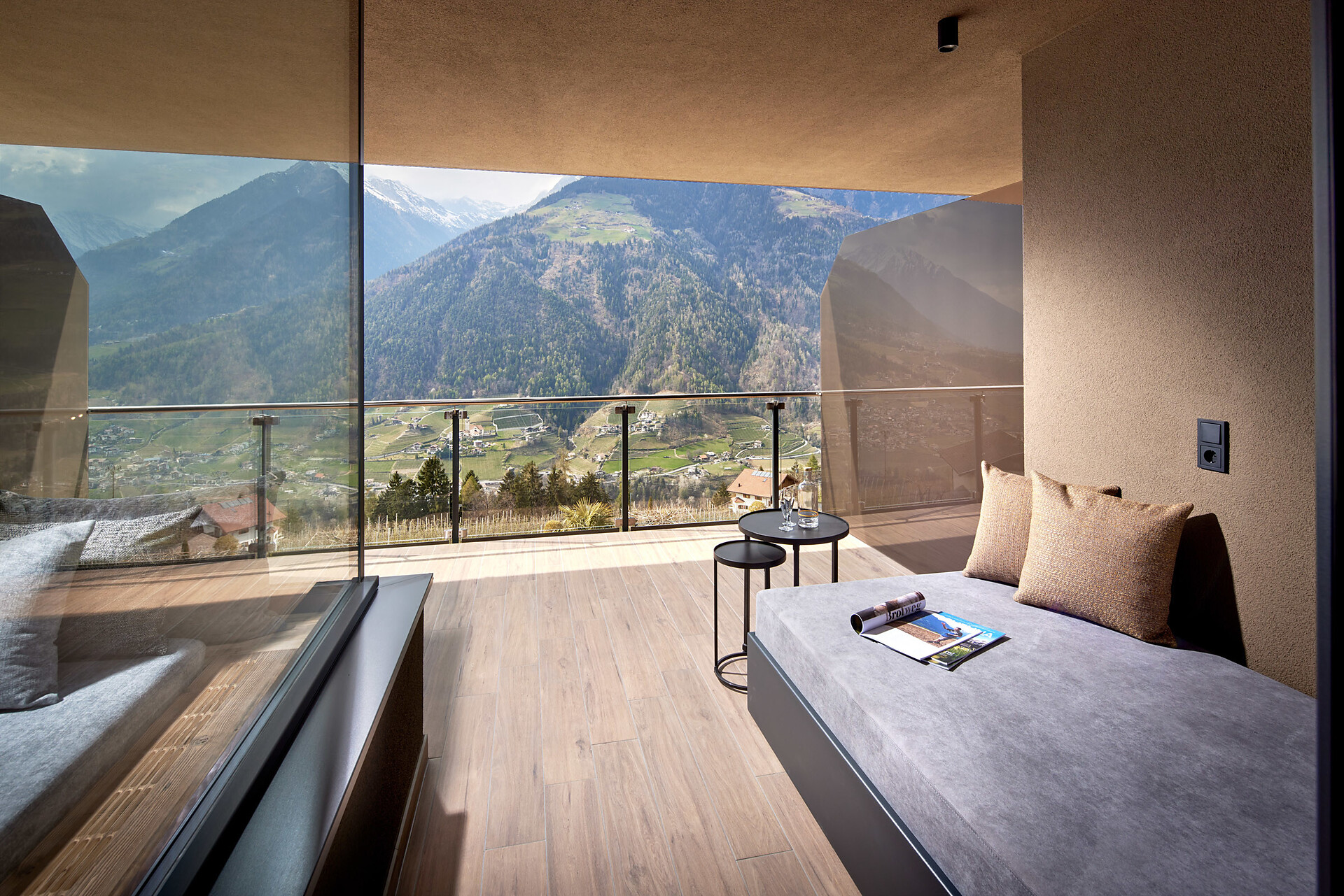 Suite "Sogno soleggiato wellness & spa" (ca. 36m²), non fumatori, aria condizionata, zona sogg., bagno e doccia, cabina ad raggi infrarossi Physiotherm, WC & bidet separati, fon, specchio cosmesi, telefono, safe, TV SAT-flat-screen, connessione Internet, frigobar, balcone sul lato valle con vista panoramica, giardino sul tetto con lettini relax, sauna panoramica finlandese e vasca d’idromassaggio esclusiva (l'idromassaggio può essere utilizzato dalle ore 08.30 alle ore 22.00). Cani non ammessi. Posto auto in garage incluso.