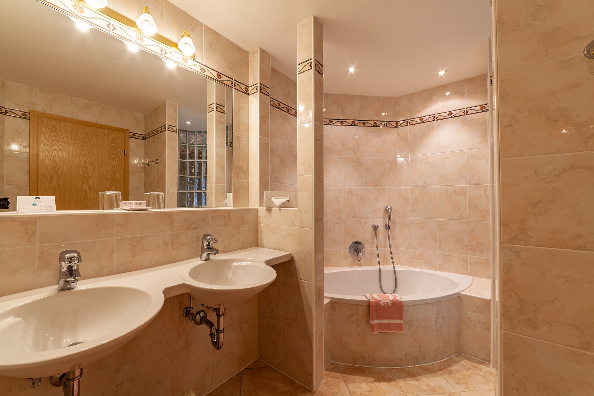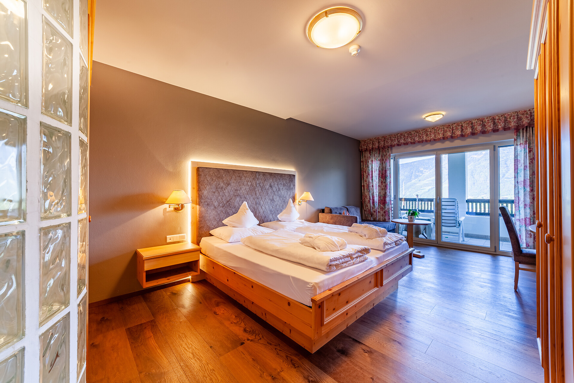 Camera con grande luminosità e ampio spazio, al pianterreno, terrazza con vista sul paese di Merano, telefono, TV satellitare, connessione Internet, accappatoi, minibar, cassaforte in camera, bagno con lavabo, asciugacapelli, specchio per il trucco, doccia e vasca da bagno, WC separato.