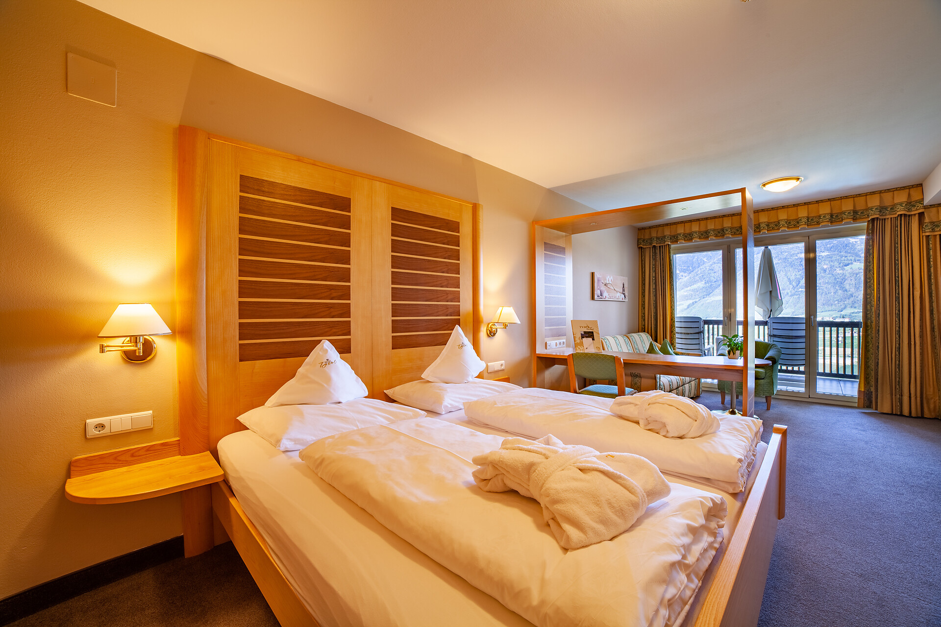 Camera doppia, Letto matrimoniale, Lettino , Divano letto, Terrazza, Minibar, Cassaforte, Doccia/bagno, WC separato, Fon, Accappatoio, TV, TV satellitare/via cavo, WLAN, Collegamento internet , Edificio principale, Vista panoramica, Lato sud