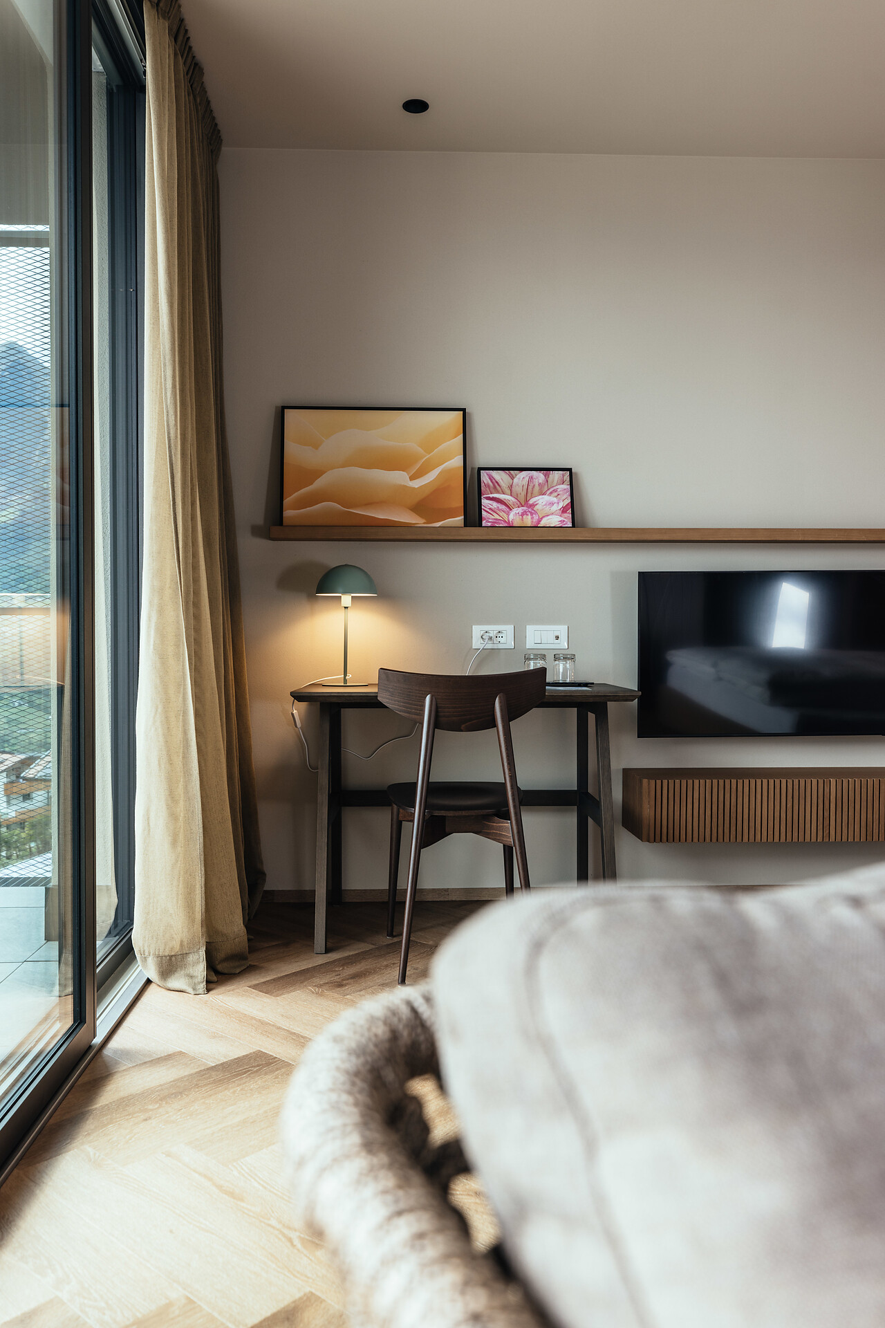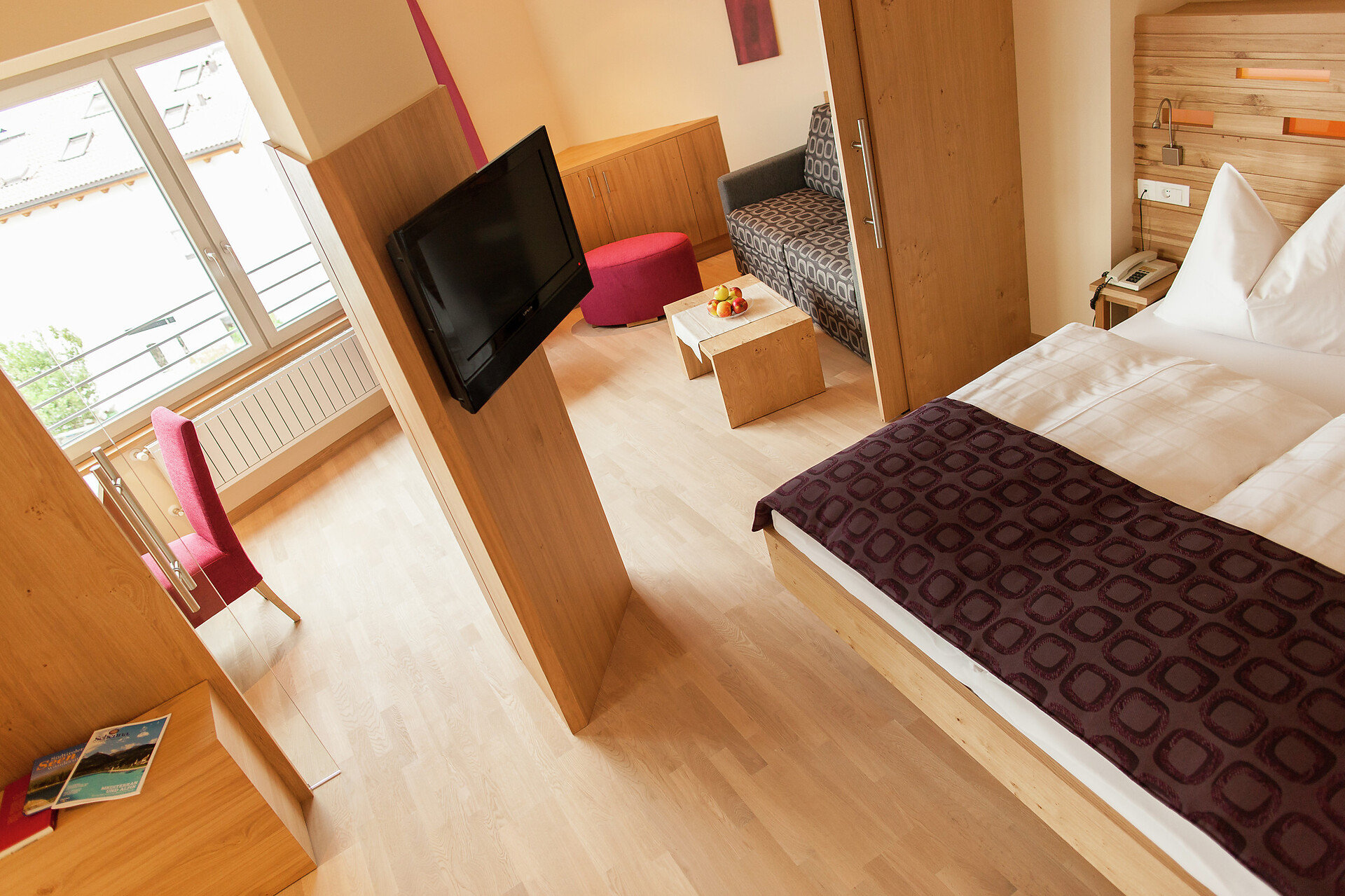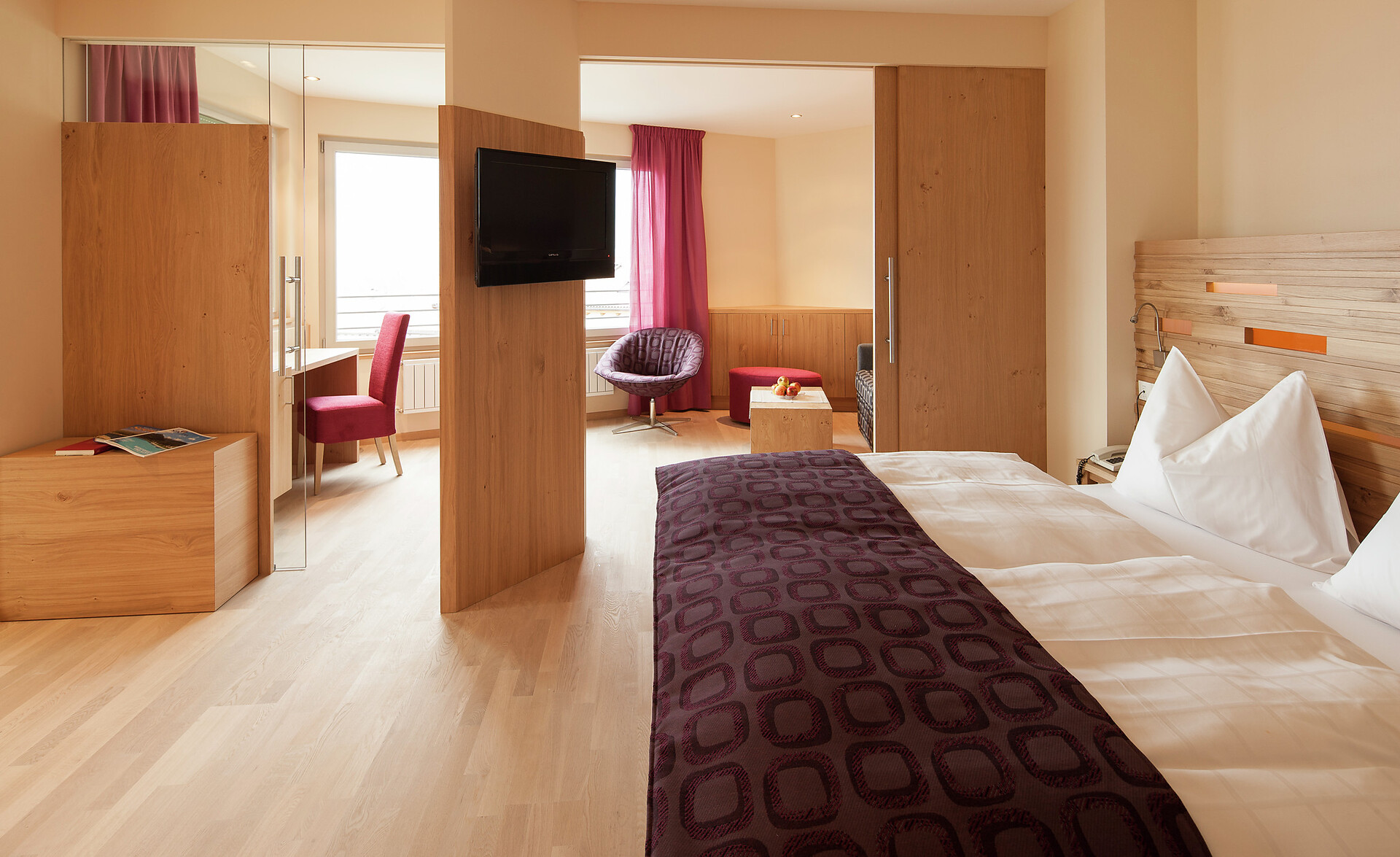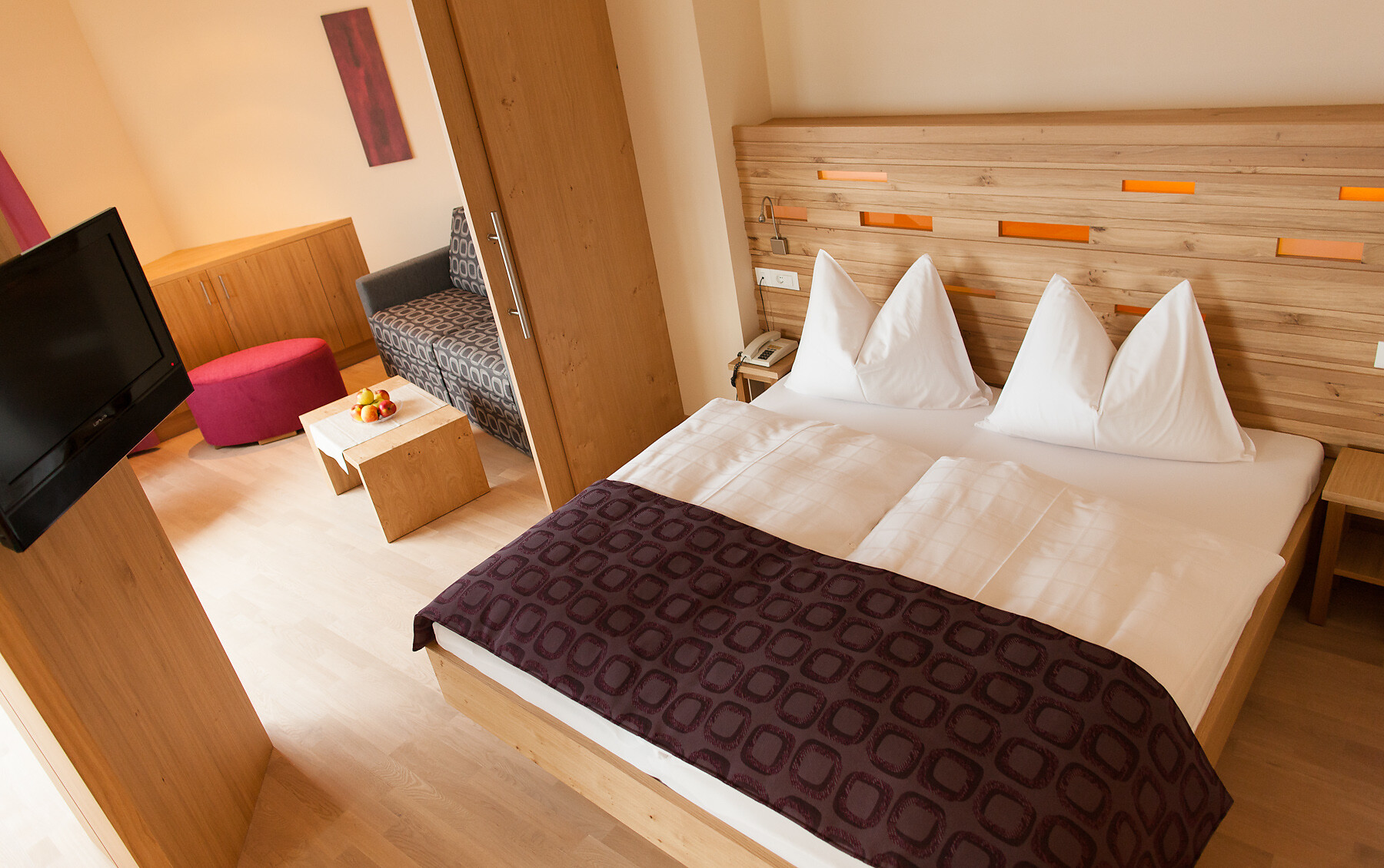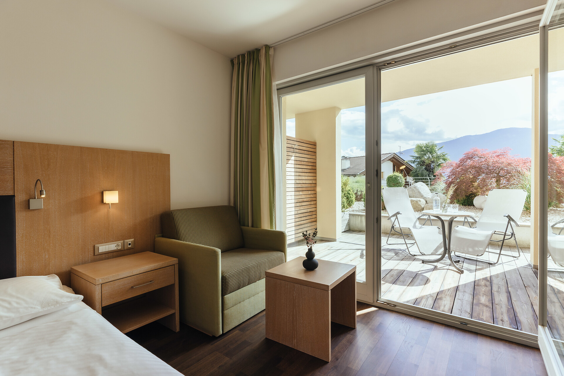 camera 24 m² con balconea sud 2. o 3. piano, doccia/WC, tv, telefono, camera non fumatori, pavimento in legno.