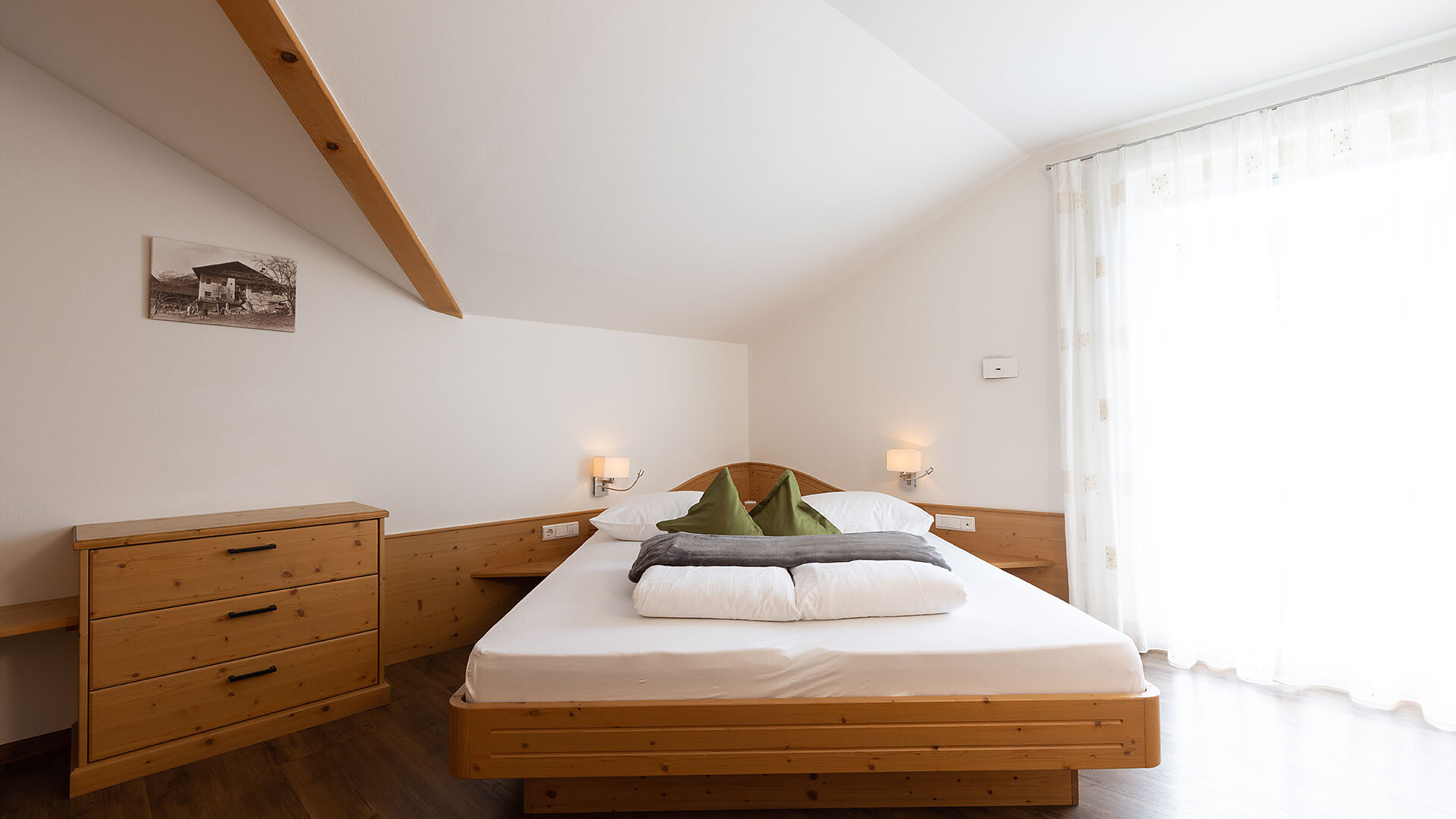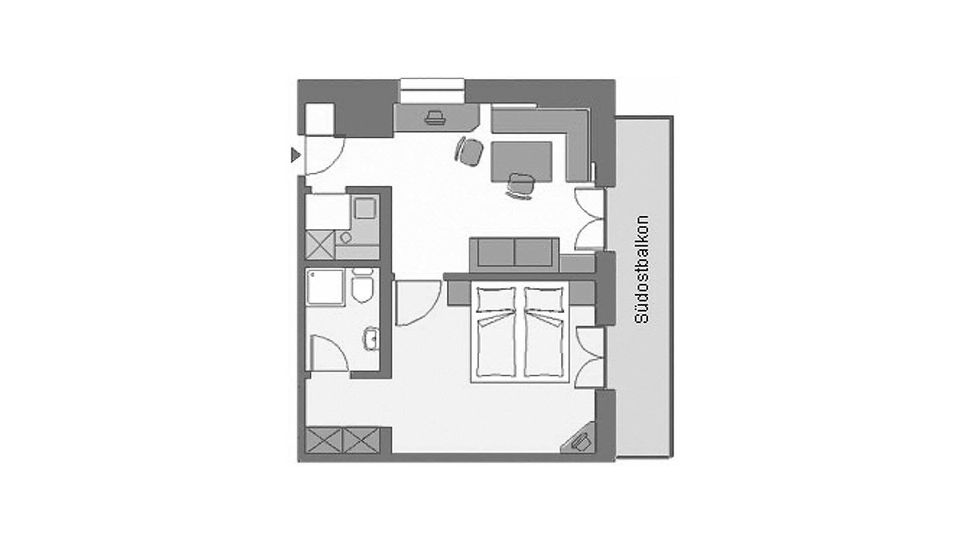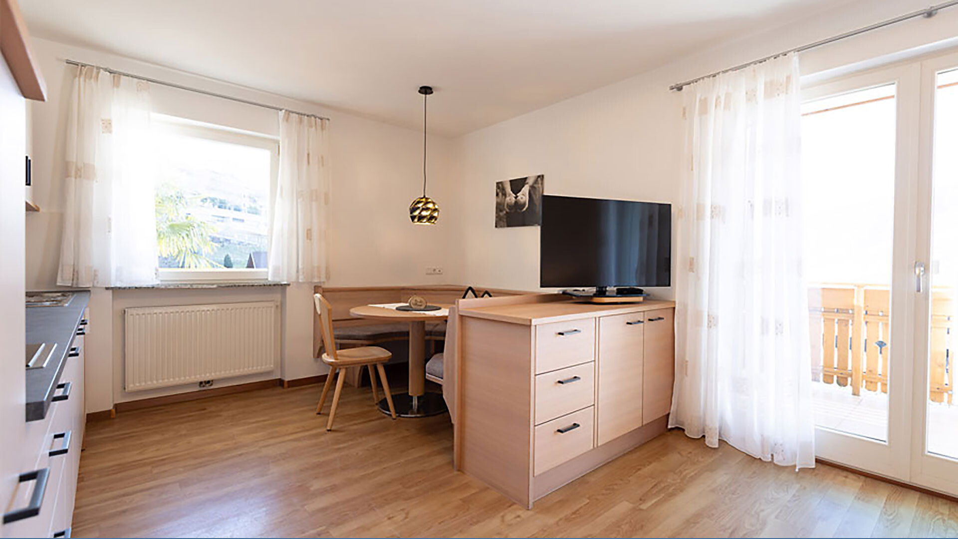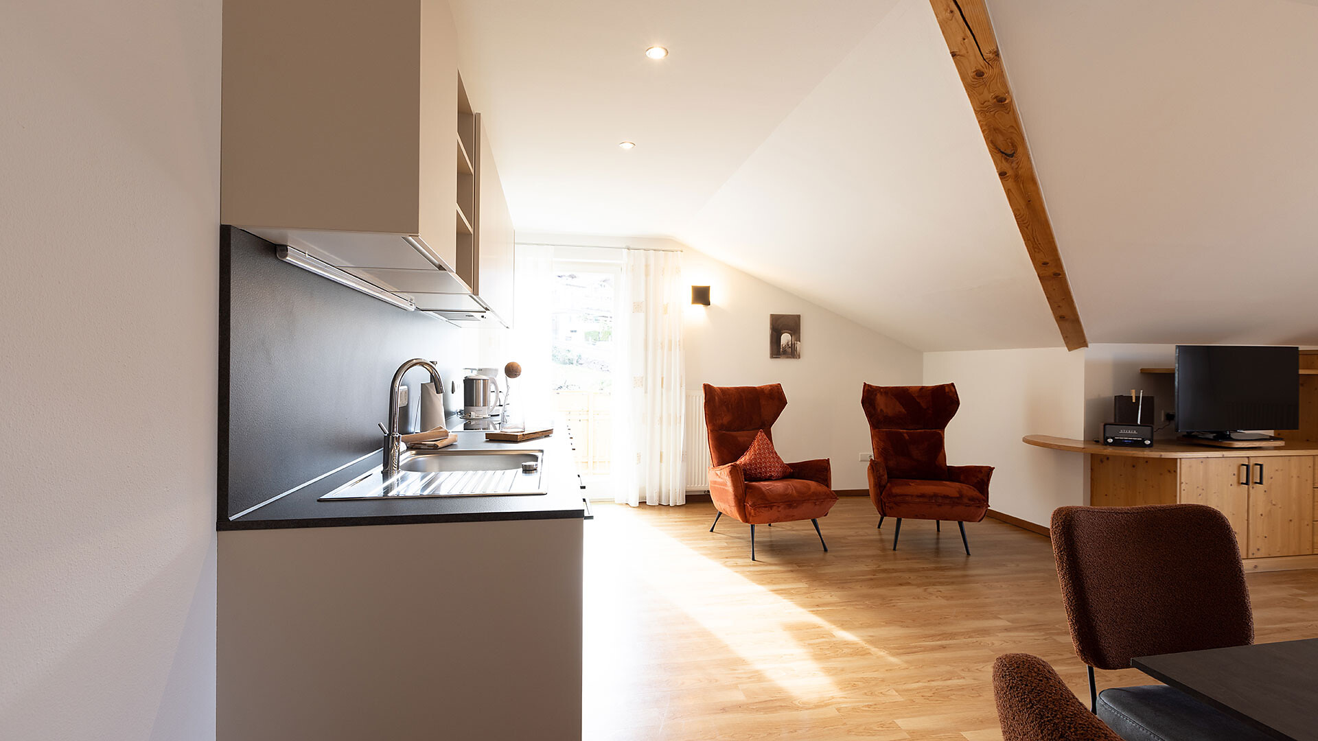 Appartamento ideale per 2-4 persone, dotato di camera matrimoniale, soggiorno con divano letto, cucina con lavastoviglie, bagno, cassaforte, asciugacapelli, telefono, radio, TV satellitare, WiFi. La terrazza rivolta a sud offre una vista panoramica su Merano e dintorni.