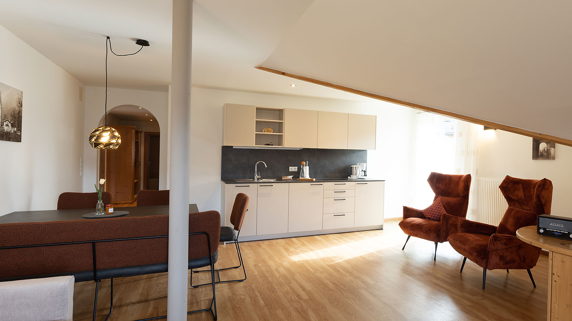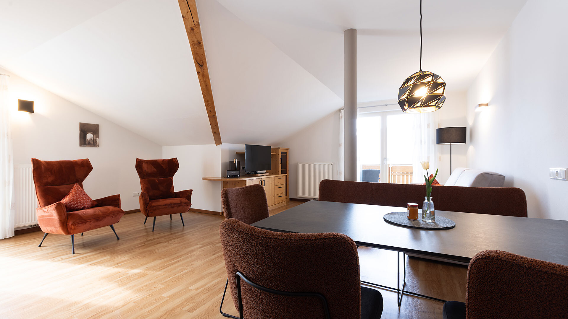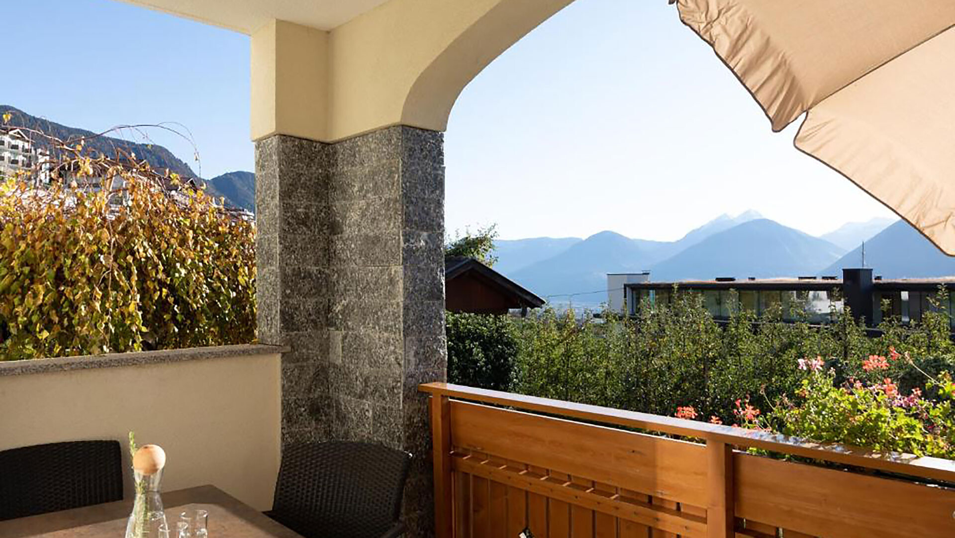 Appartamento ideale per 2-6 persone (84m²), dotato di 2 camere matrimoniali, ampio soggiorno con divano letto, cucina completamente arredata con lavastoviglie, bagno, asciugacapelli, cassaforte, telefono, radio e TV satellitare e con due balconi rivolti a sud e sudest con vista panoramica su Merano e dintorni. Novità dal 2026: secondo bagno.