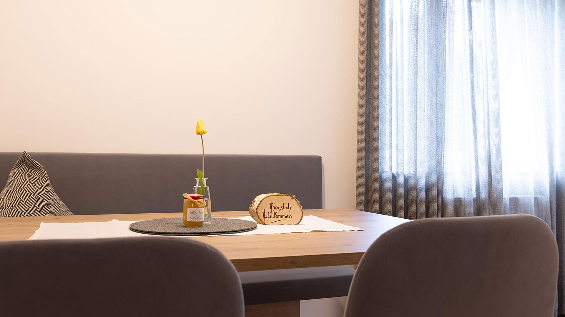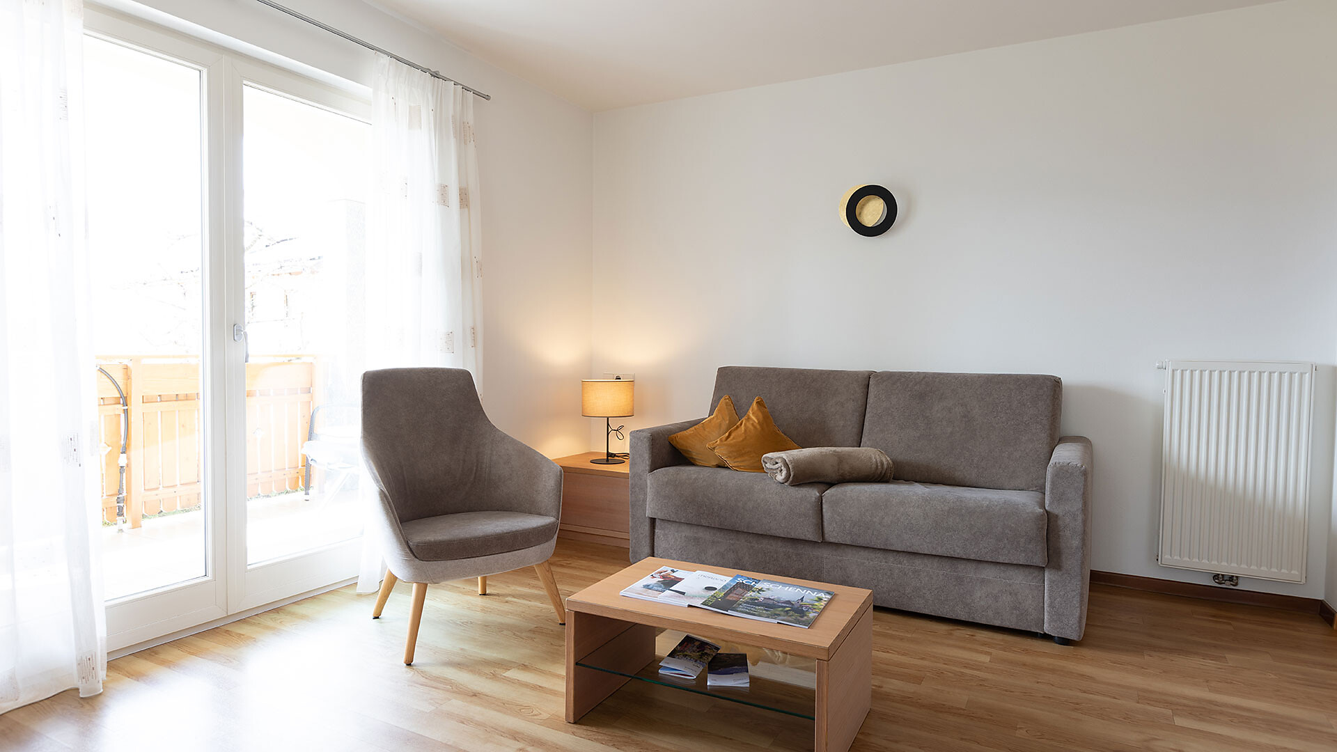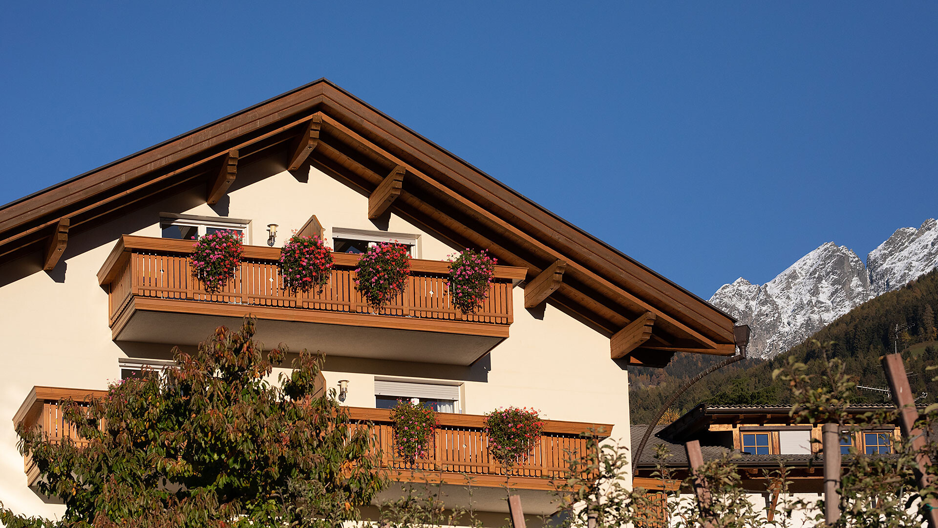 Appartamento ideale per 2-6 persone (84m²), dotato di 2 camere matrimoniali, ampio soggiorno con divano letto, cucina completamente arredata con lavastoviglie, bagno, asciugacapelli, cassaforte, telefono, radio e TV satellitare e con due balconi rivolti a sud e sudest con vista panoramica su Merano e dintorni. Novità dal 2026: secondo bagno.