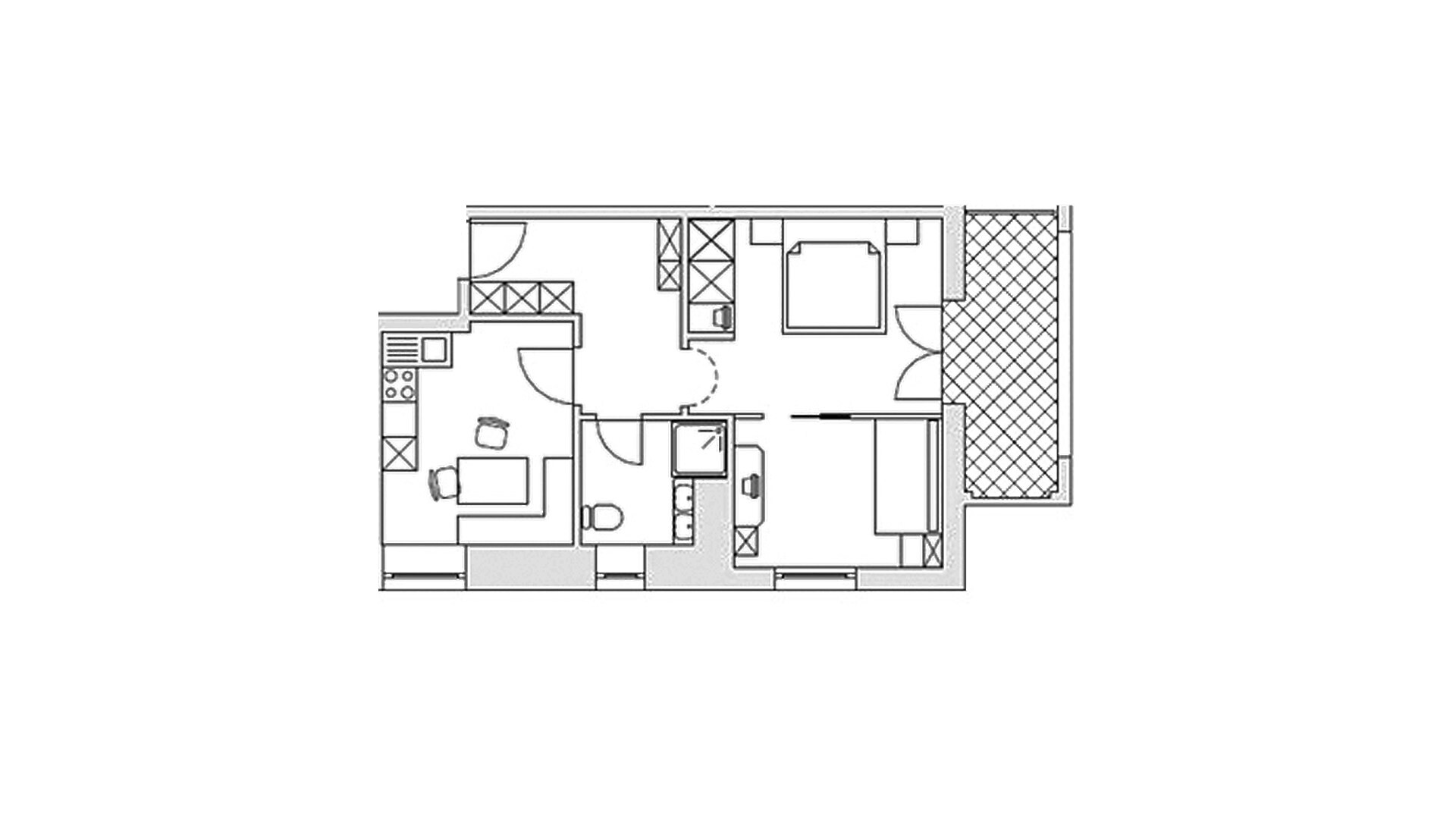 Appartamento (51 m²), ideale per 2-4 persone, dotato di camera matrimoniale sparata, soggiorno con divano letto, cucina con lavastoviglie, bagno, cassaforte, asciugacapelli, telefono, radio, TV satellitare, WiFi e con terrazza soleggiata rivolta a sud.