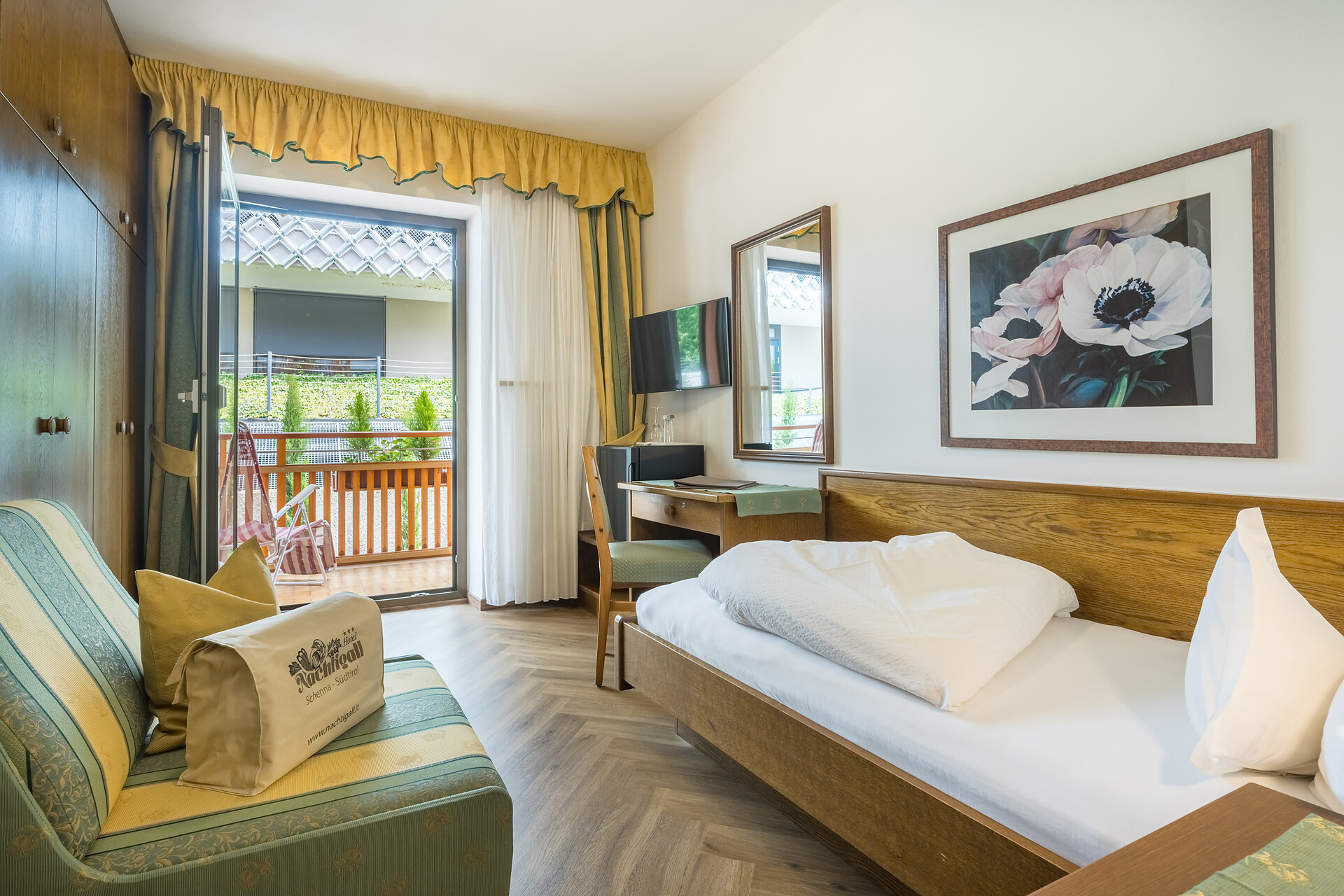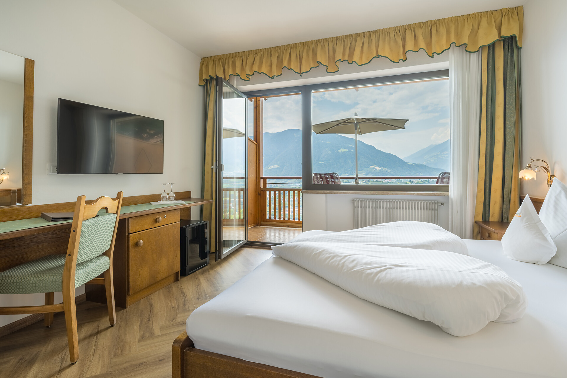 Accogliente camera doppia con balcone rivolto a sud-est (sul lato della casa), con bella vista su Merano, con doccia, WC, asciugacapelli, letto matrimoniale, piccola scrivania, radio, telefono, cassaforte, TV satellitare, arredamento mediterraneo