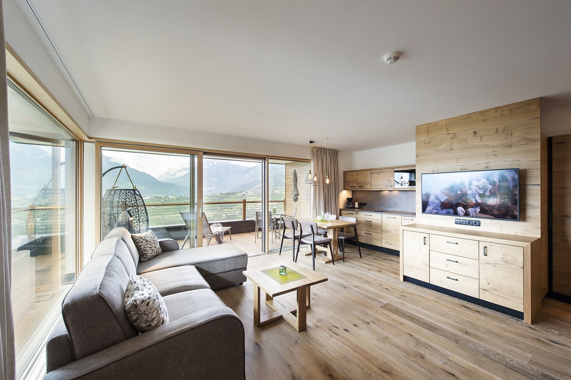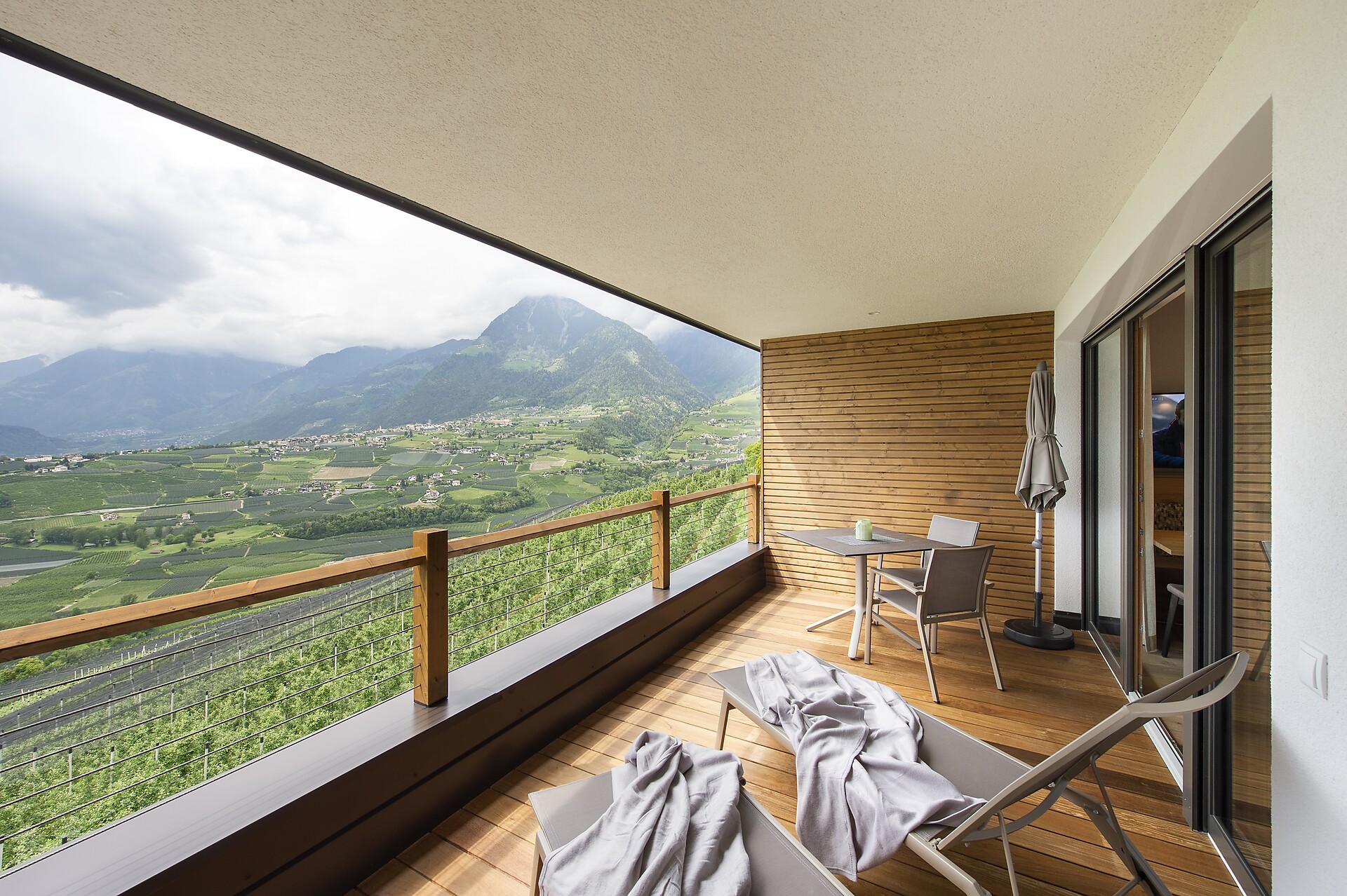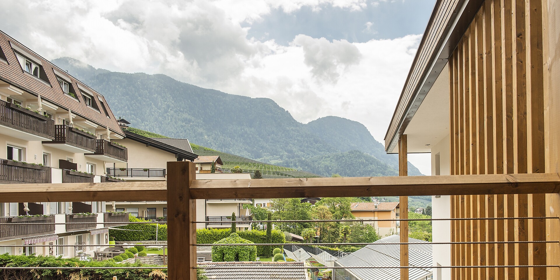 Appartamento Vista (ca. 51 mq) con grande balcone rivolto a sud-ovest (ca. 14 mq) di fronte al sole con splendida vista panoramica su di Merano (a valle). Soggiorno con angolo cottura, divano letto, telefono, TV satellitare, WiFi, cassetta di sicurezza, grande doccia, asciugacapelli, WC separato, Bidet.