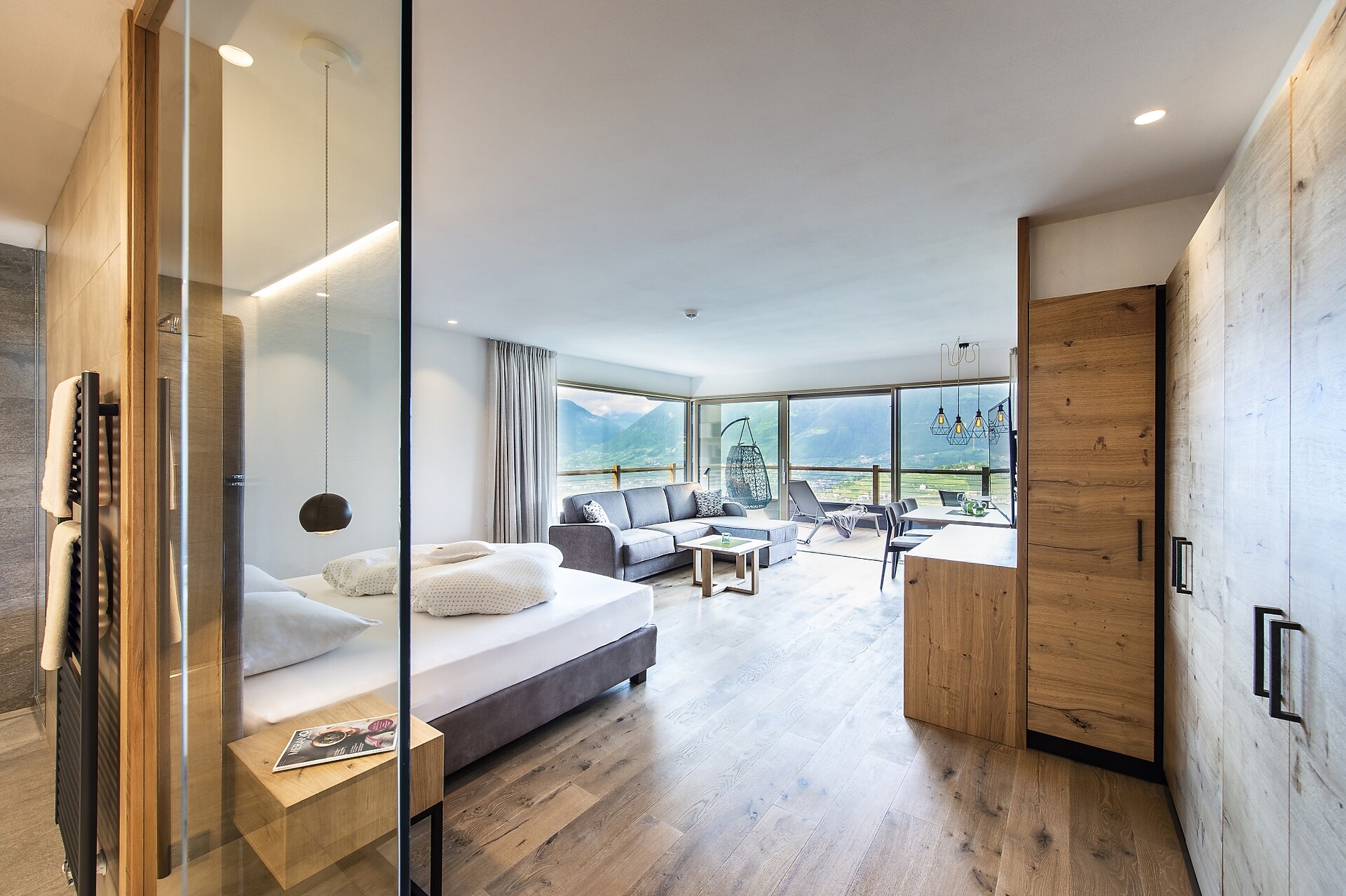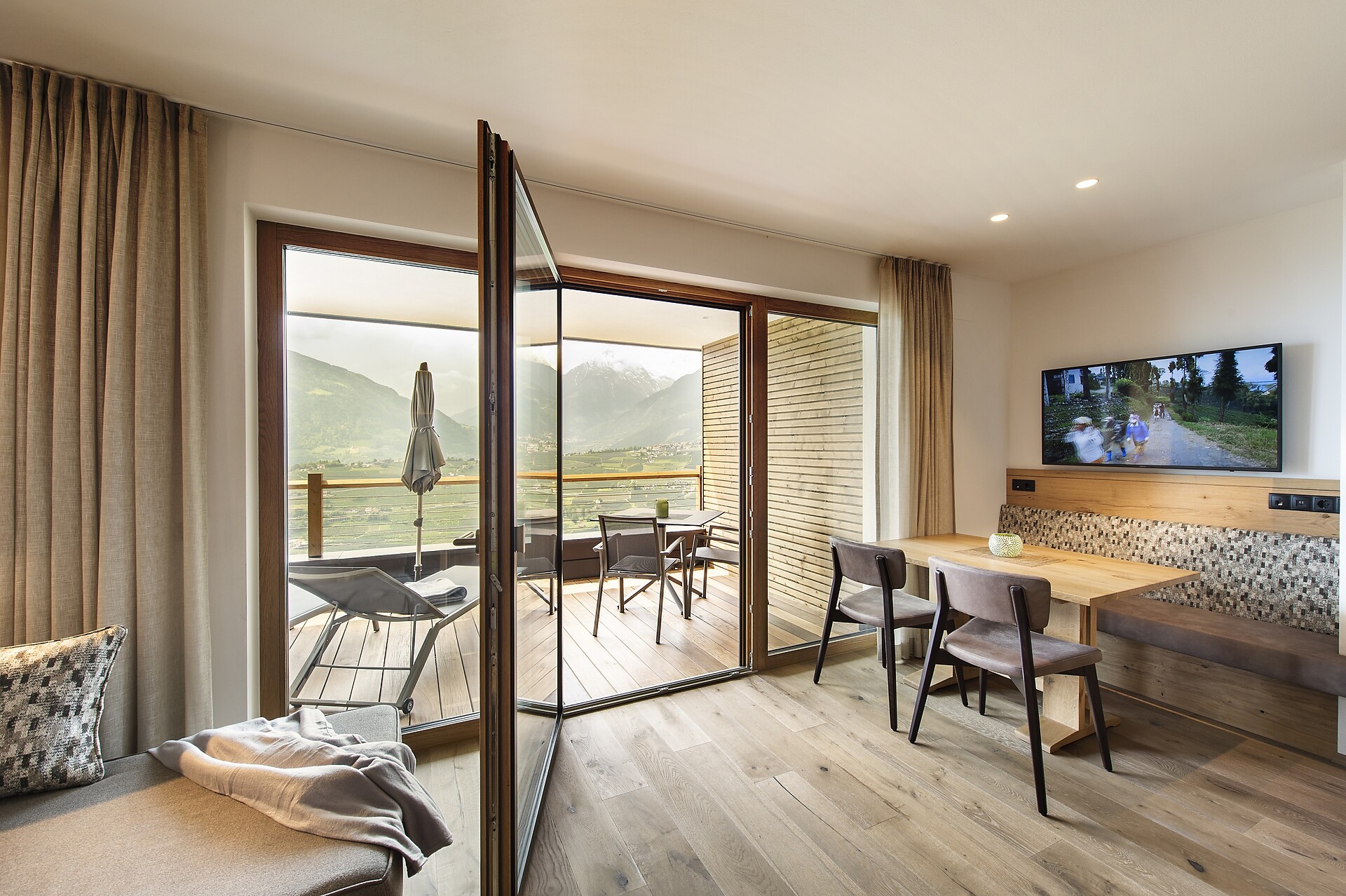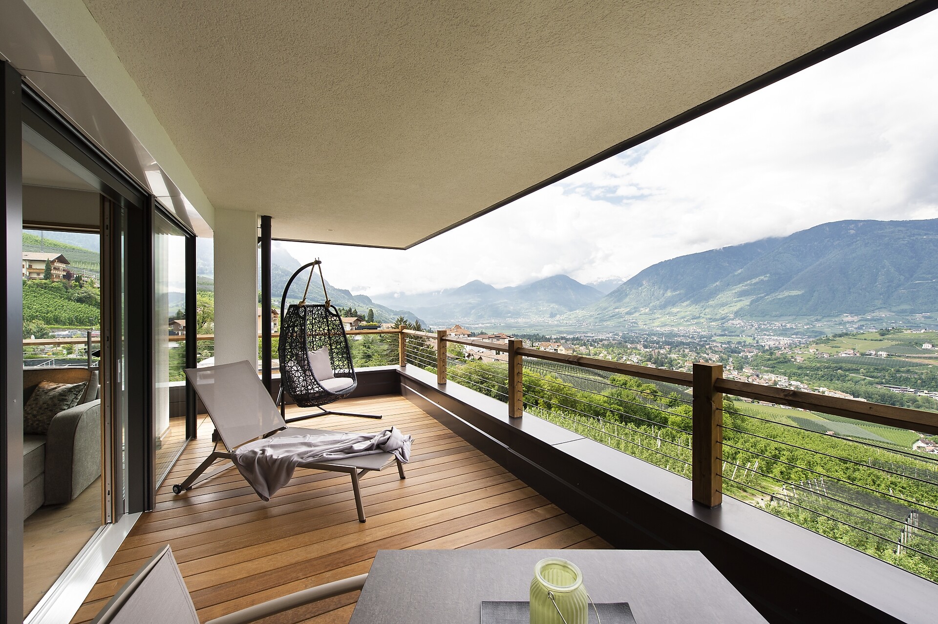 Appartamento Vista (ca. 51 mq) con grande balcone rivolto a sud-ovest (ca. 14 mq) di fronte al sole con splendida vista panoramica su di Merano (a valle). Soggiorno con angolo cottura, divano letto, telefono, TV satellitare, WiFi, cassetta di sicurezza, grande doccia, asciugacapelli, WC separato, Bidet.