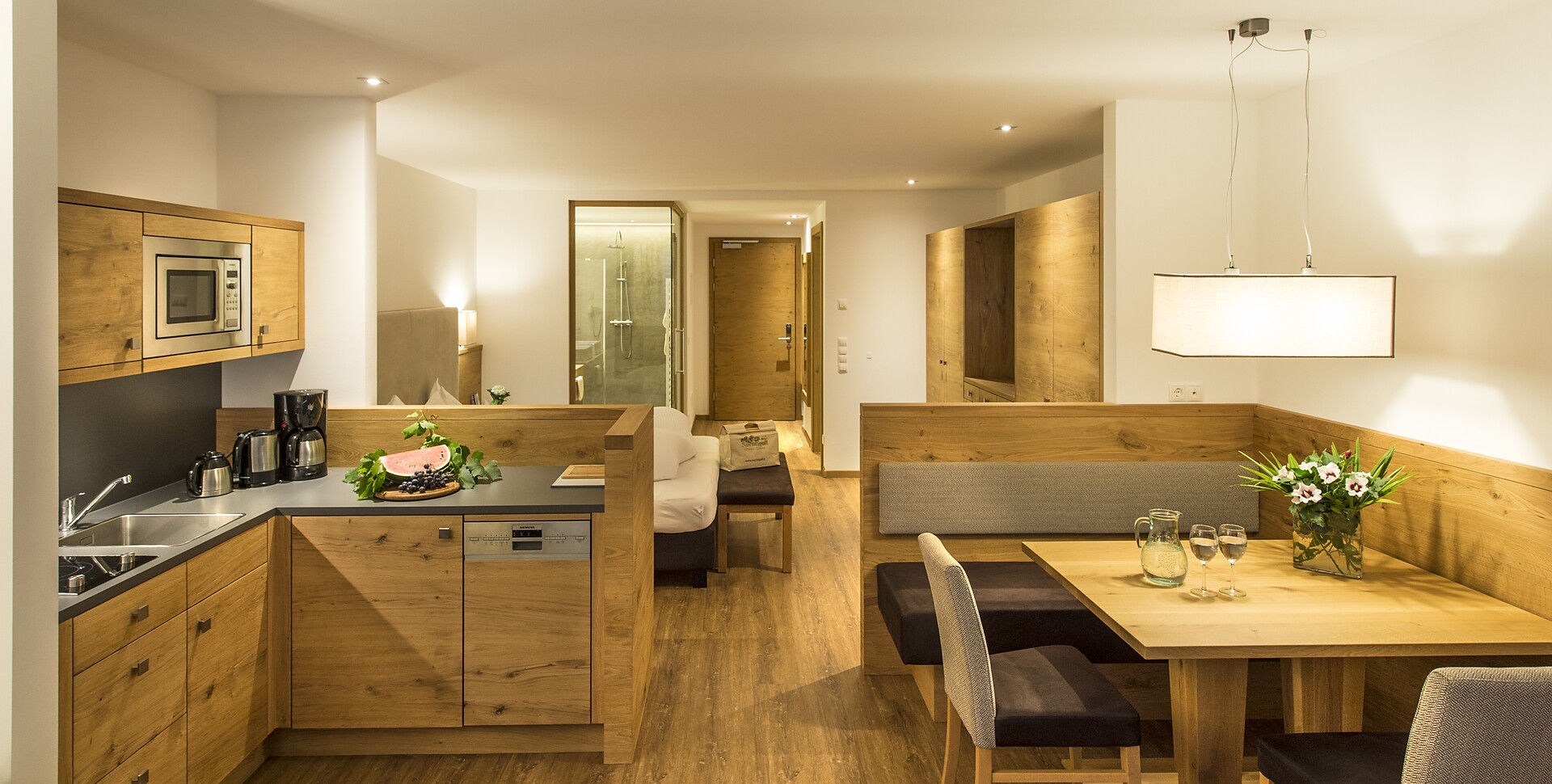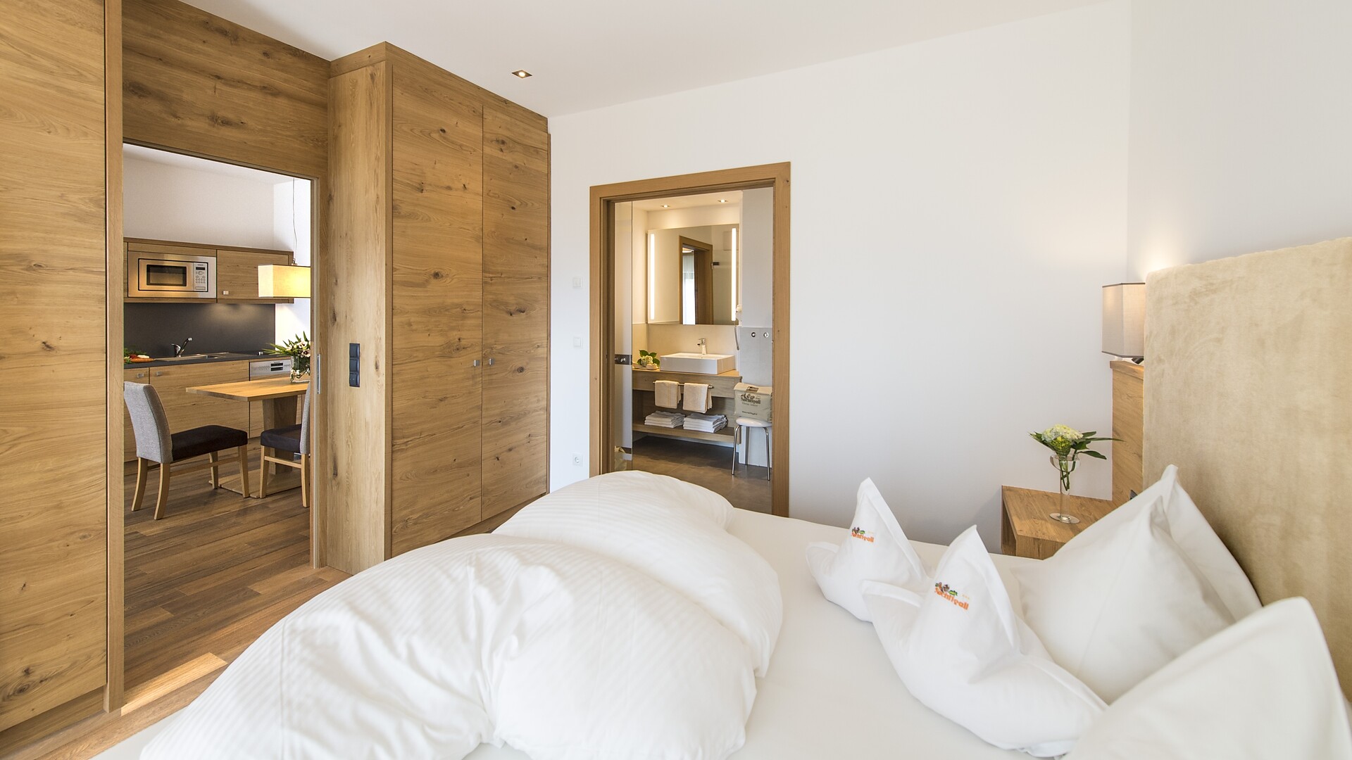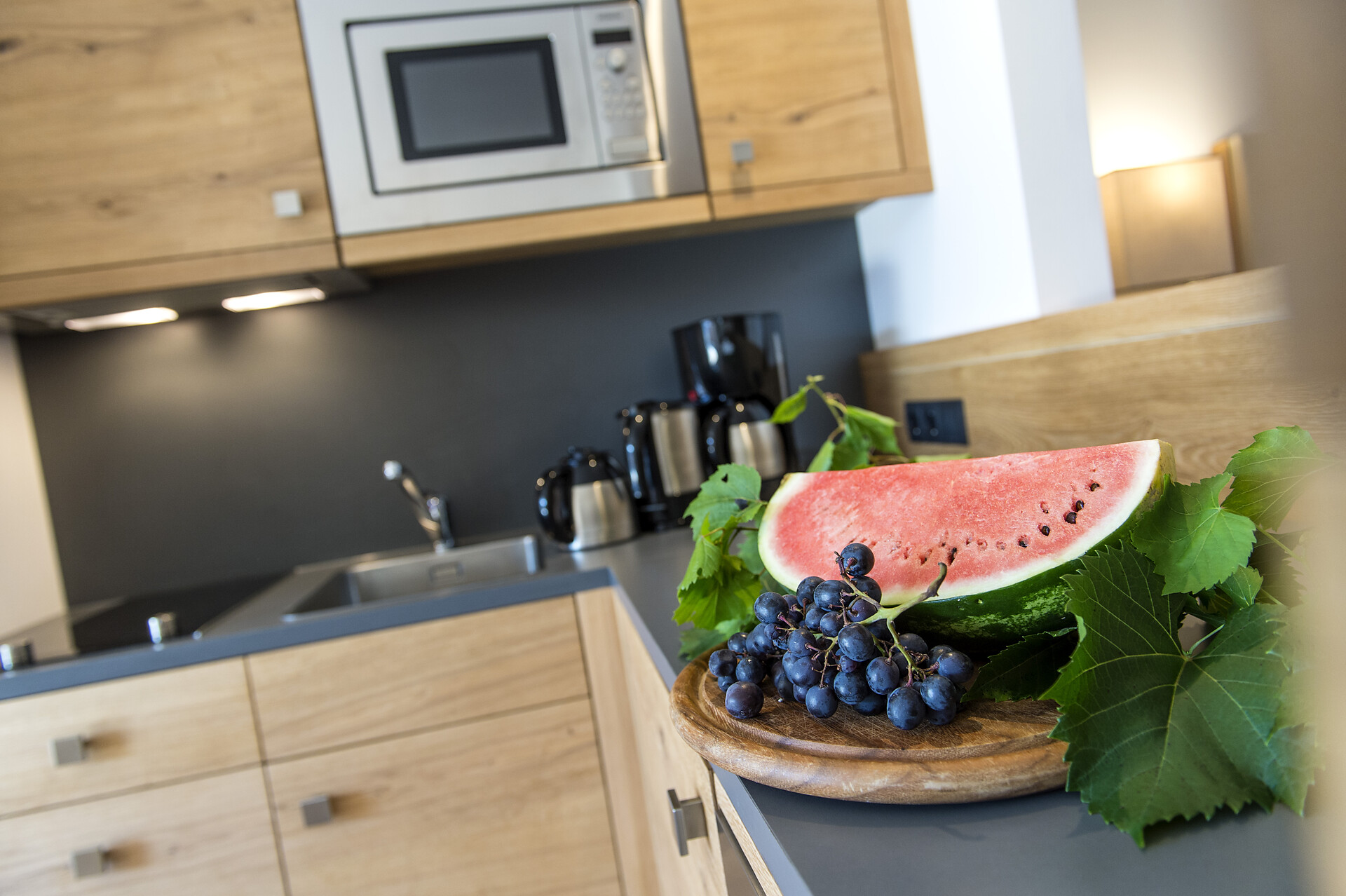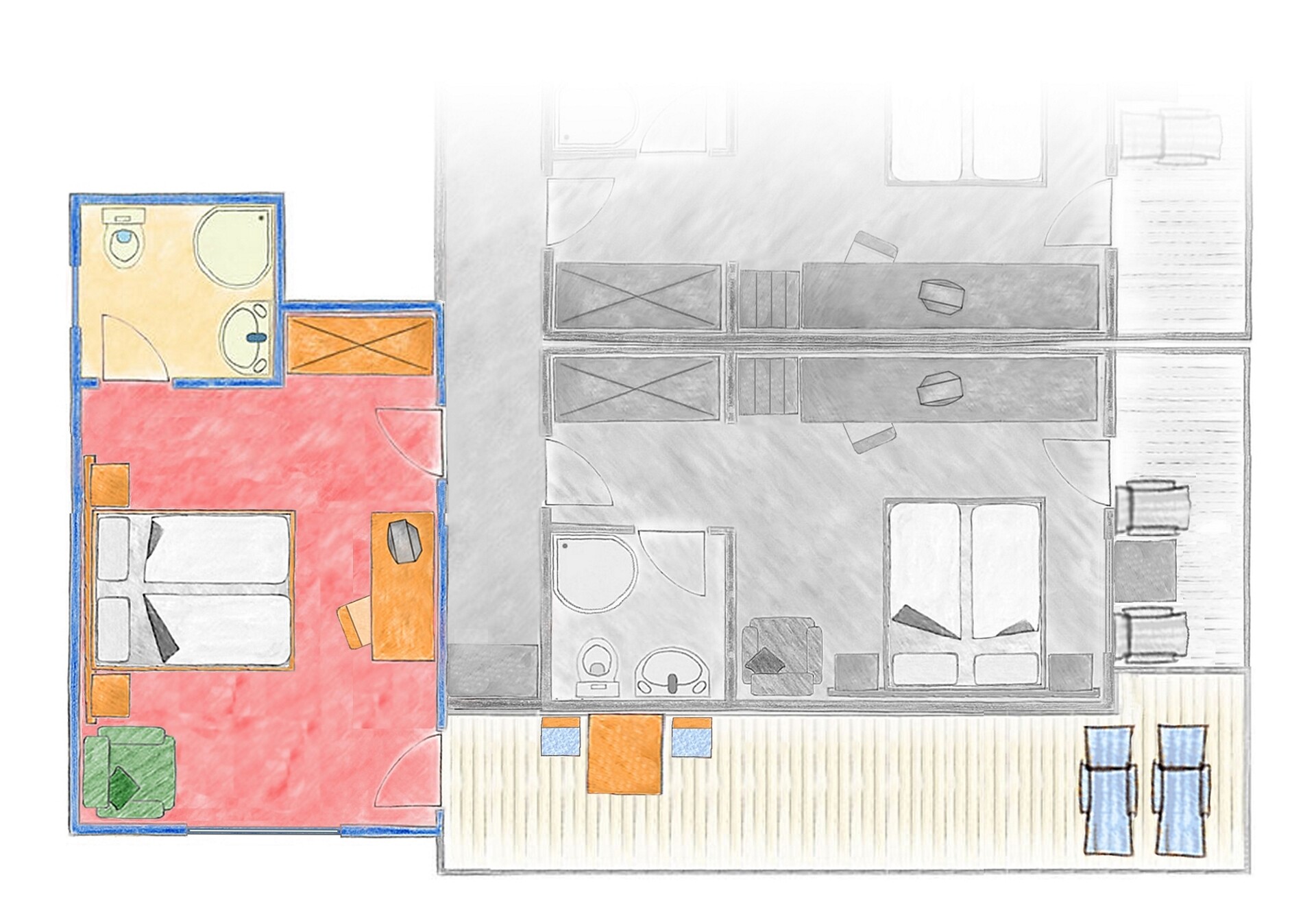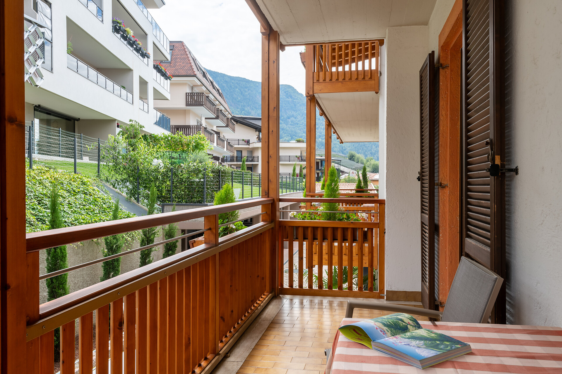 Appartamento Loggia (ca. 42 mq) con balcone rivolto a sud-ovest (ca. 7 mq) con vista su di Merano (a valle). Soggiorno con angolo cottura, divano letto, telefono, TV satellitare, WiFi, cassetta di sicurezza, e stanza da letto con doccia, asciugacapelli, WC separato, Bidet.