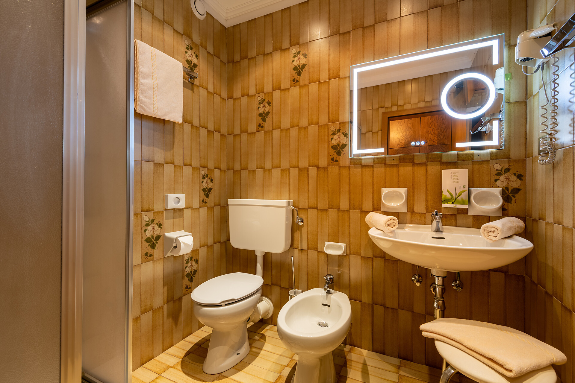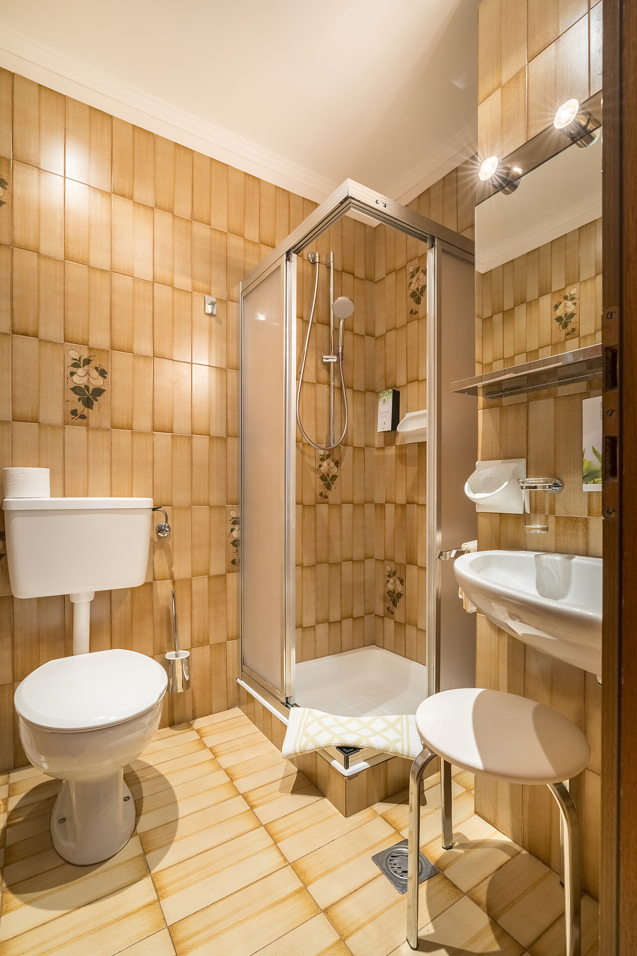 Accogliente camera doppia situata al 1° piano con balcone rivolto a sud-ovest, con una stupenda vista panoramica sul territorio di Merano (lato valle), con doccia, WC, asciugacapelli, letto matrimoniale, divano, piccola scrivania, radio, telefono, cassaforte, TV satellitare, arredamento mediterraneo
