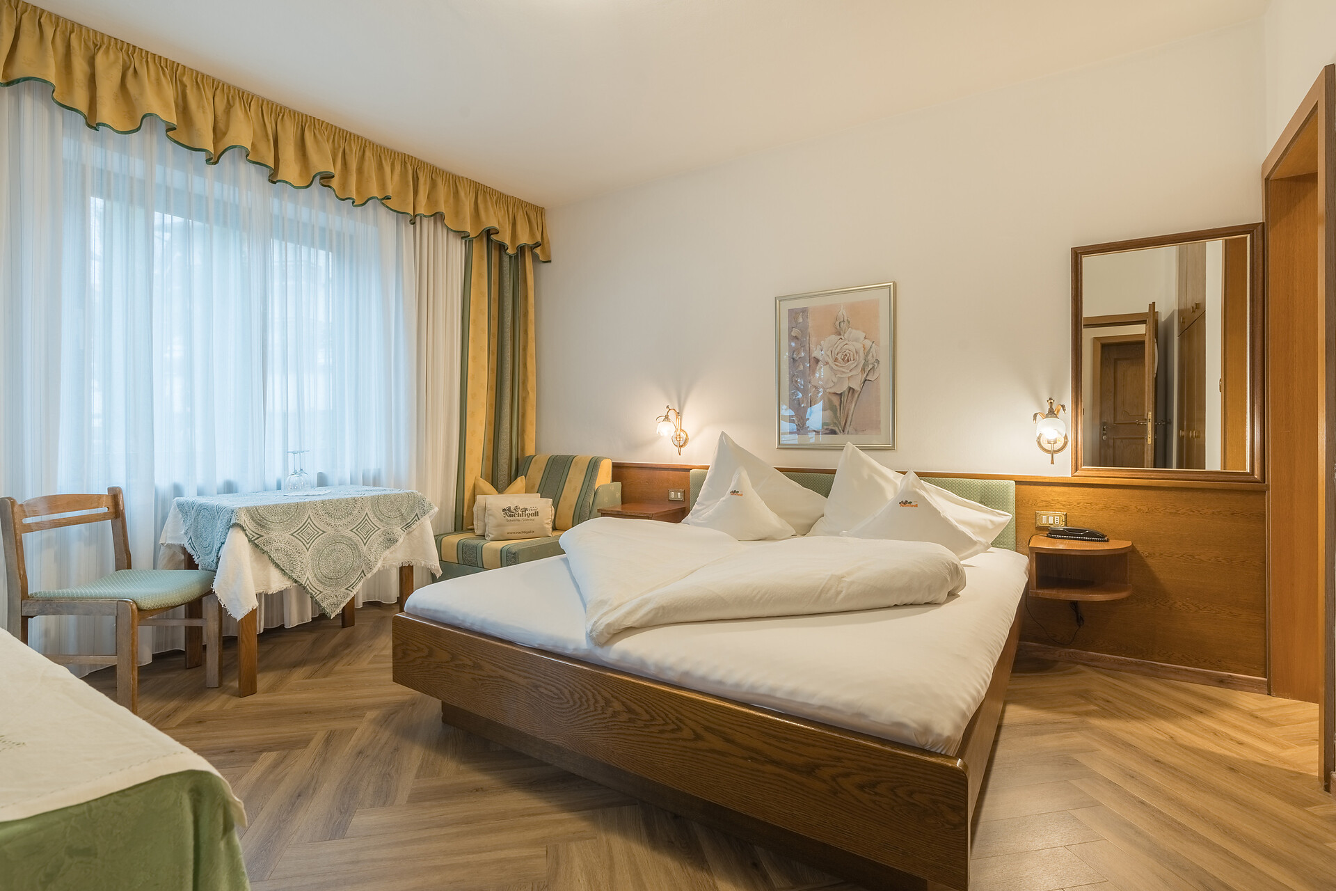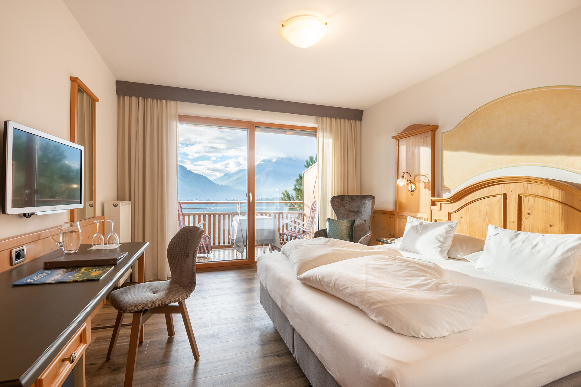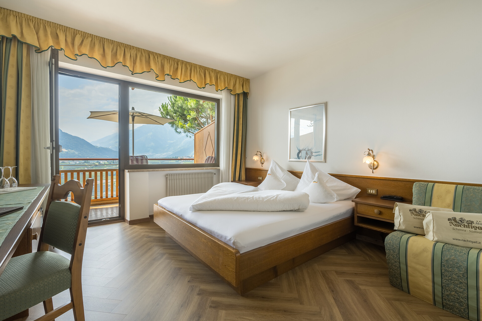 Confortevole camera doppia situata al 2° piano con balcone rivolto a sud-ovest, con una stupenda vista panoramica sul territorio di Merano (lato valle), con doccia, WC, asciugacapelli, letto matrimoniale, divano, piccola scrivania, radio, telefono, cassaforte, TV satellitare, arredamento rustico