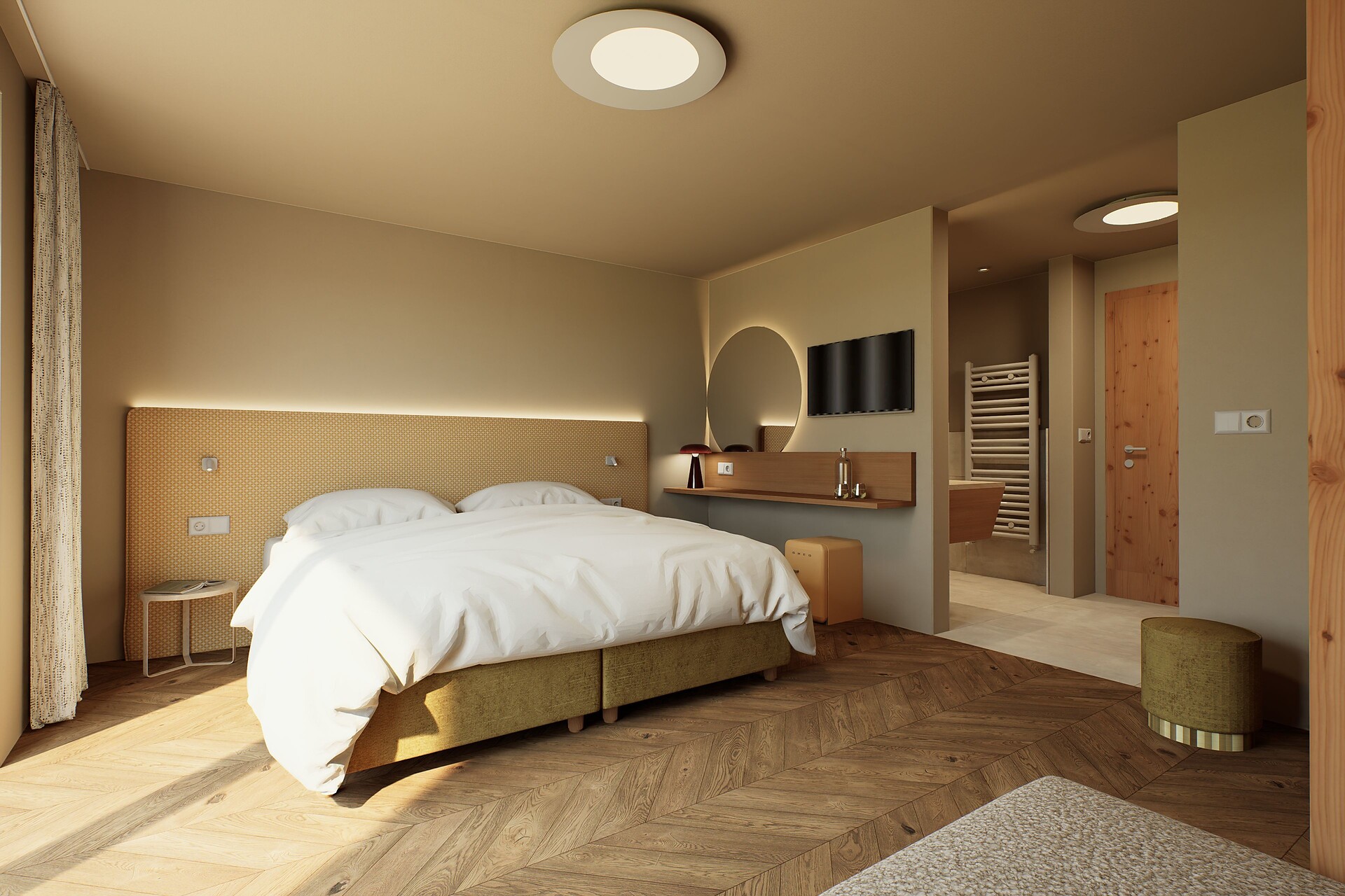 Incantevole ed elegante camera doppia nei delicati toni del rosso e giallo situata al primo e secondo piano. Balcone con poltroncine rivolto a sud-ovest con splendida veduta panoramica del Burgraviato con il Monte San Vigilio, l’ingresso della Val d’Ultimo, la Val Venosta, la Val Passiria e il grandioso Gruppo del Tessa; balcone con poltroncine rivolto a sud verso le distese di meli, il Monte Scena e la piscina all’aperto del nostro albergo. Stanza molto luminosa e spaziosa con letto a baldacchino e ampia zona soggiorno. Elegante sala da bagno, parzialmente zona WC e bidet separate, doccia, lavandino doppio. Incluso posto auto riservato nel garage sotterraneo. Sole tutto il giorno.