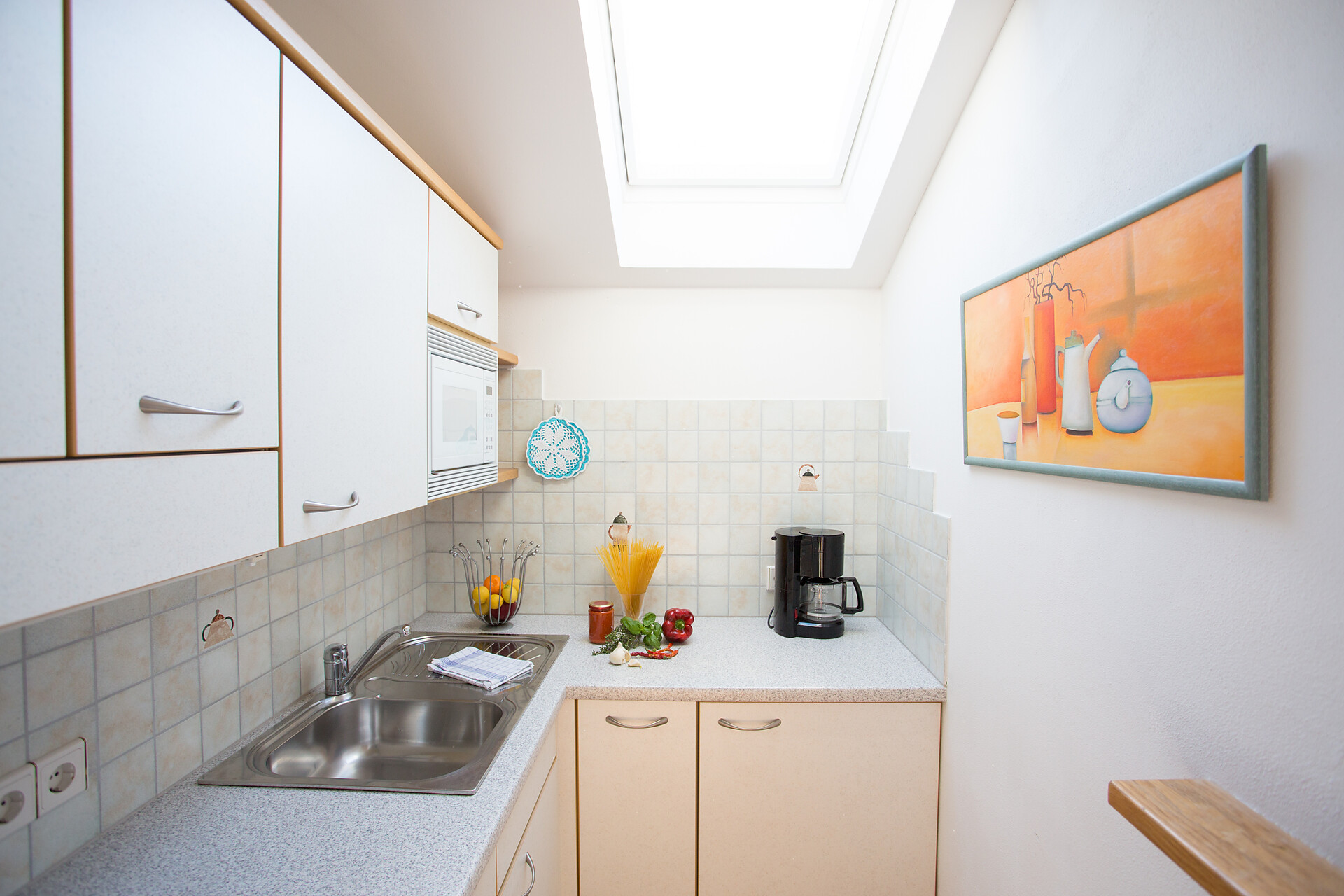 Letto matrimoniale, Divano letto, Balcone, Giardino, Biancheria da letto disponibile, Cassaforte, Appartamento non fumatori, Cucina separata, Cucina abitabile, Macchina da caffè, Piano cottura elettrico, Stoviglie, Scaldaacqua, Doccia / bagno, Fon, Asciugamani, TV, TV satellitare/via cavo, WLAN, Edificio principale, Vista panoramica, Lato sud