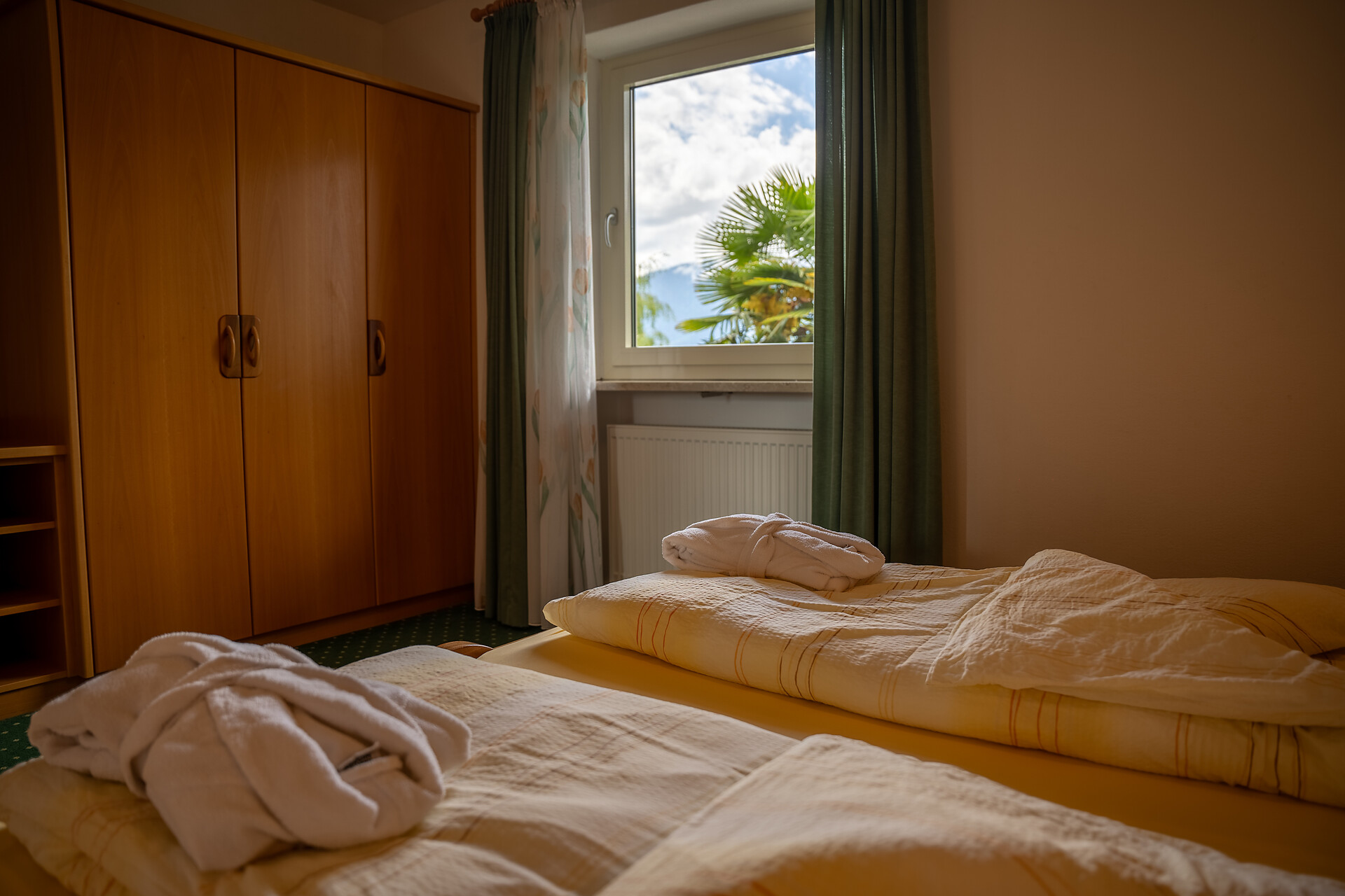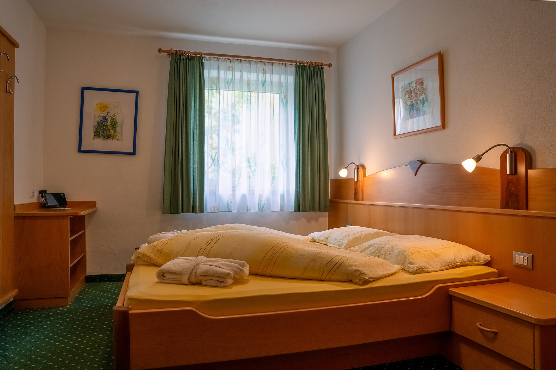 Camera doppia nella casa principale Schmied Hans (circa 24 m²), spaziosa e luminosa, con letti boxspring, scrivania, TV satellitare, wifi, cassaforte, telefono con linea diretta, minibar, comoda poltrona, bagno moderno con doccia, WC, bidet, asciugacapelli, specchio cosmetico e prodotti di bellezza.