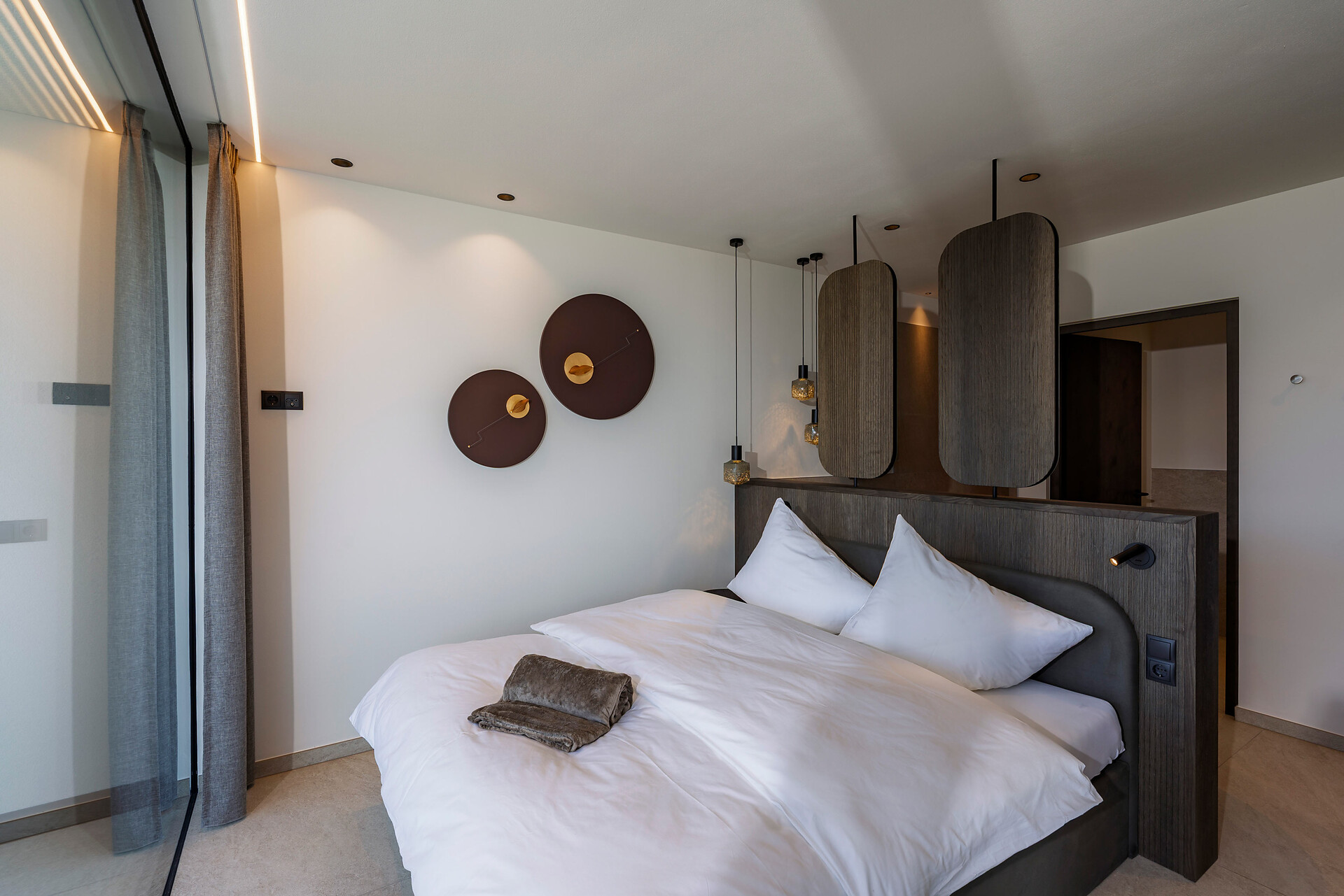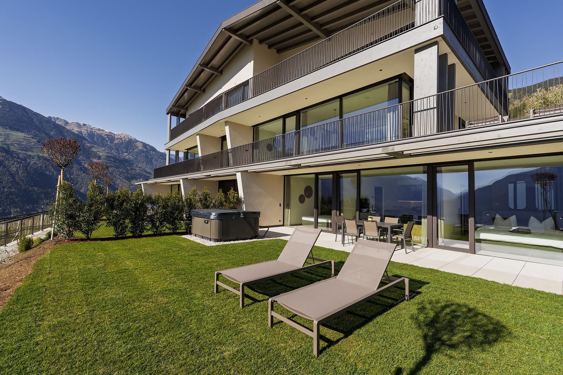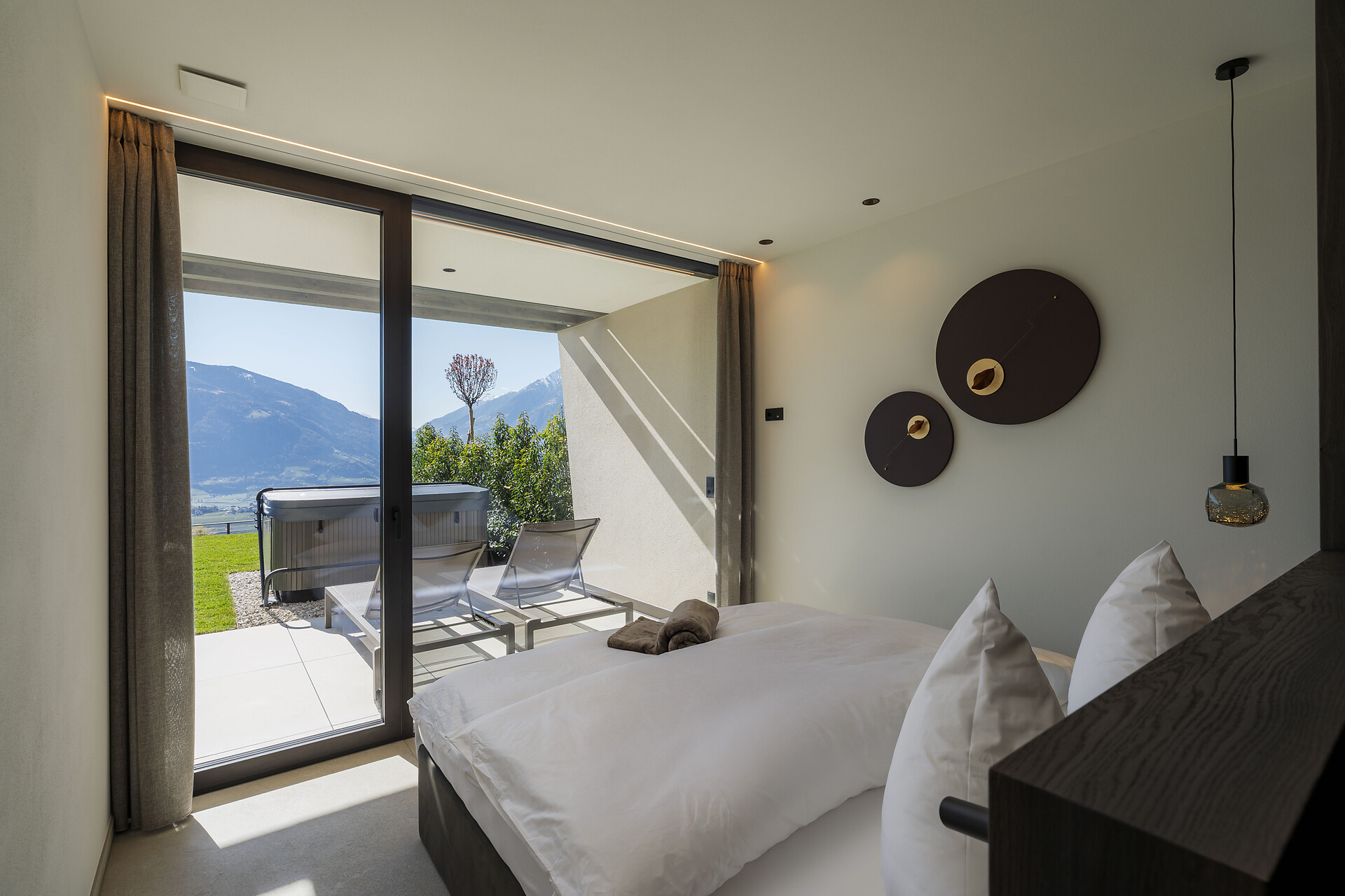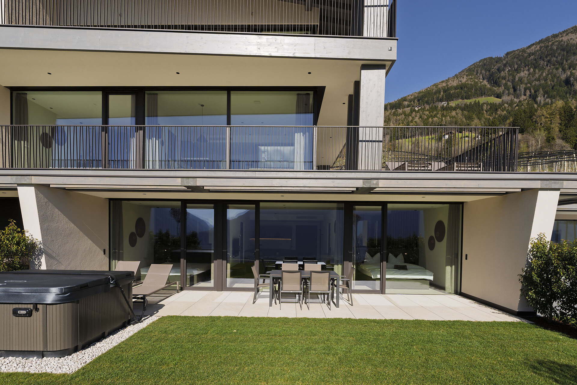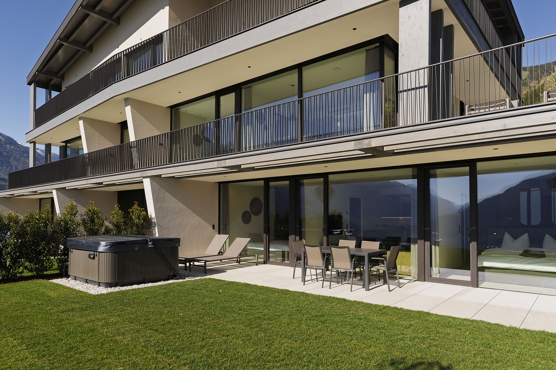 L’Apartment LUX dispone di due camere matrimoniali separate e combina comfort abitativo con un elegante spazio esterno privato. Il giardino (ca. 60–75 m²) e la terrazza di 28 m² offrono piacevoli zone relax, mentre la vasca idromassaggio riscaldata Jacuzzi garantisce un’esperienza wellness esclusiva. Una vetrata di 27 m² assicura ambienti luminosi e aperti.
