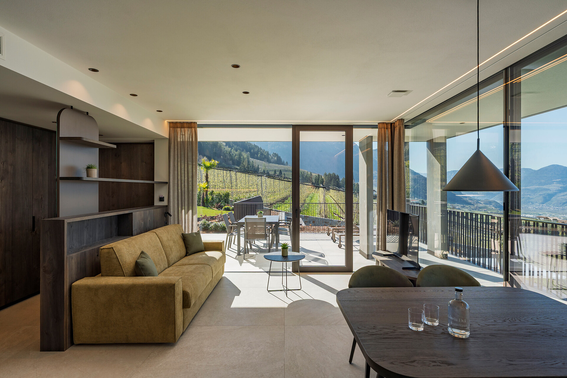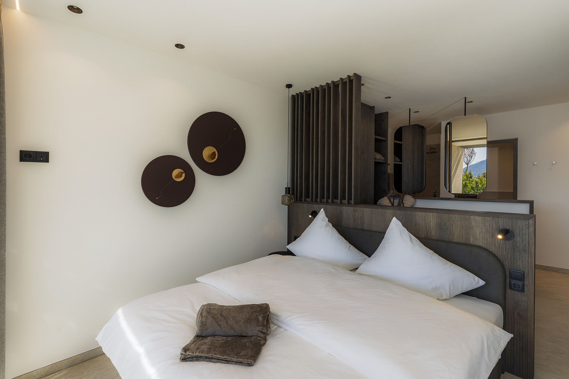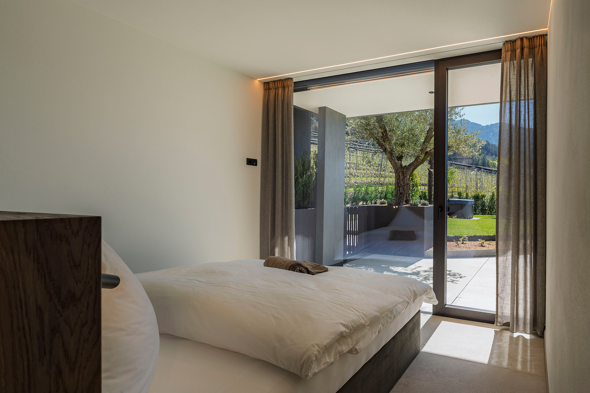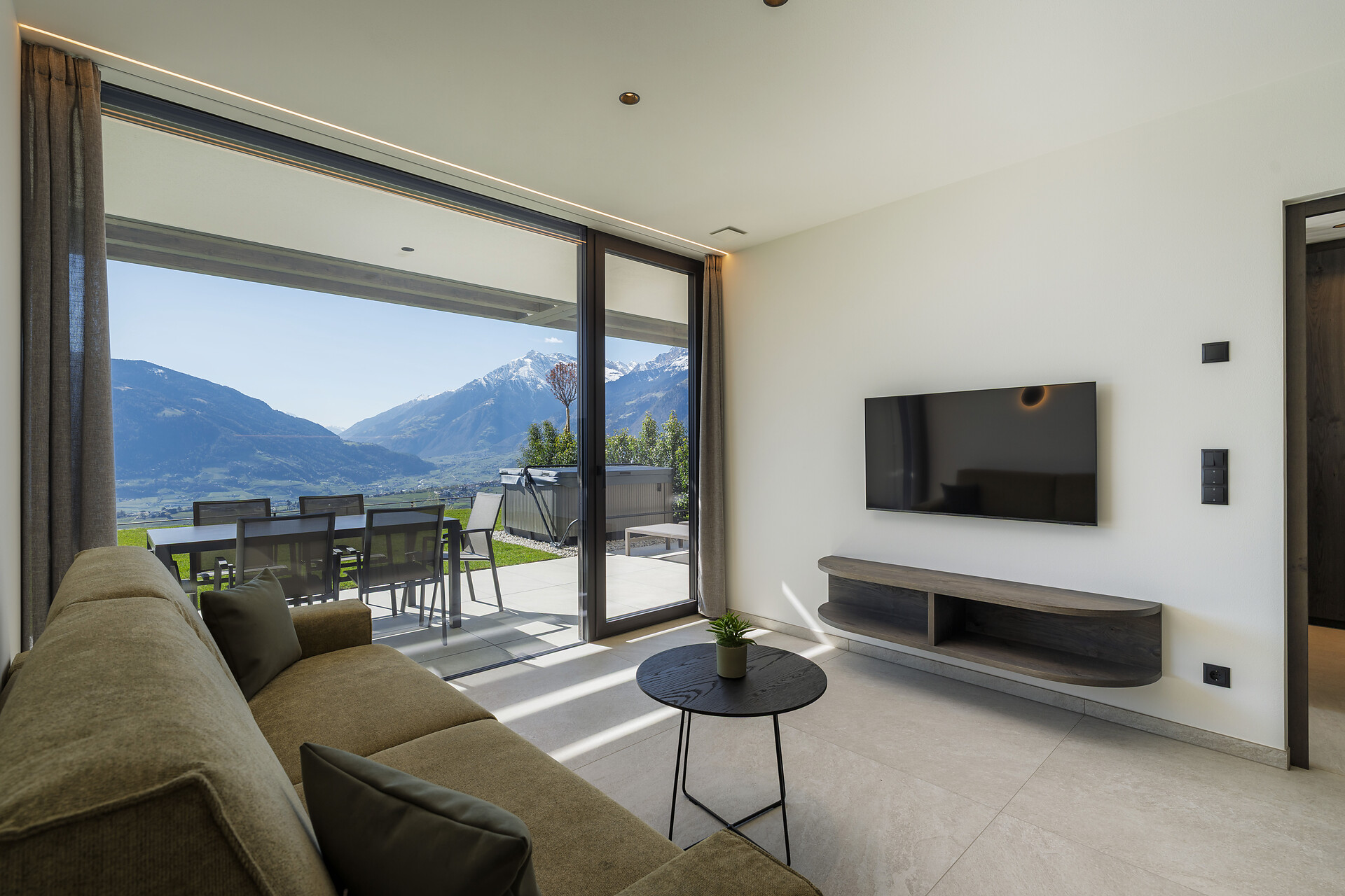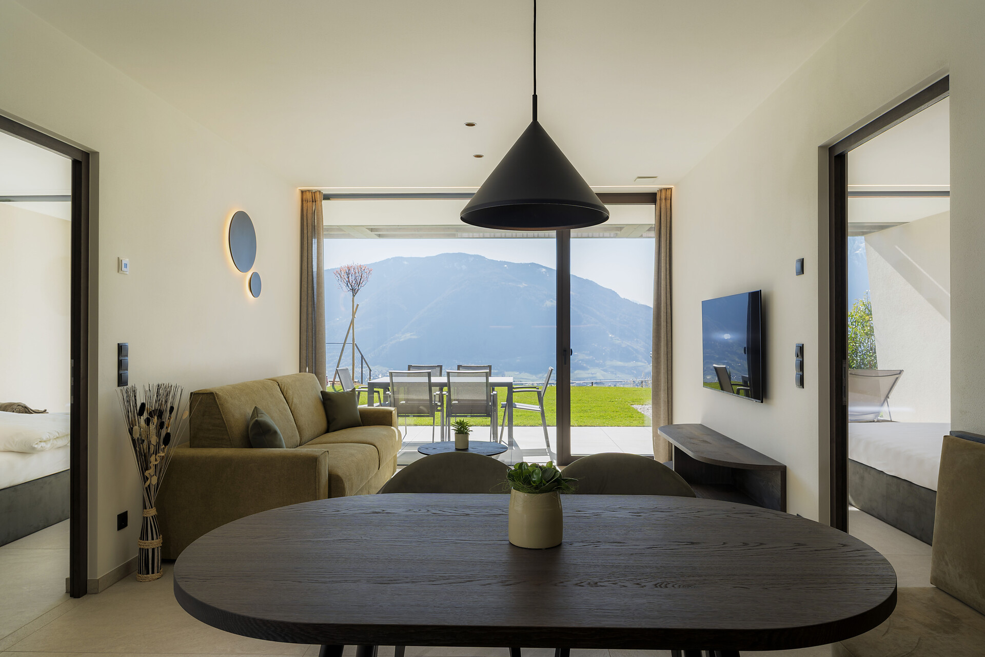 L’Apartment LUX dispone di due camere matrimoniali separate e combina comfort abitativo con un elegante spazio esterno privato. Il giardino (ca. 60–75 m²) e la terrazza di 28 m² offrono piacevoli zone relax, mentre la vasca idromassaggio riscaldata Jacuzzi garantisce un’esperienza wellness esclusiva. Una vetrata di 27 m² assicura ambienti luminosi e aperti.