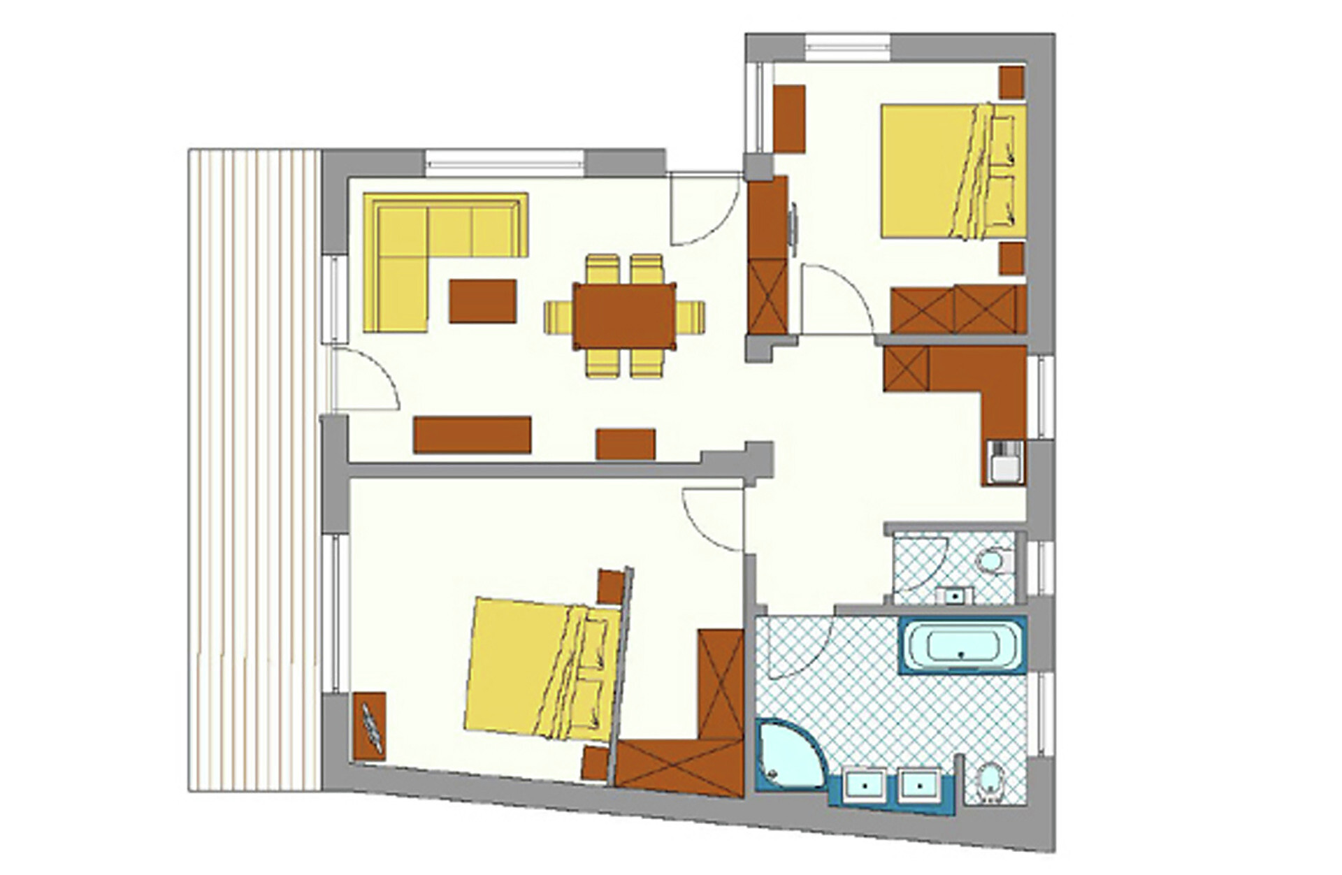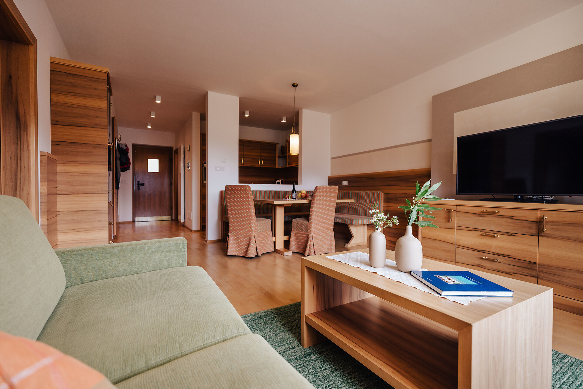 Grande appartamento per quattro persone. L’appartamento Küchelberg dispone su 80 m² di due camere con letti matrimoniali, un soggiorno, una cucina abitabile completamente arredata e un grande bagno con doccia, vasca, bidet e WC separato. La terrazza è il luogo ideale per una piacevole colazione sulle comode sedie a sdraio, si può godere il meraviglioso parco e i dintorni.