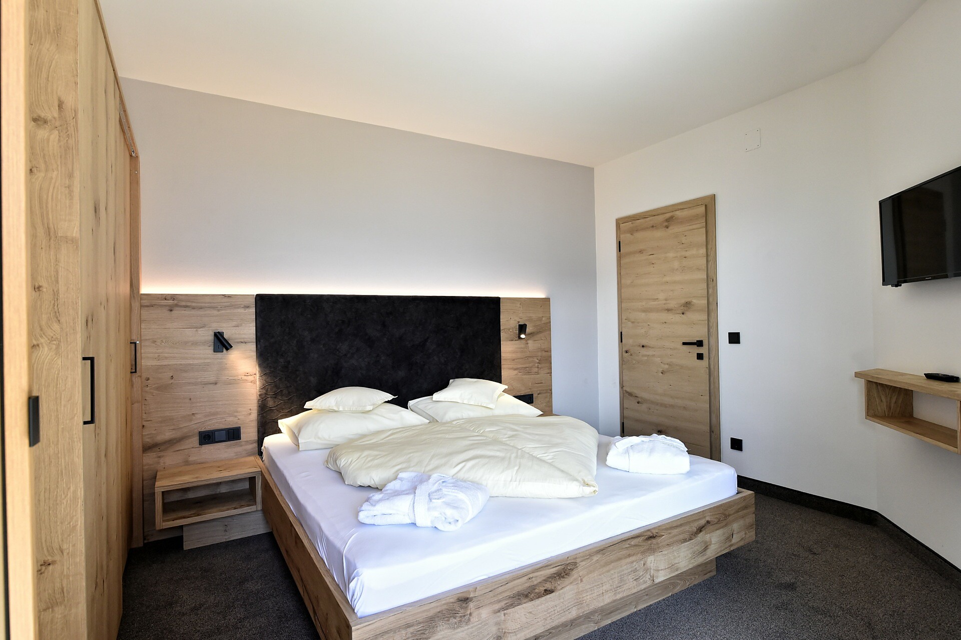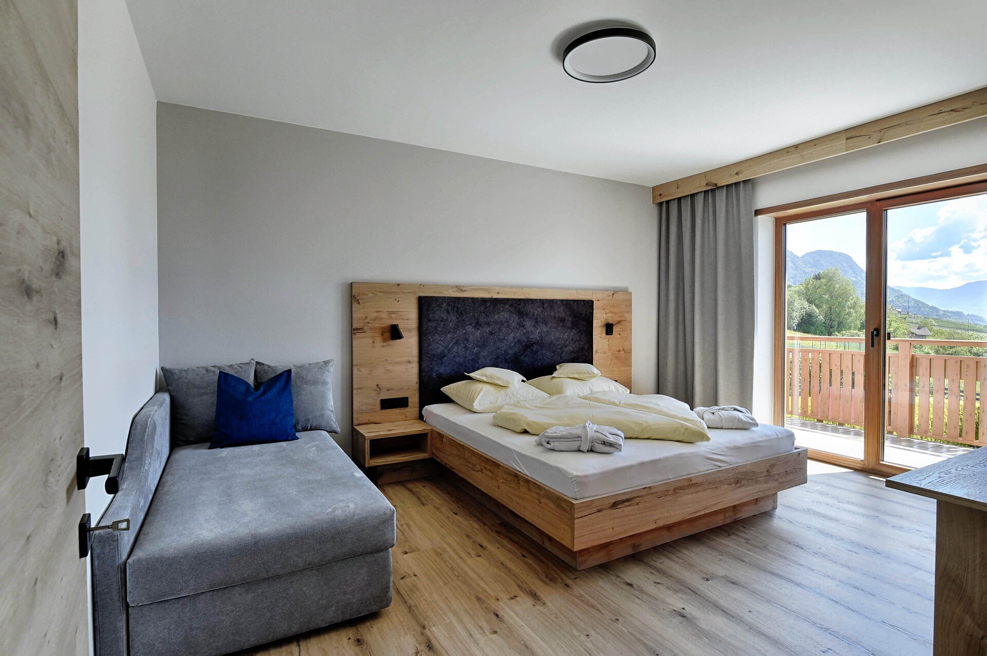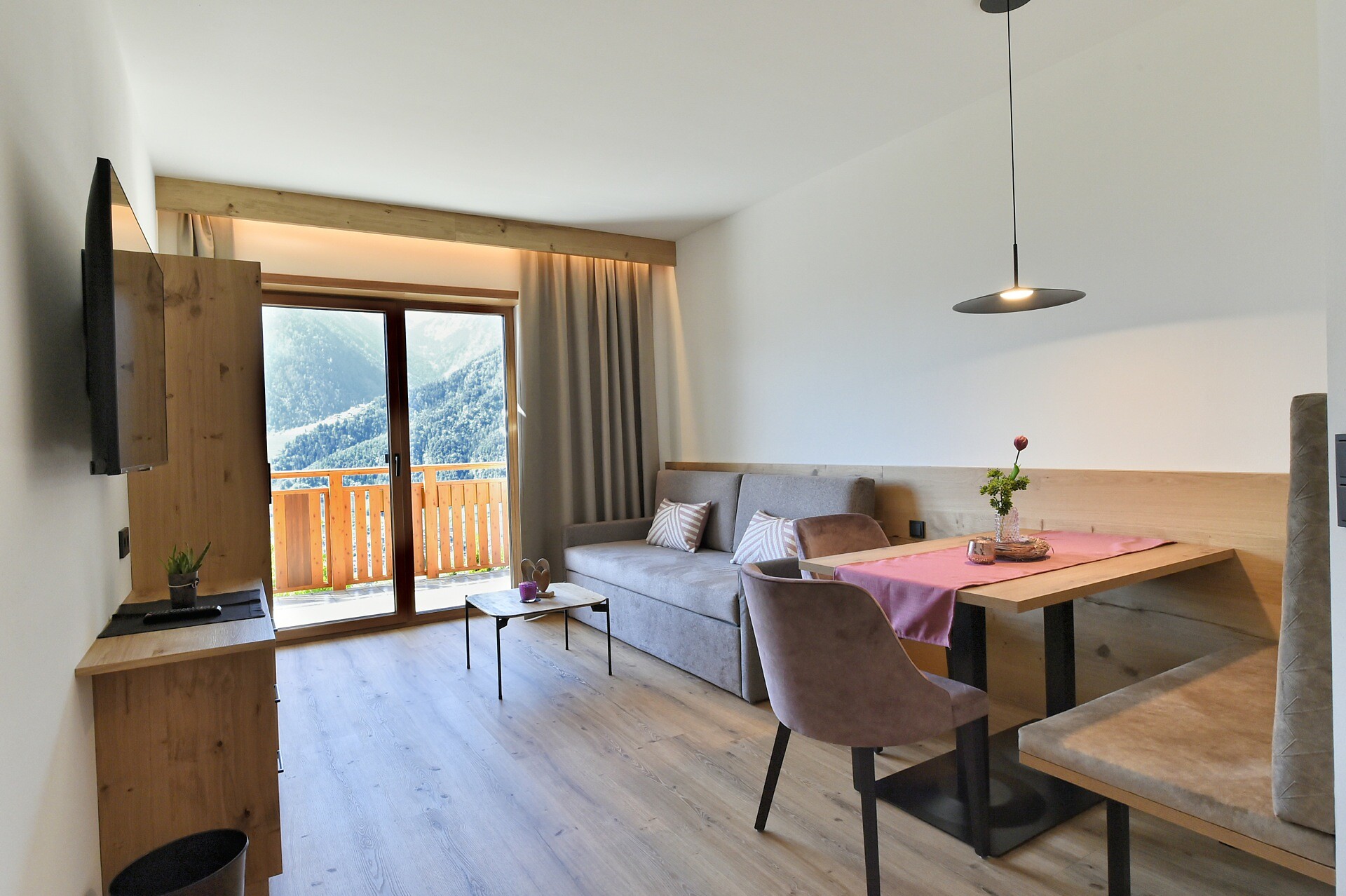 Zona soggiorno, divano letto, televisore a schermo piatto, radio, cassaforte, telefono, accesso al balcone panoramica con splendida vista sui dintorni di Merano e sul paesaggio montano; sedie a sdraio, tavolo con sedie, ombrellone e stendibiancheria.