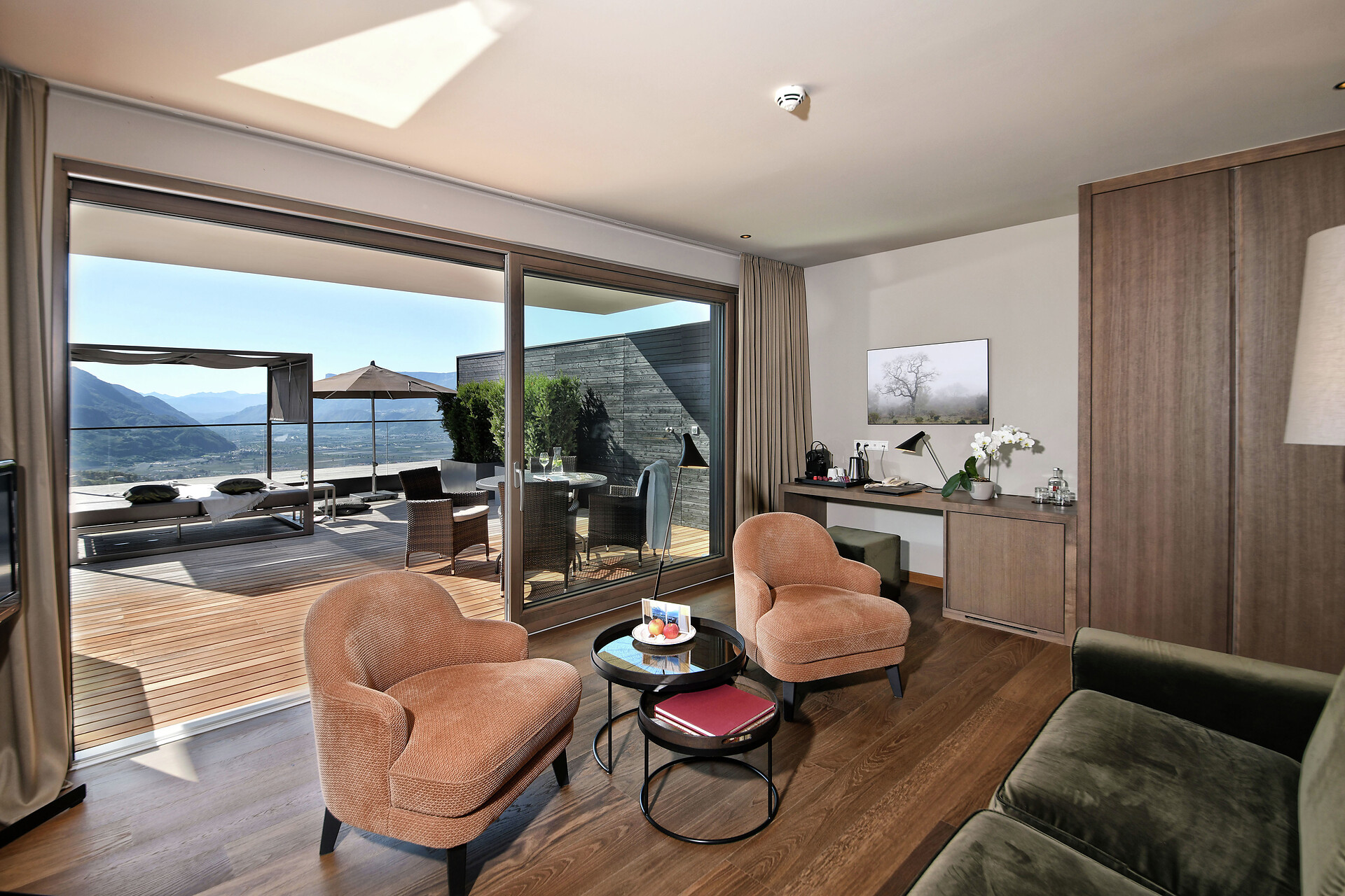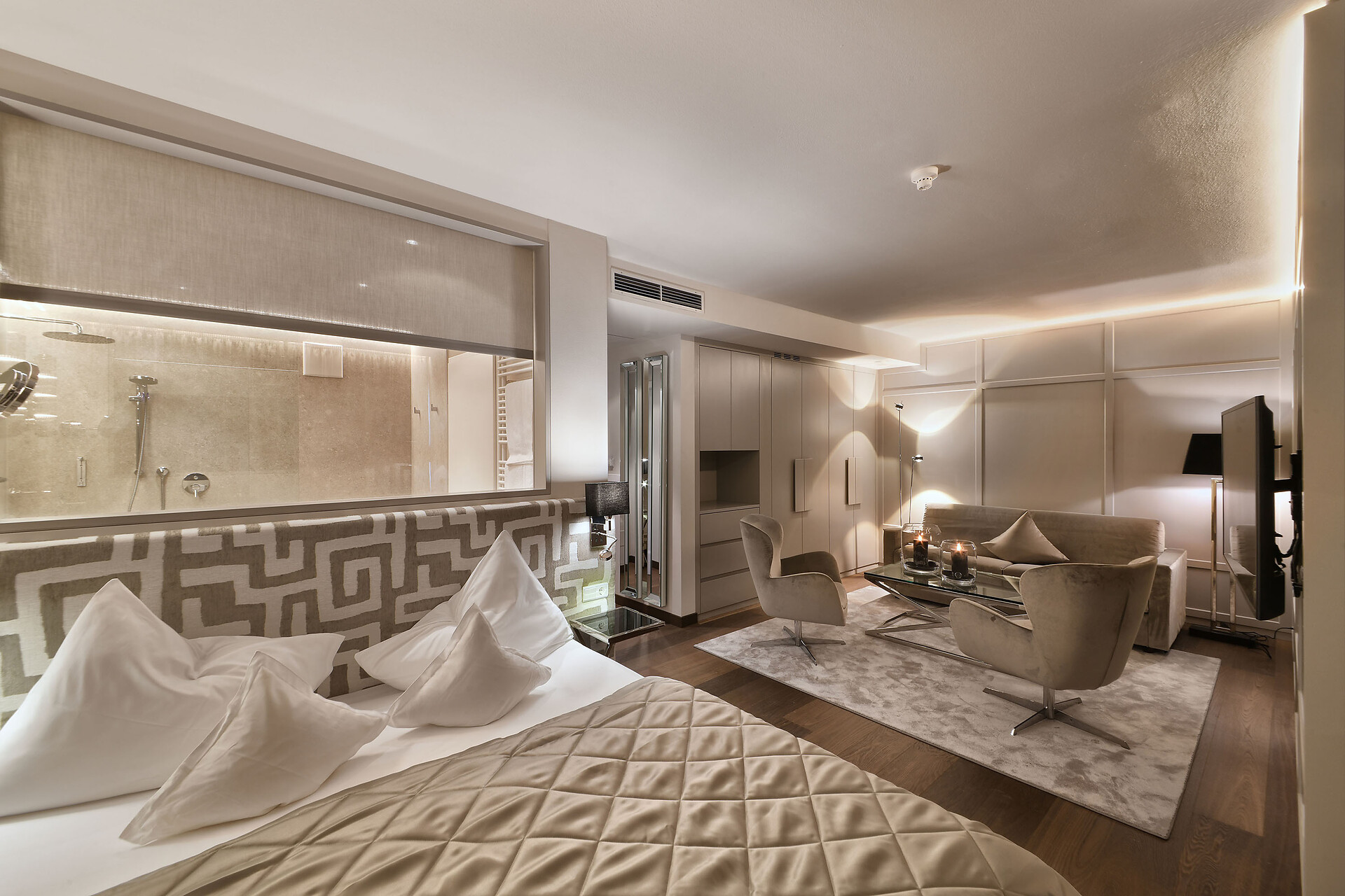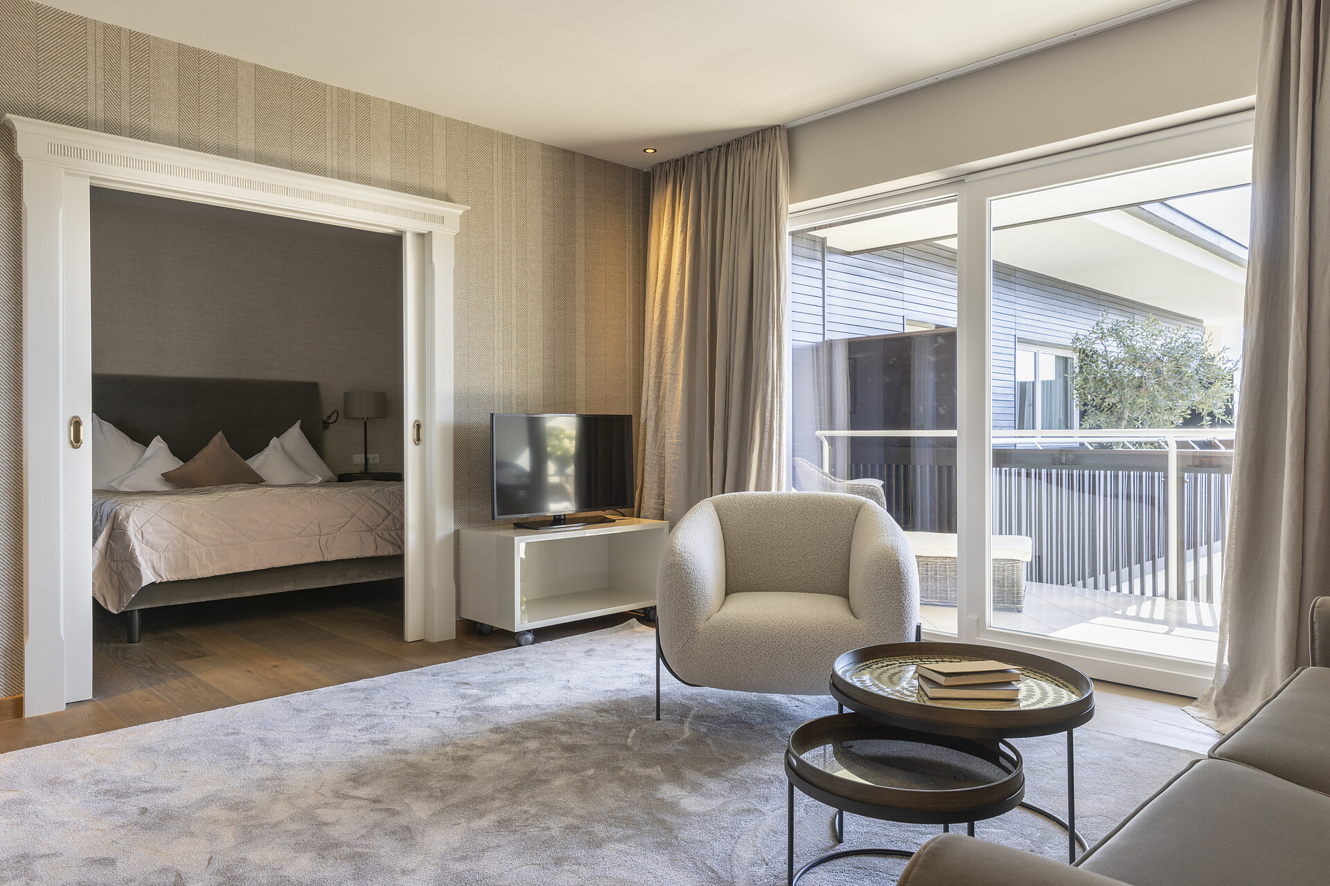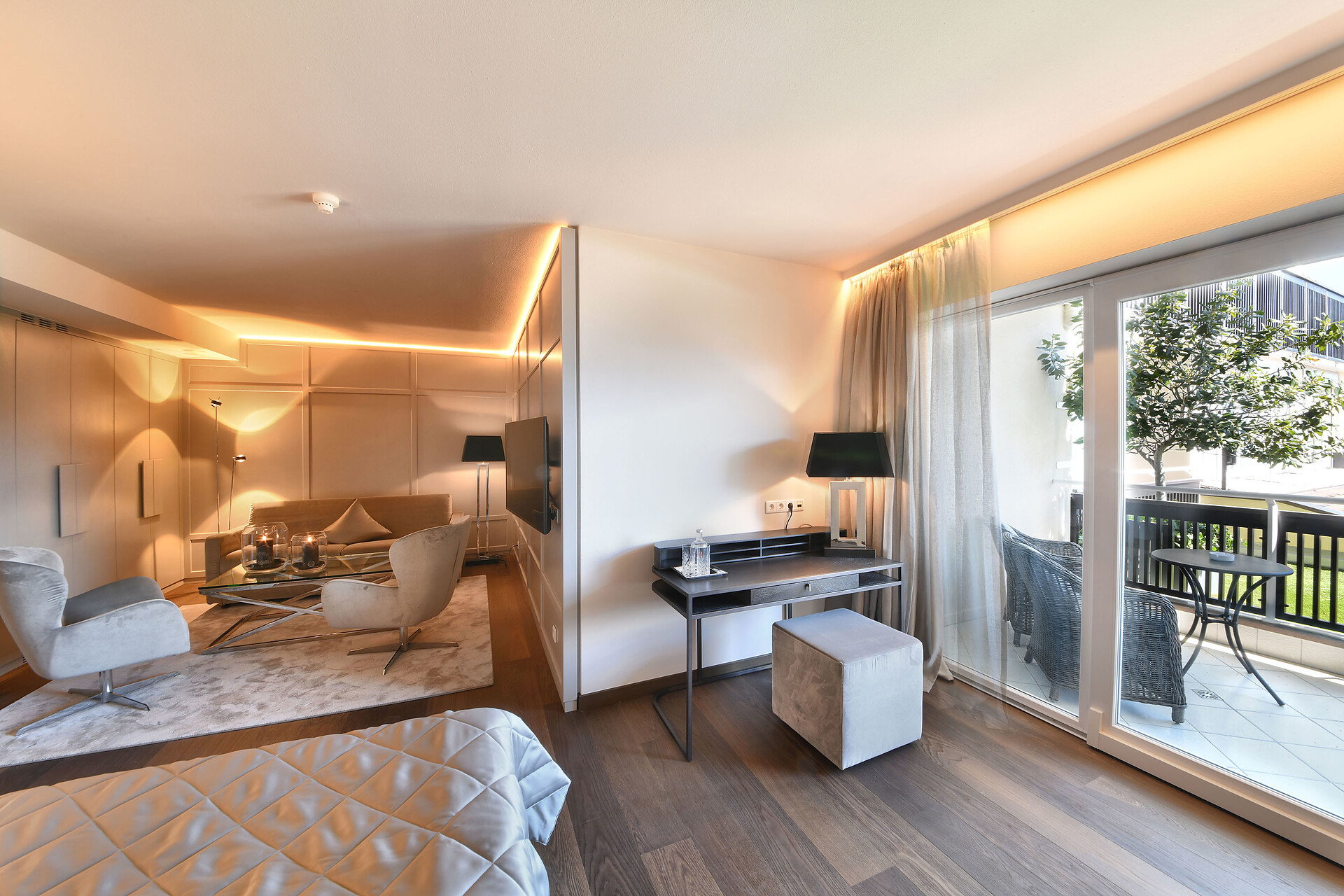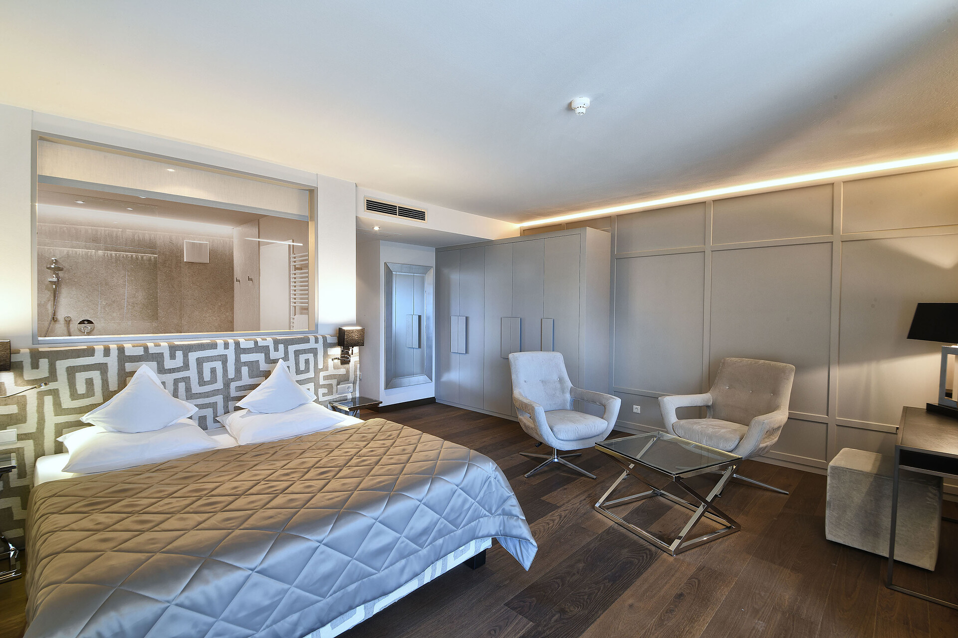 Suite lussuosa con 60 m², 3° piano con 25 m² di balcone esposto a sud e ovest, area soggiorno e area notte separate, pavimento in legno, bagno lussuoso, WC separato, radio, cassaforte, telefono, frigobar, 3 TV-SAT flat-screen, aria condizionata.