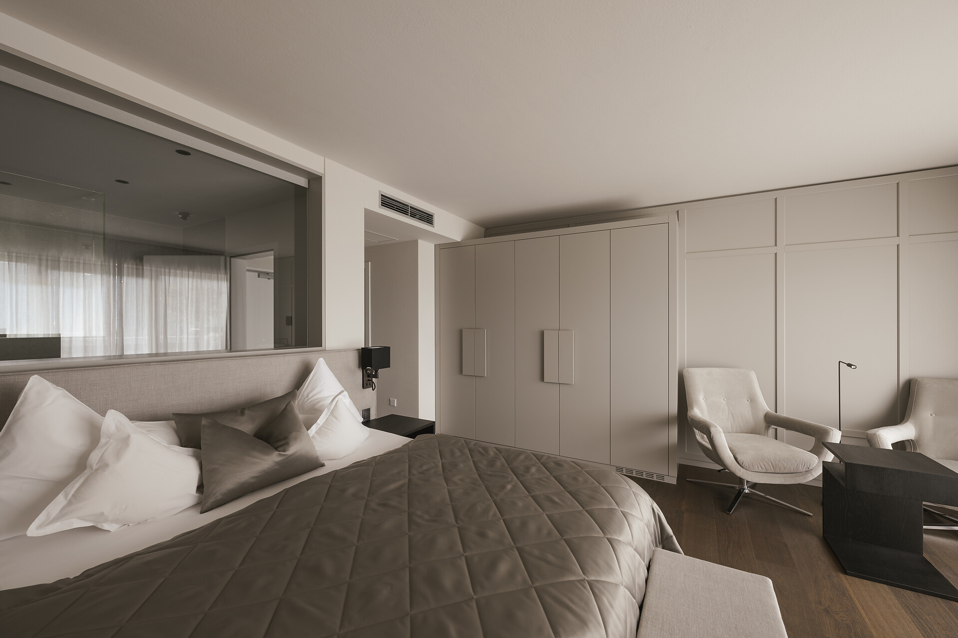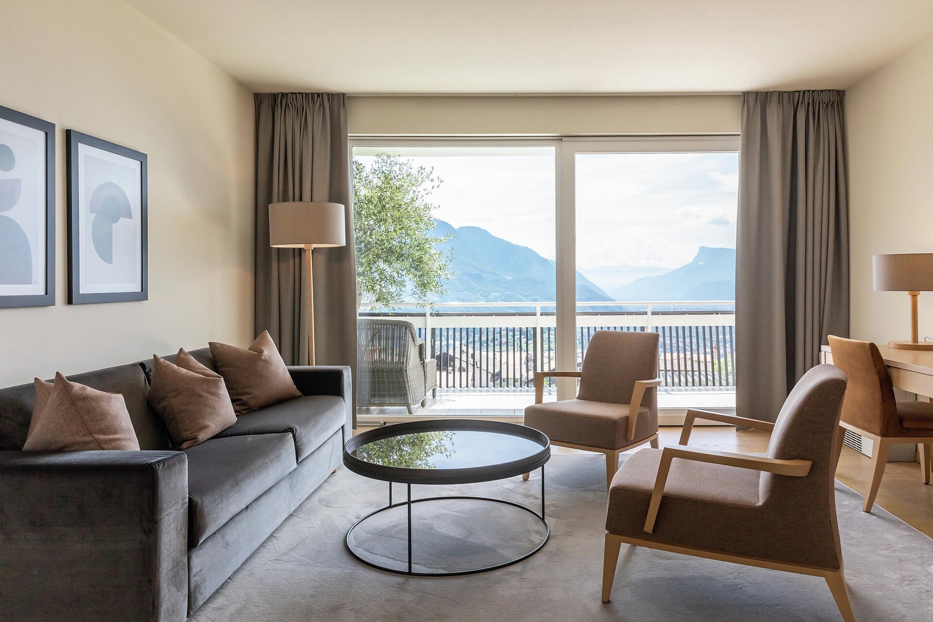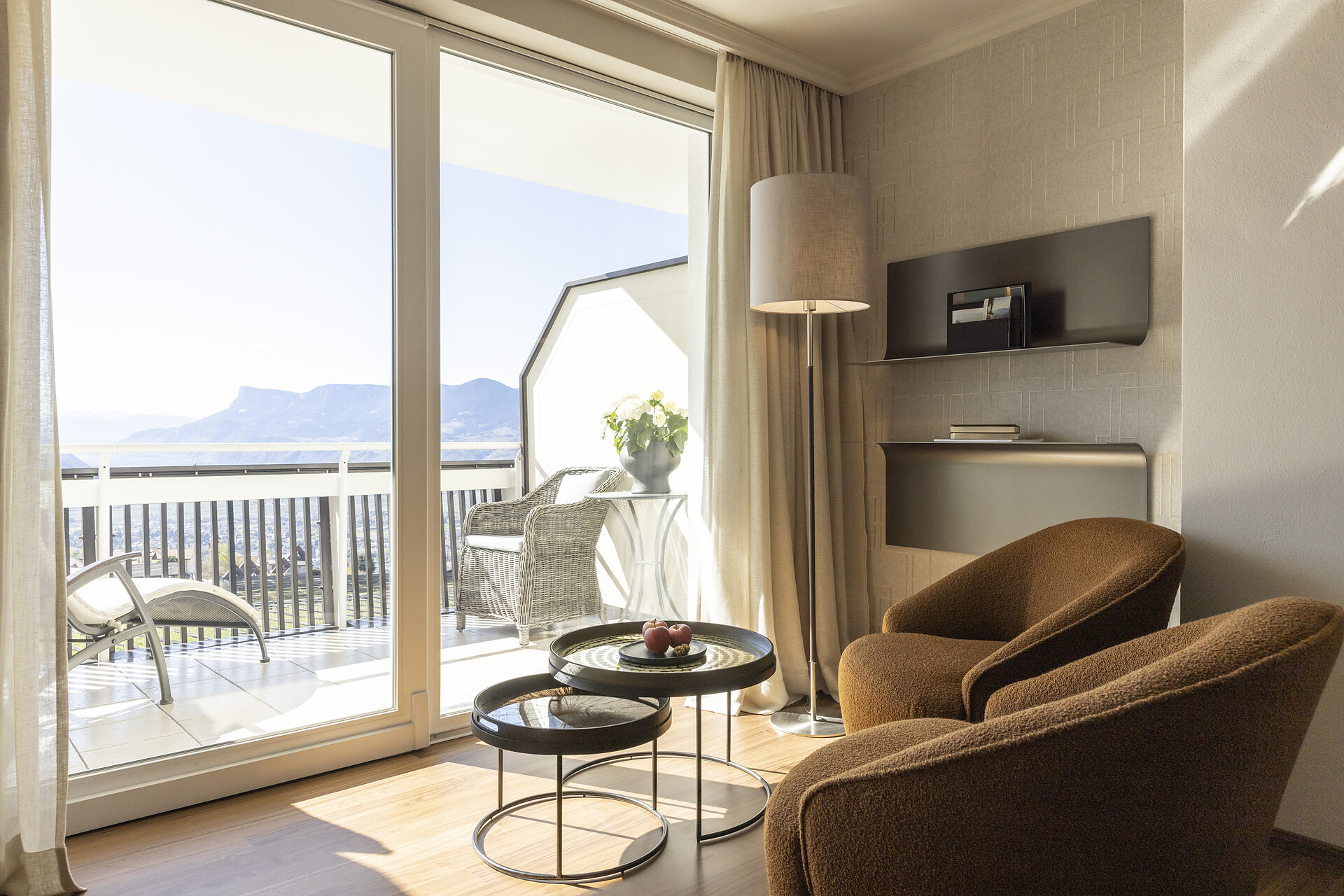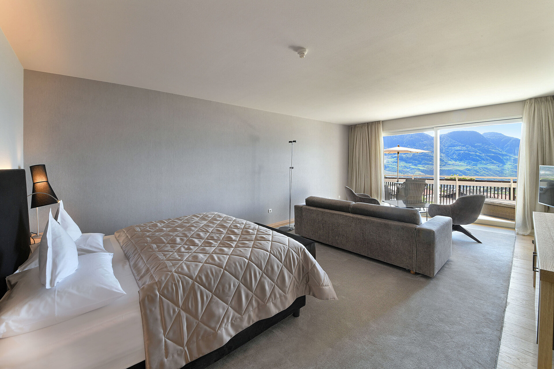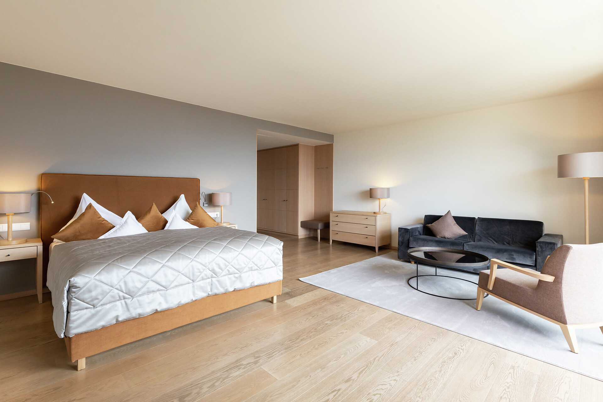 Suite lussuosa con 60 m², 3° piano con 25 m² di balcone esposto a sud e ovest, area soggiorno e area notte separate, pavimento in legno, bagno lussuoso, WC separato, radio, cassaforte, telefono, frigobar, 3 TV-SAT flat-screen, aria condizionata.