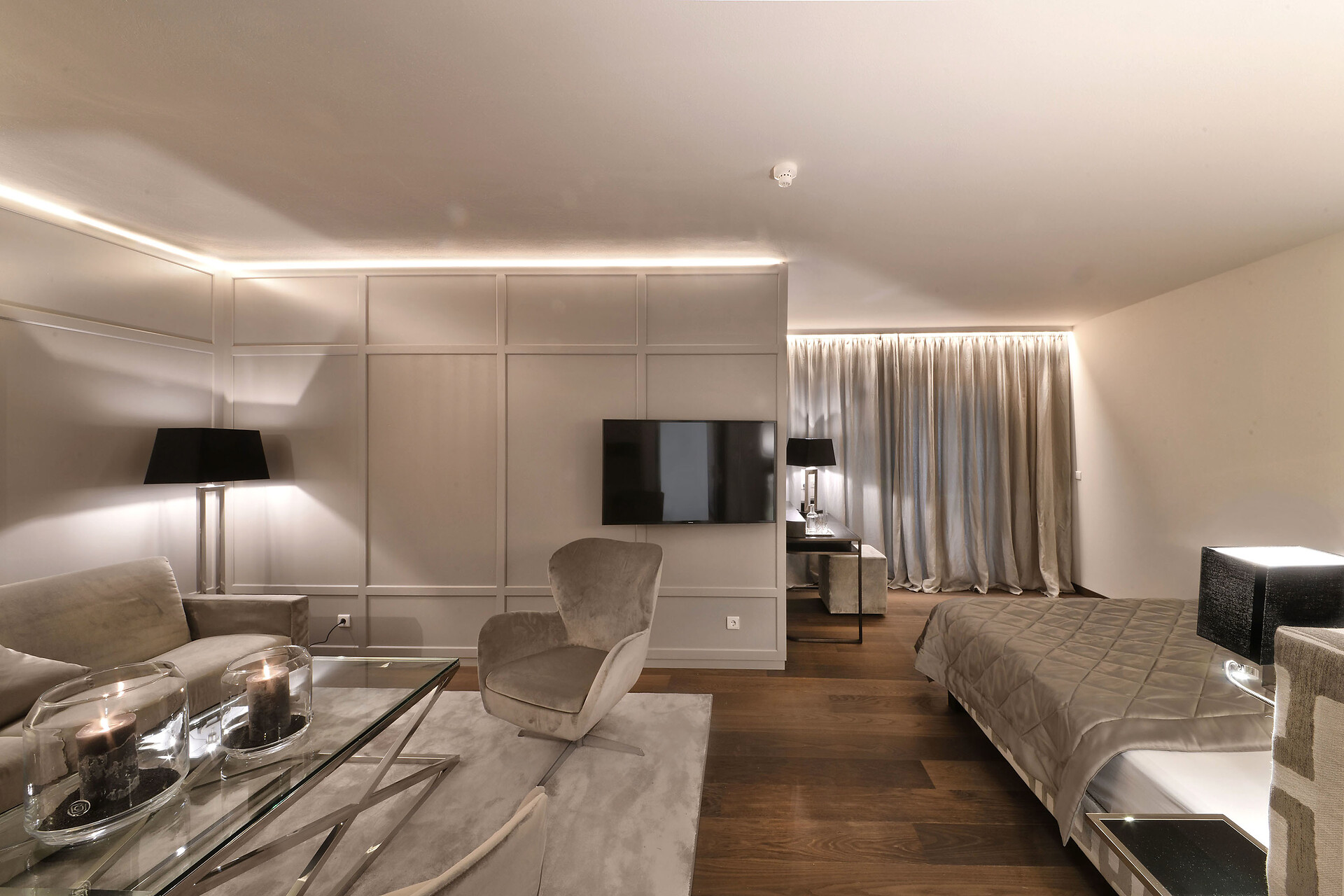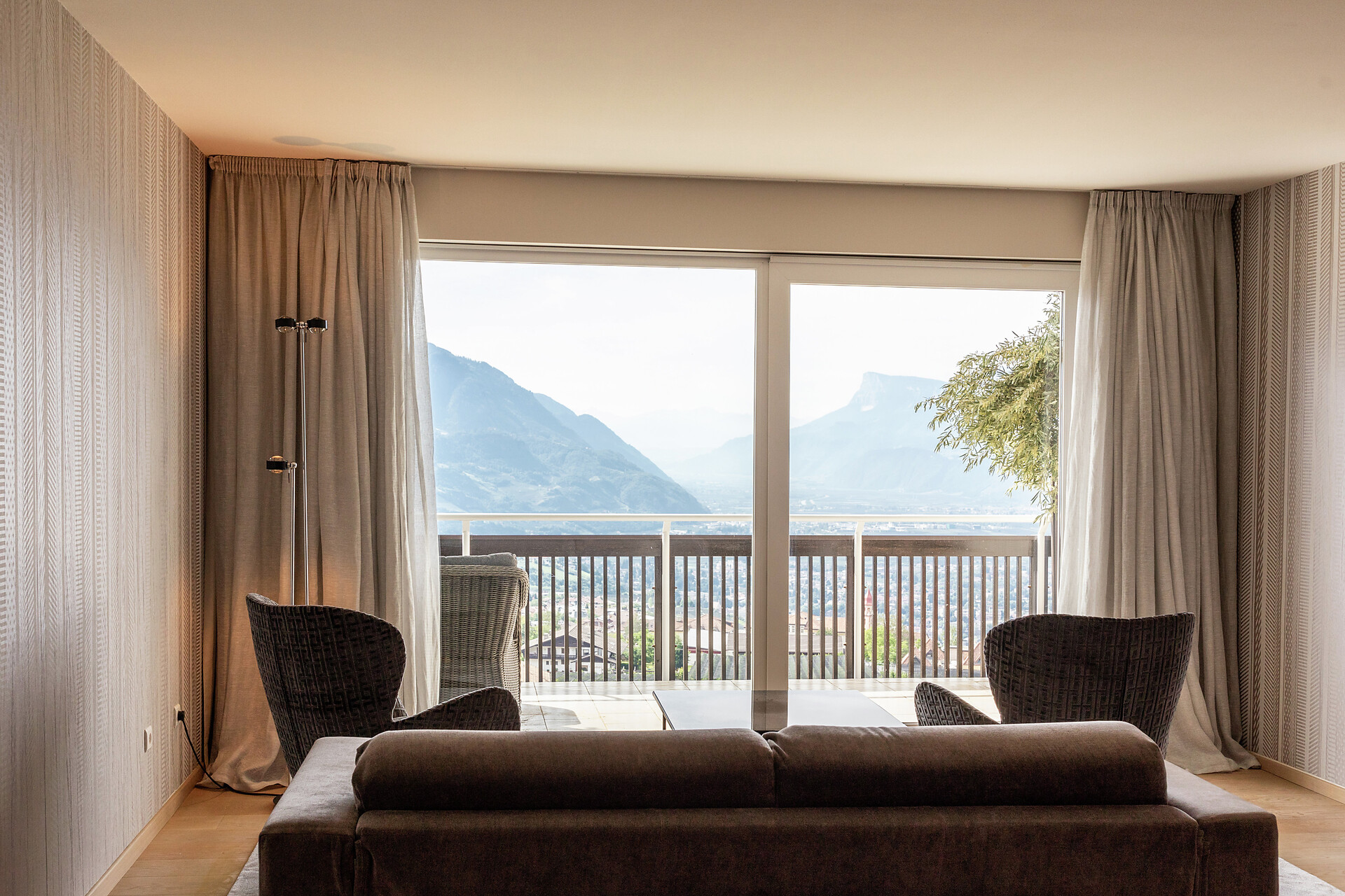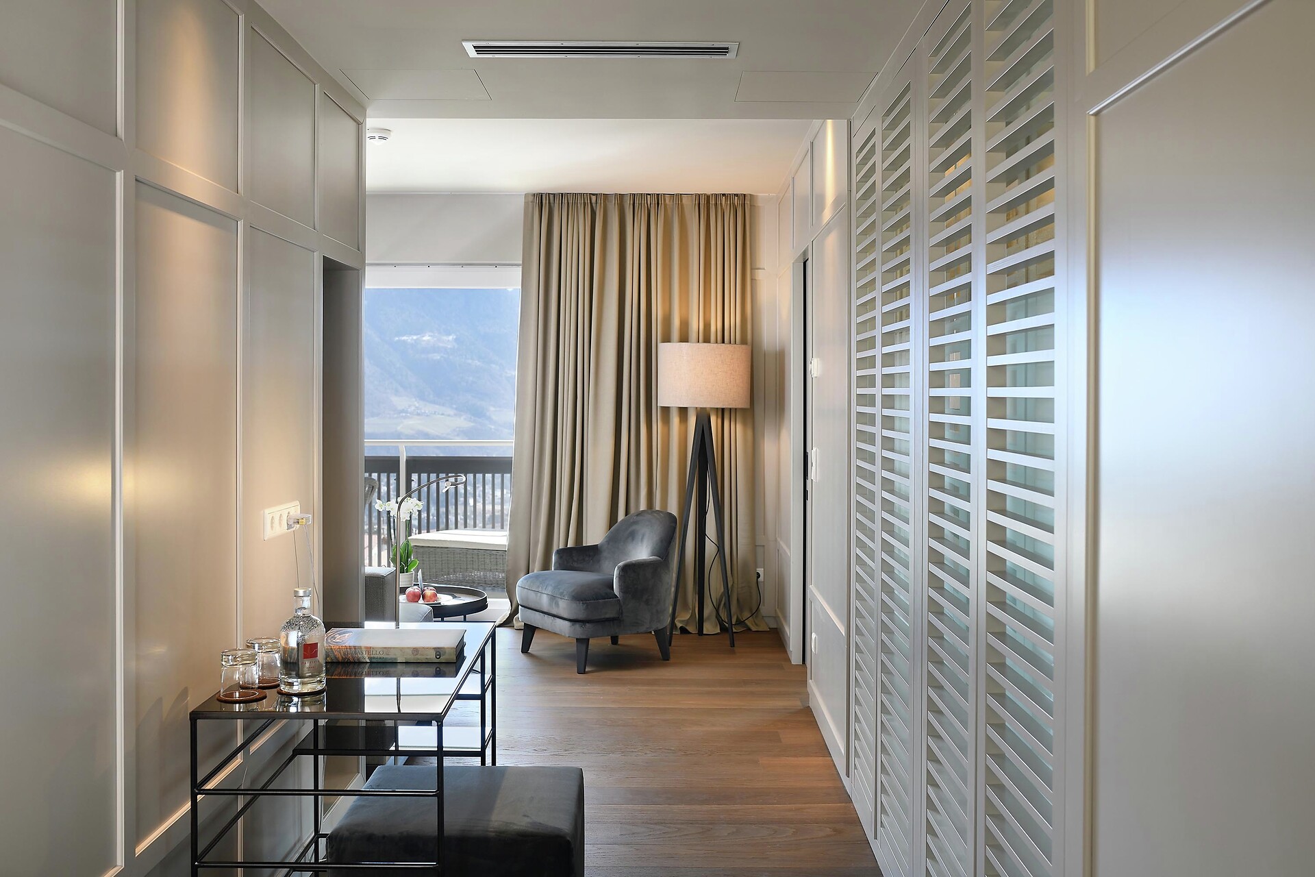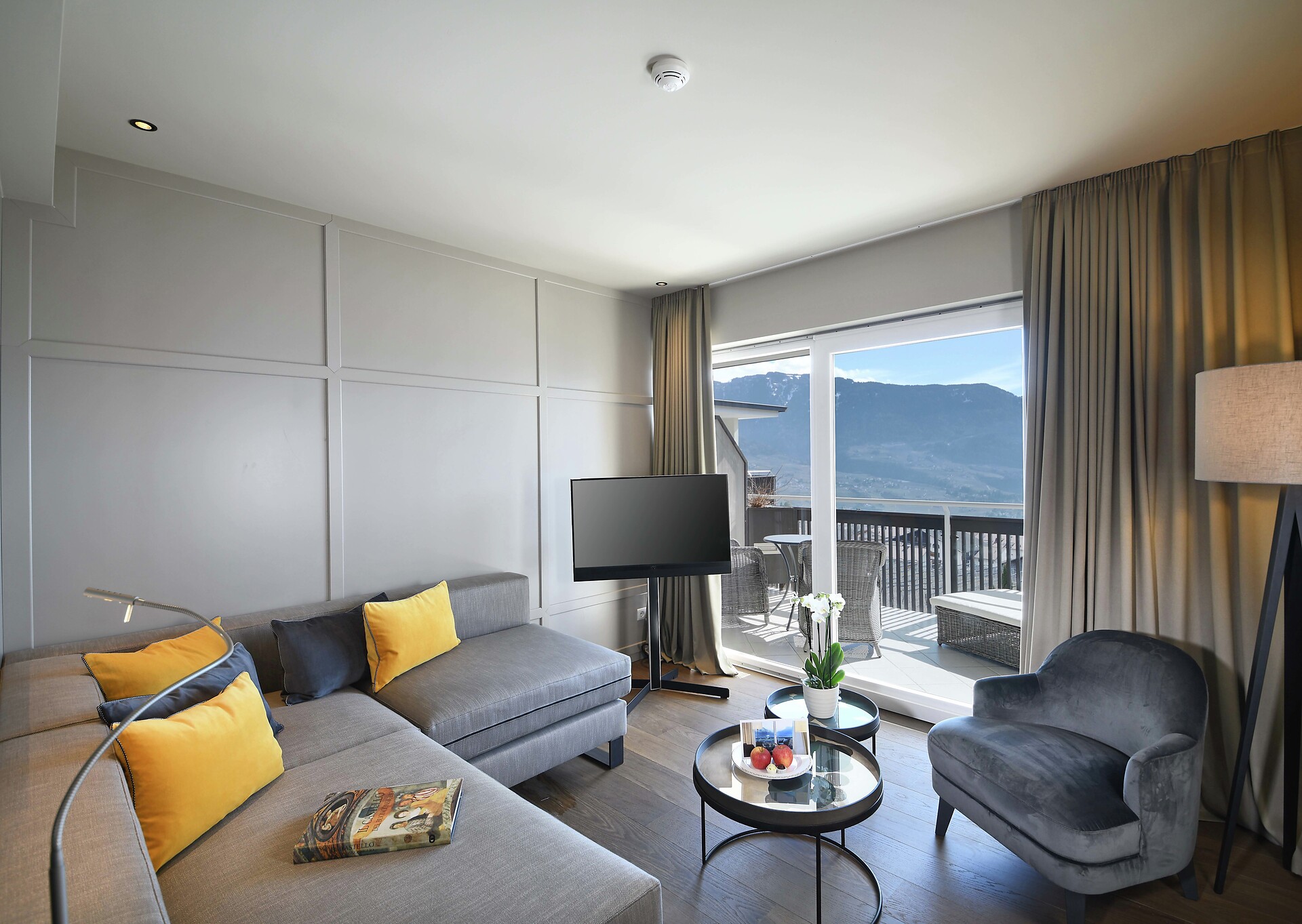 Suite lussuosa con 60 m², 3° piano con 25 m² di balcone esposto a sud e ovest, area soggiorno e area notte separate, pavimento in legno, bagno lussuoso, WC separato, radio, cassaforte, telefono, frigobar, 3 TV-SAT flat-screen, aria condizionata.