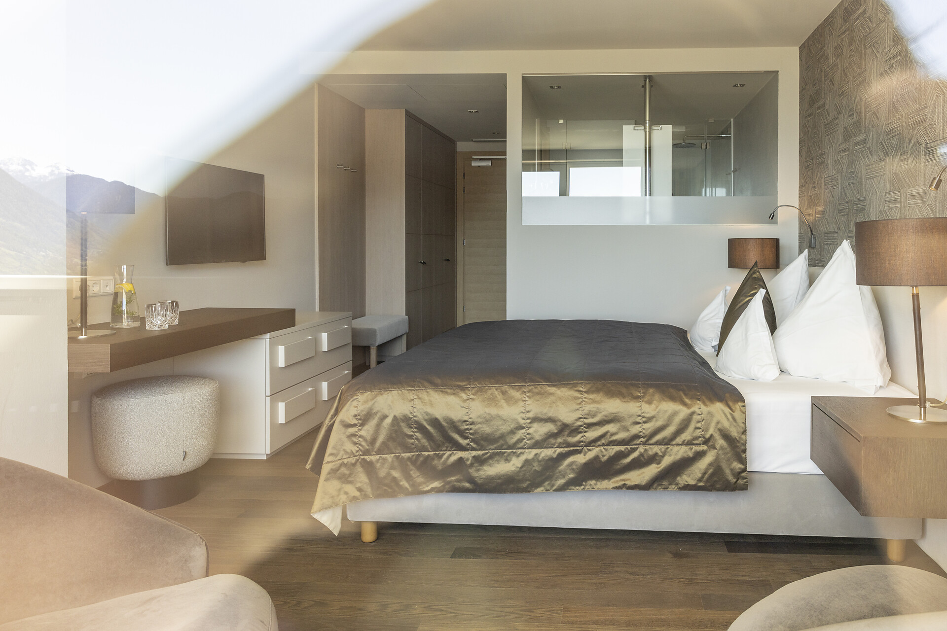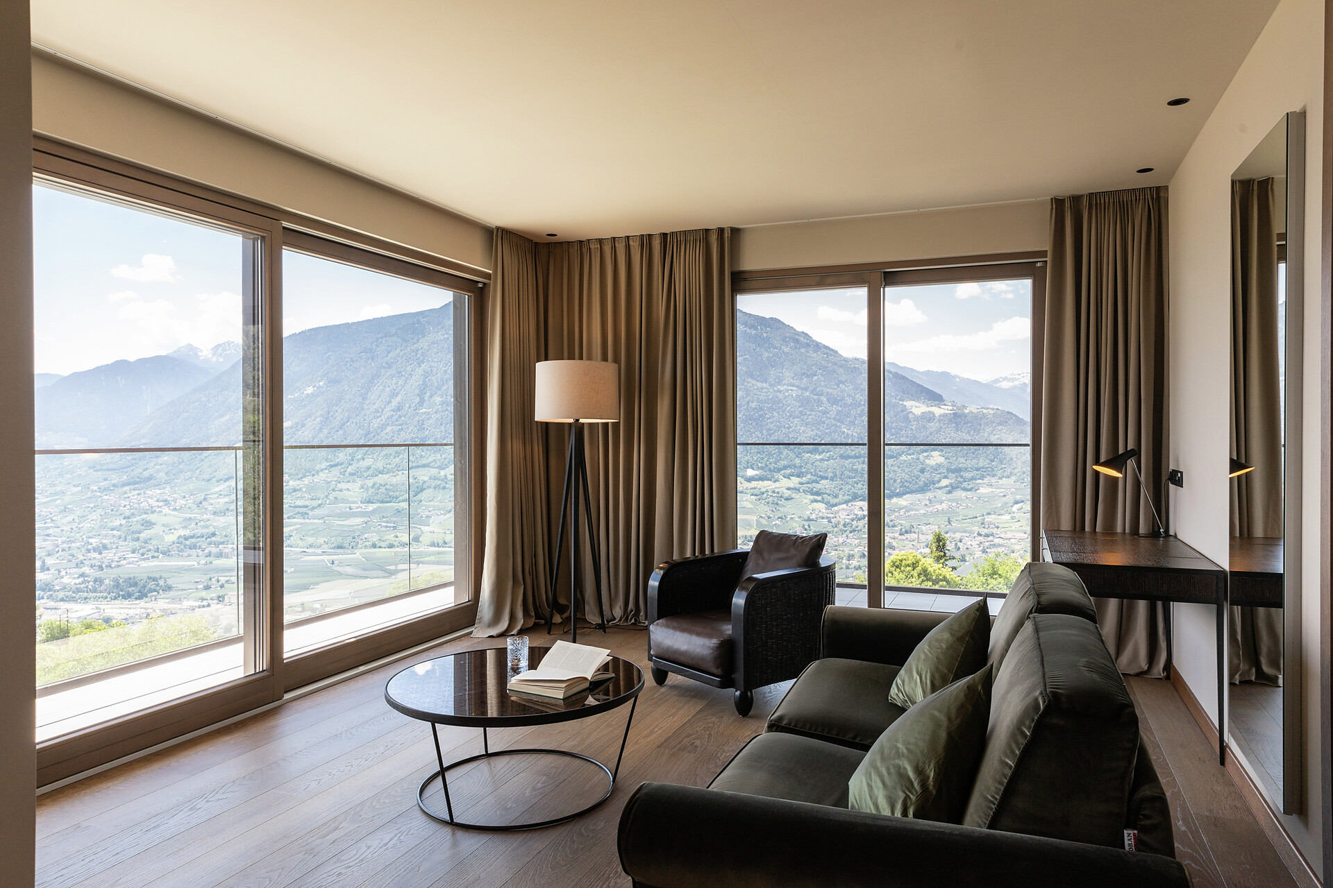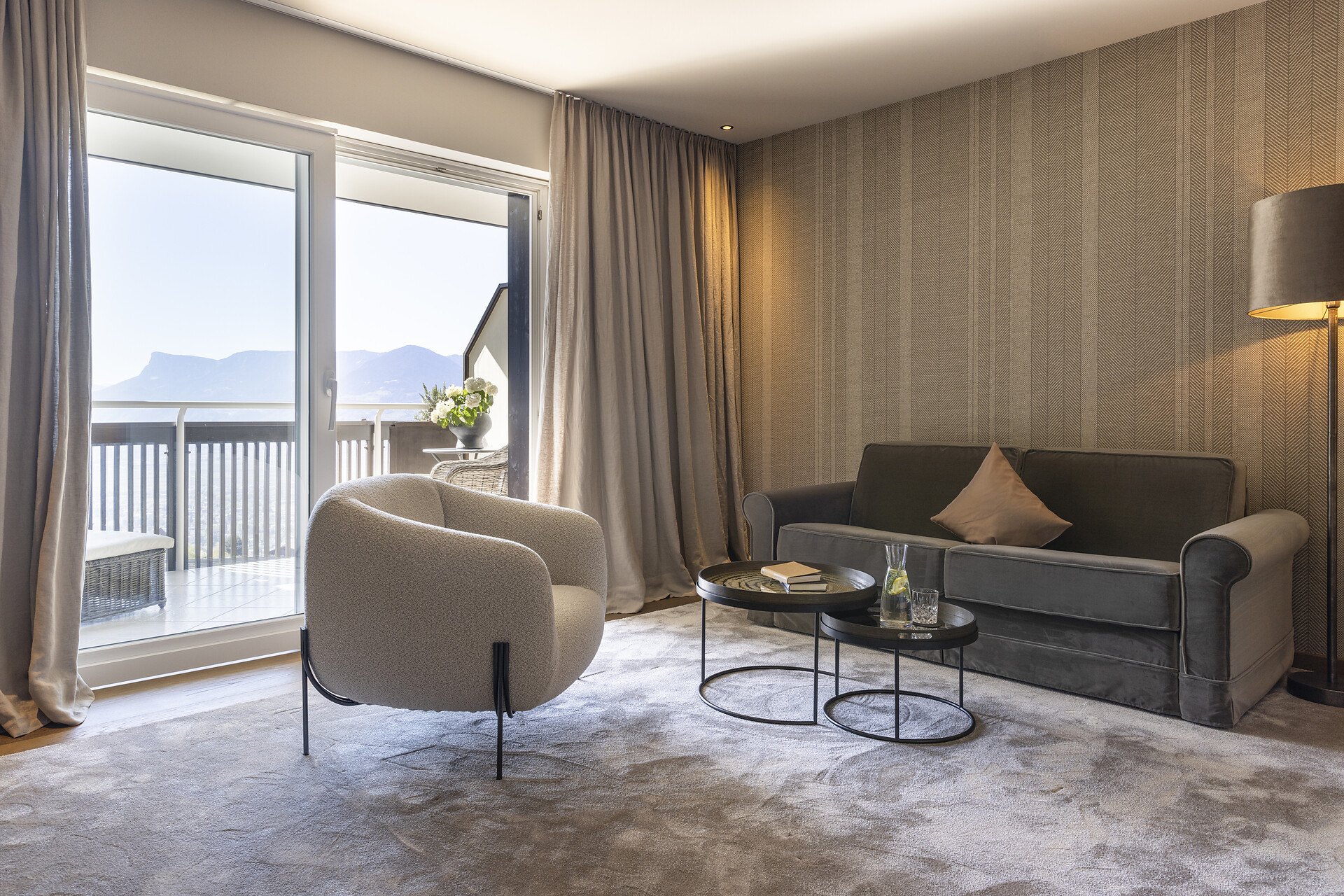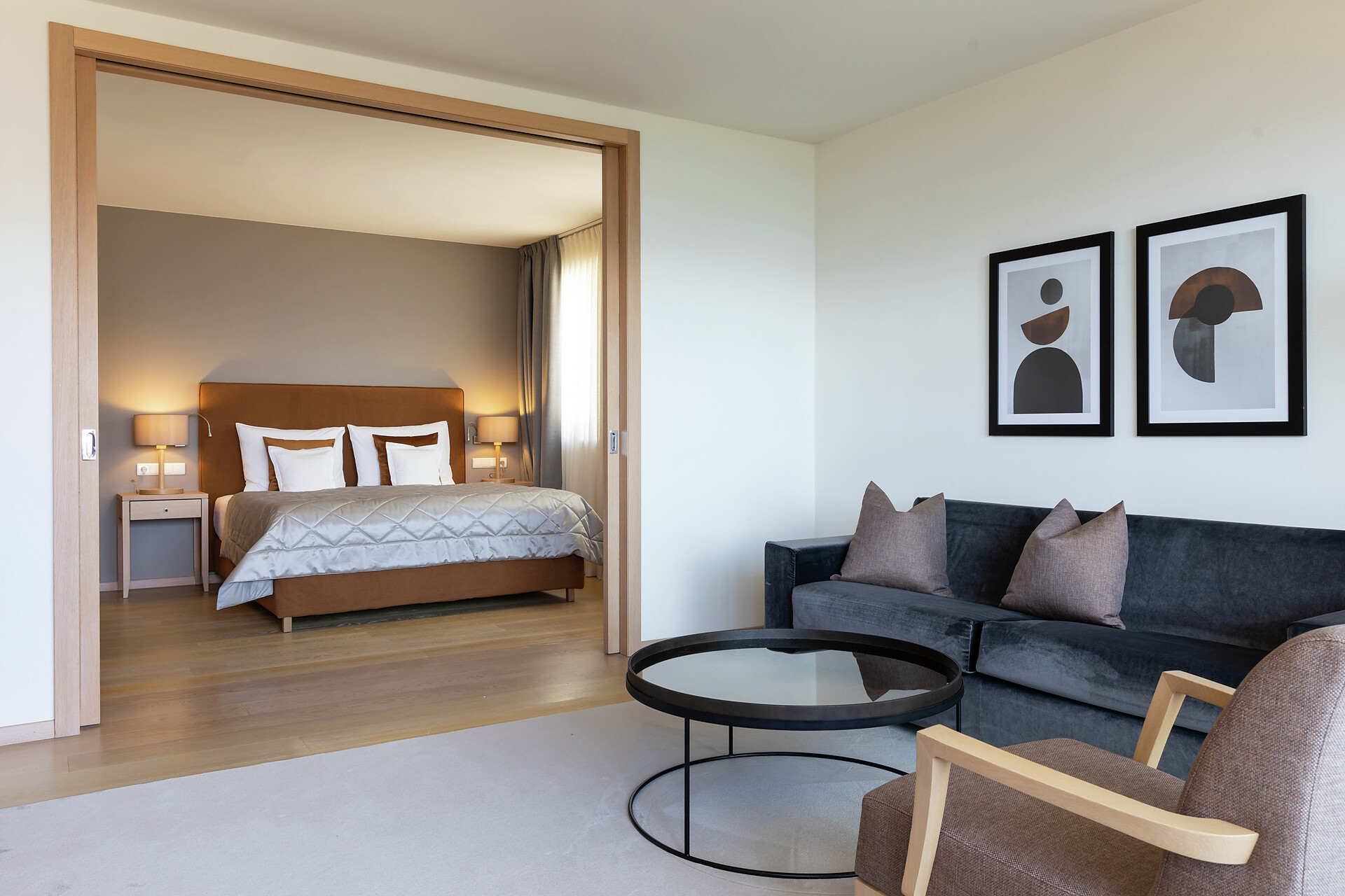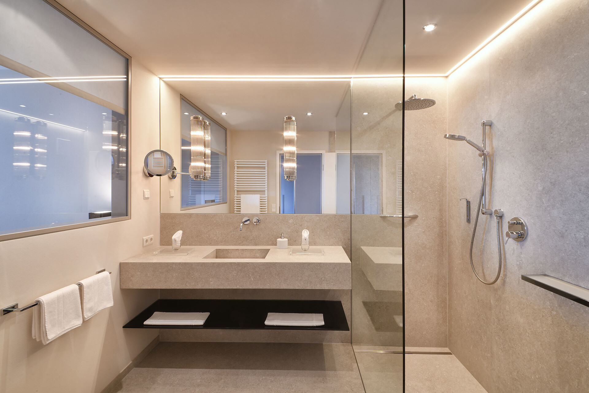 Suite lussuosa con 60 m², 3° piano con 25 m² di balcone esposto a sud e ovest, area soggiorno e area notte separate, pavimento in legno, bagno lussuoso, WC separato, radio, cassaforte, telefono, frigobar, 3 TV-SAT flat-screen, aria condizionata.