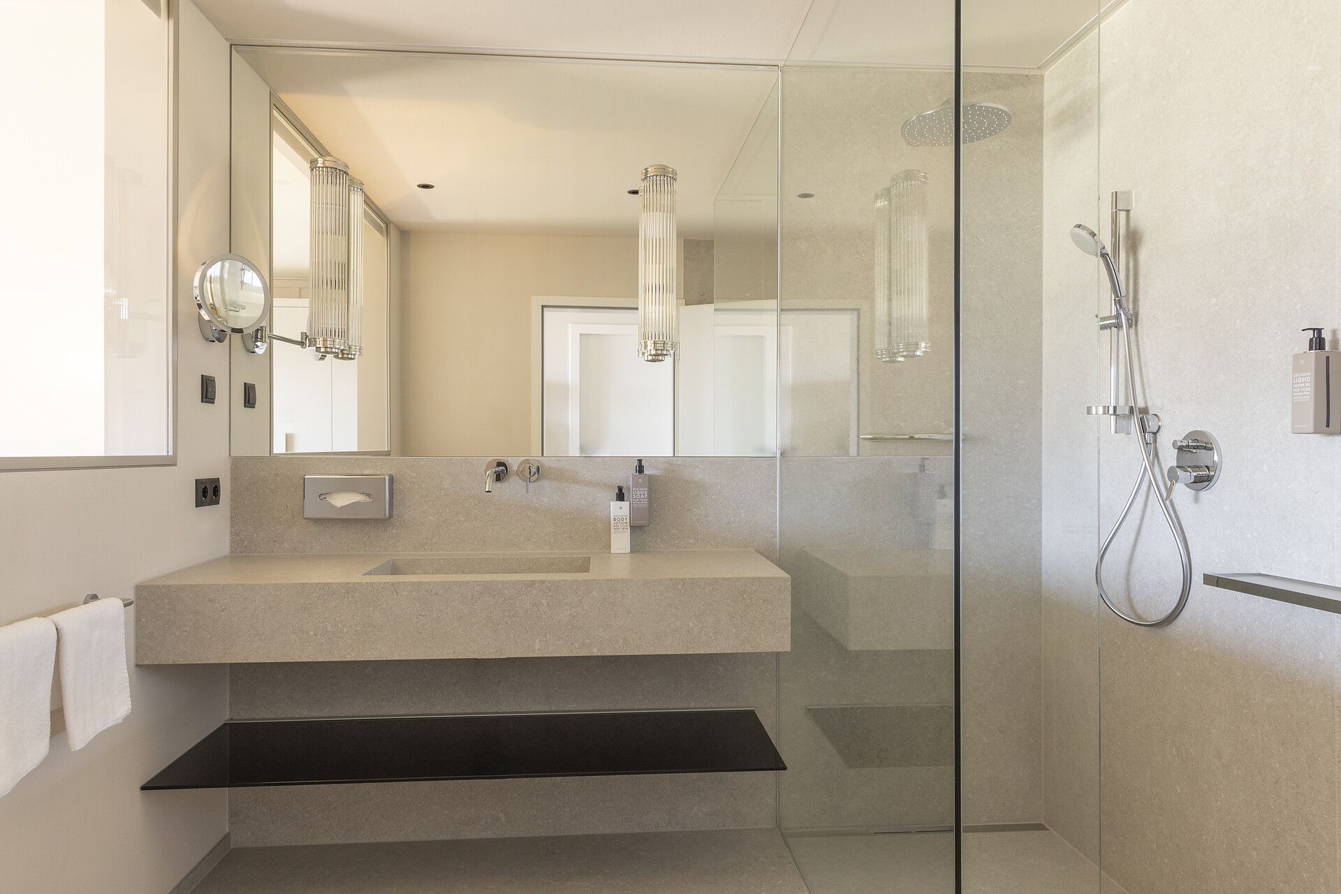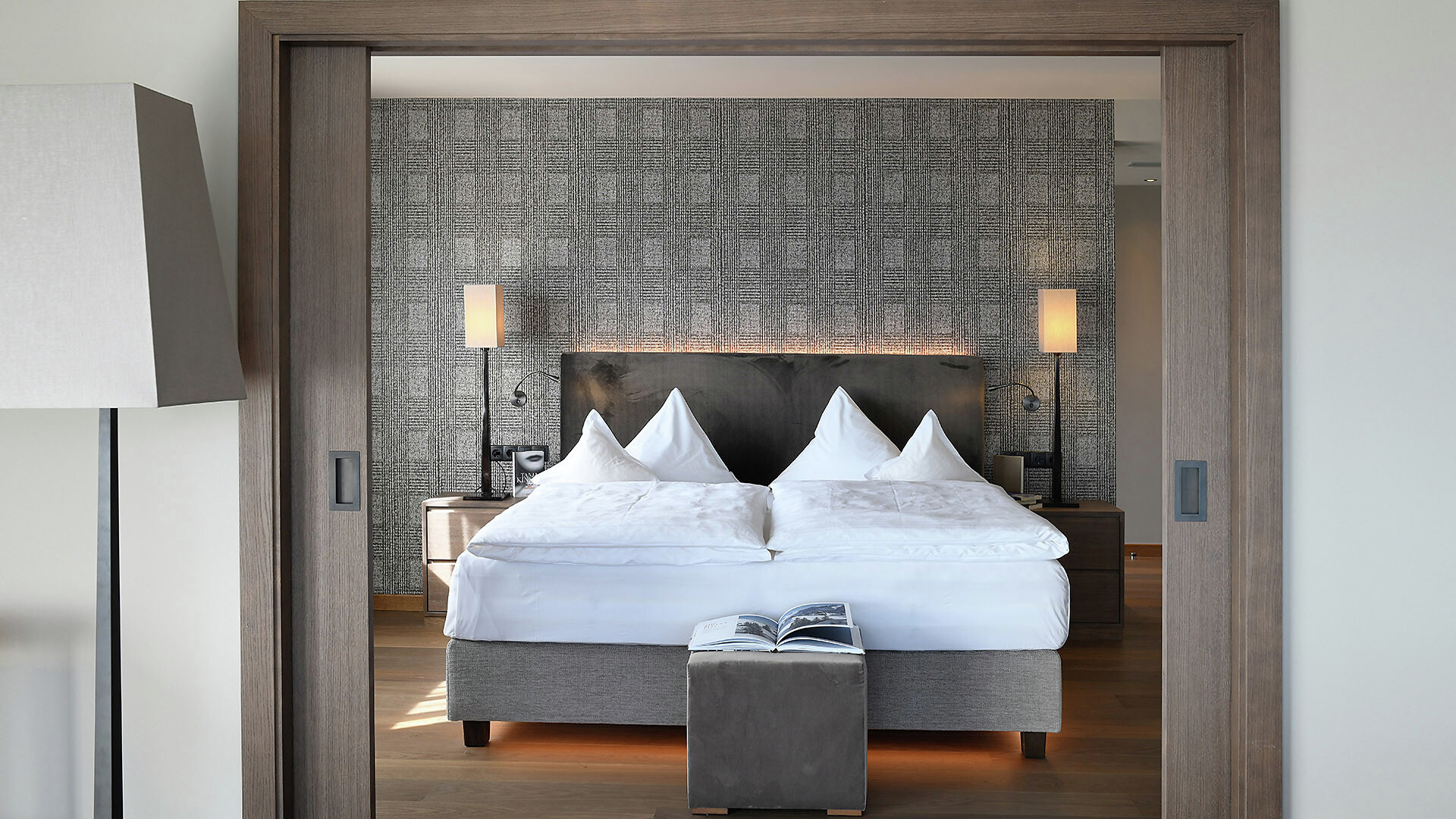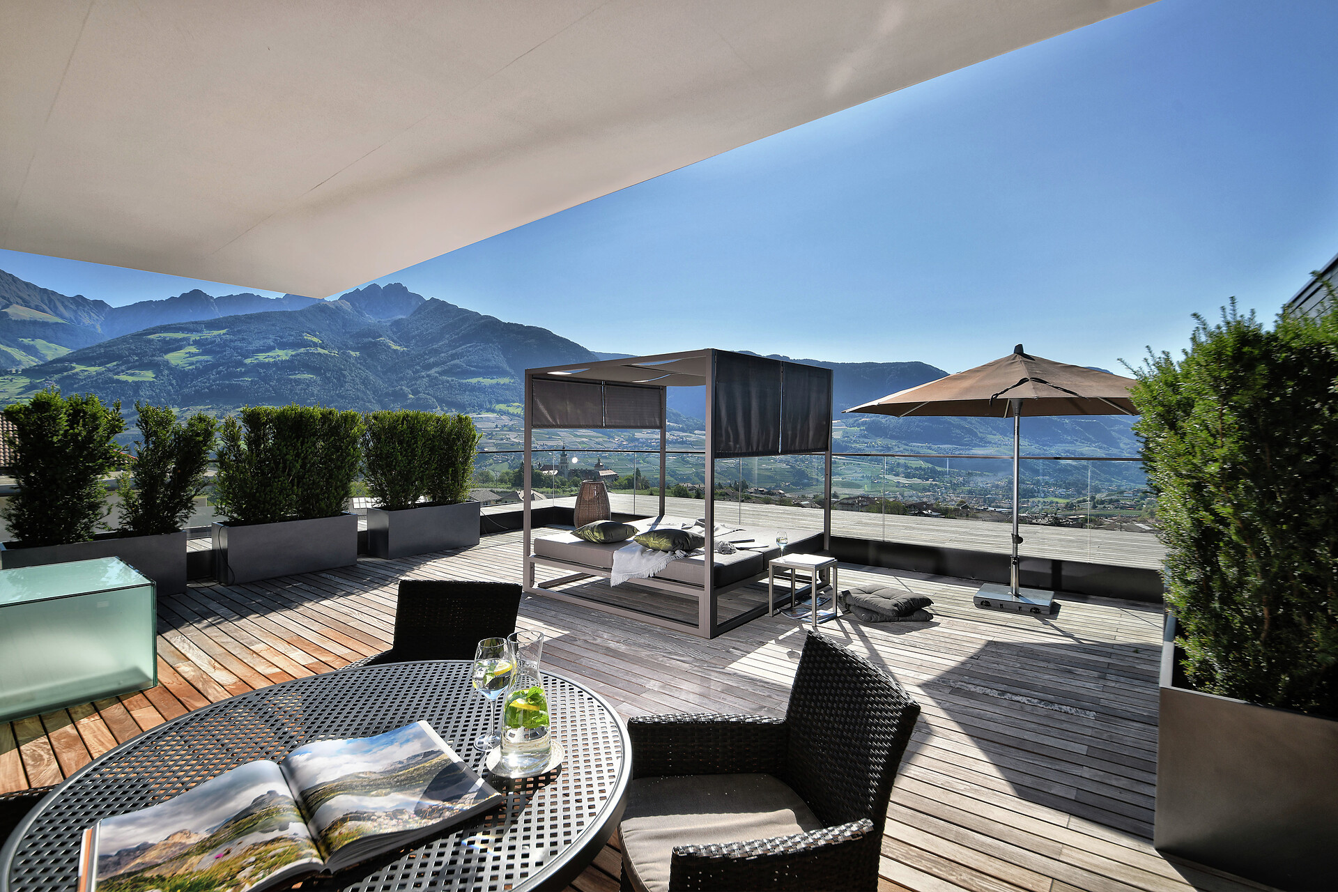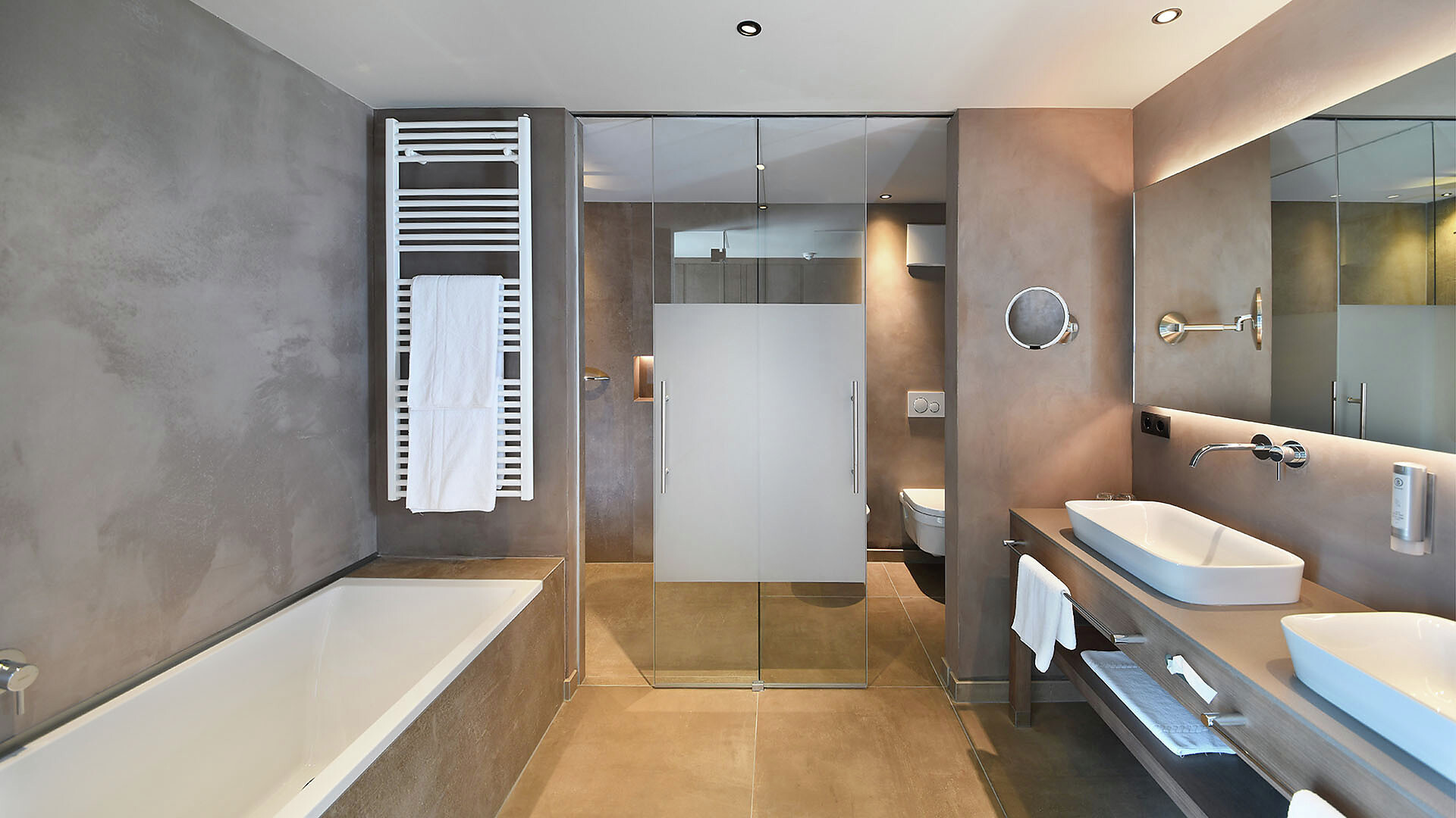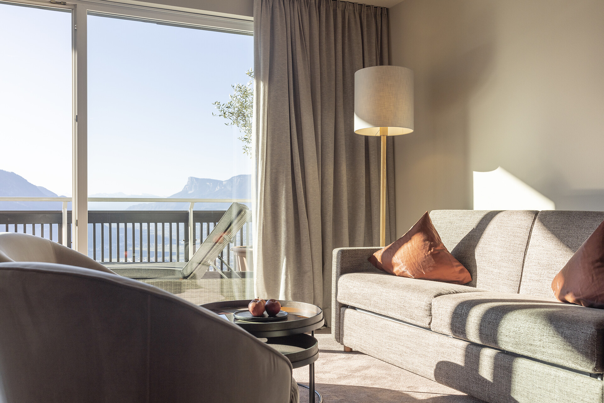 Suite lussuosa con 60 m², 3° piano con 25 m² di balcone esposto a sud e ovest, area soggiorno e area notte separate, pavimento in legno, bagno lussuoso, WC separato, radio, cassaforte, telefono, frigobar, 3 TV-SAT flat-screen, aria condizionata.