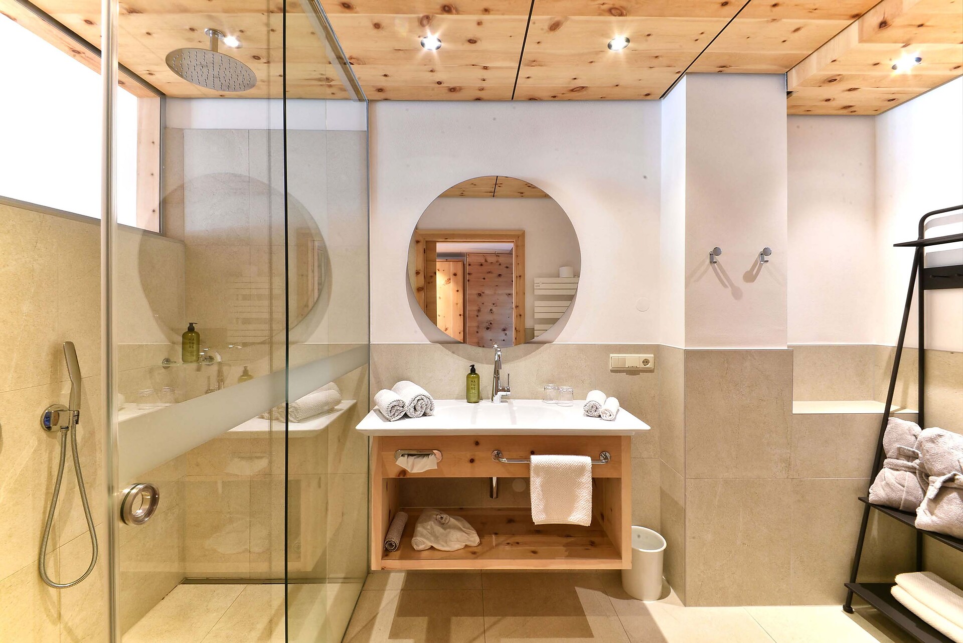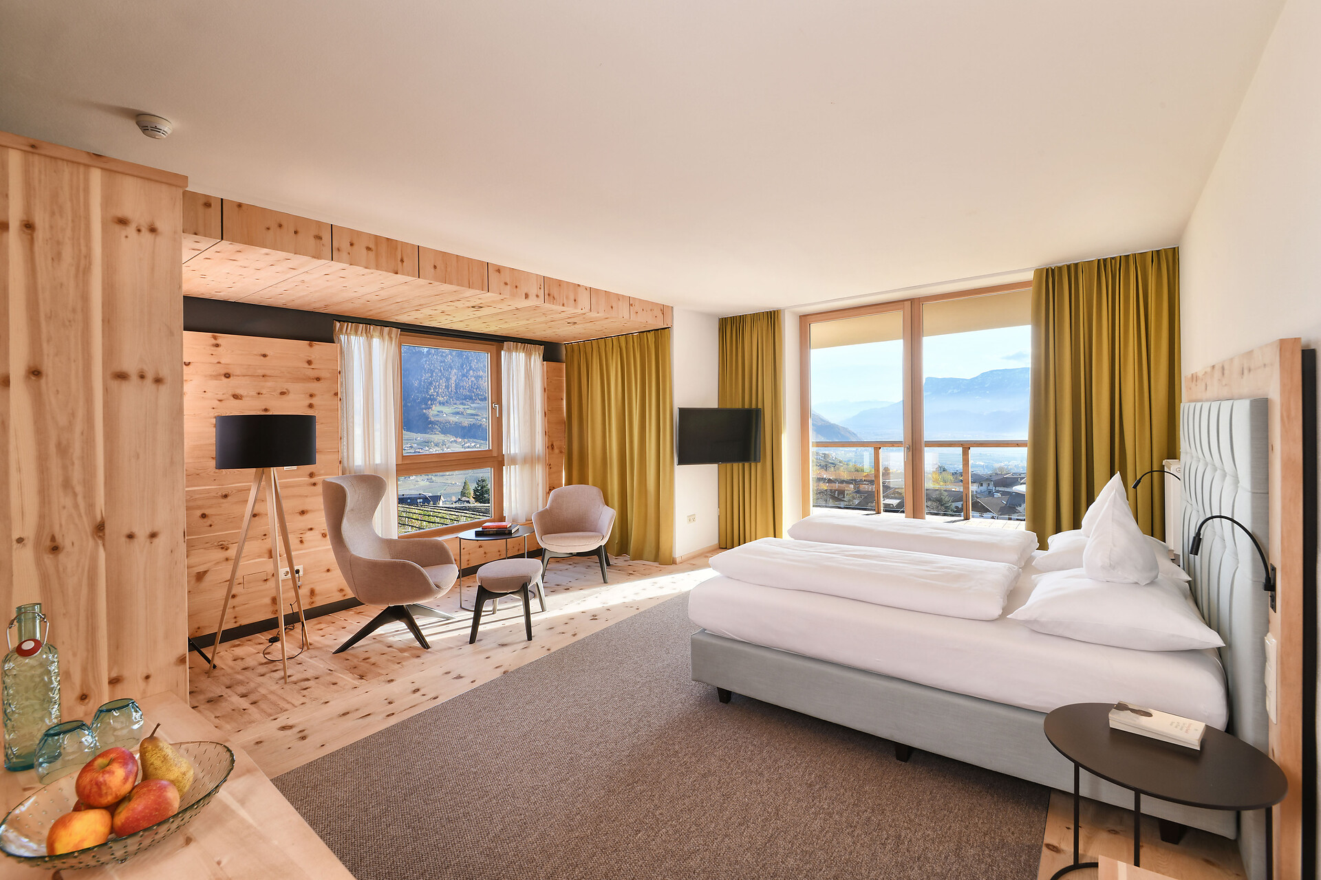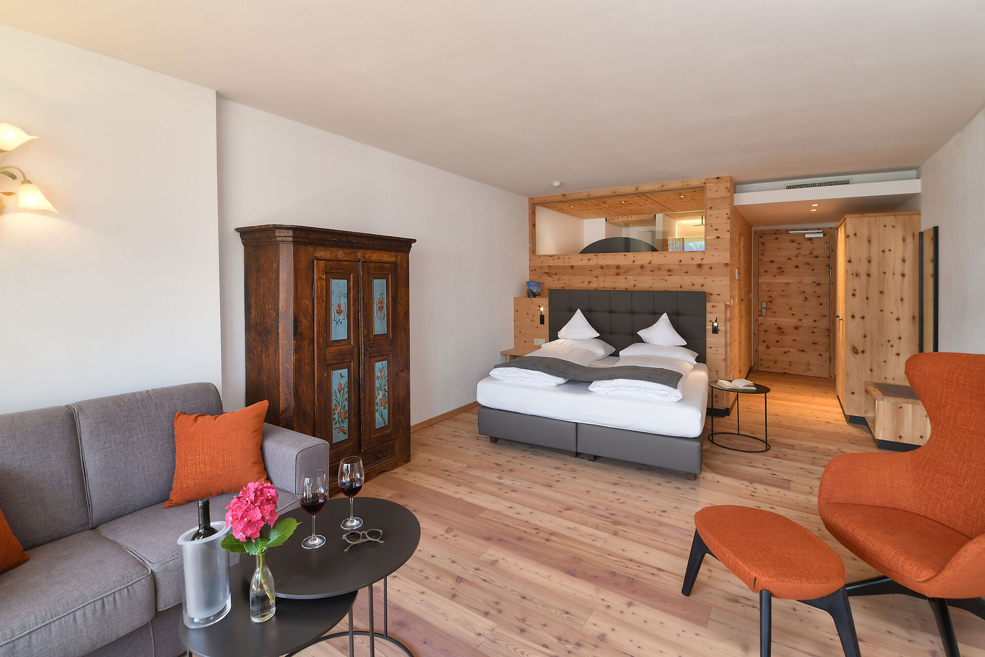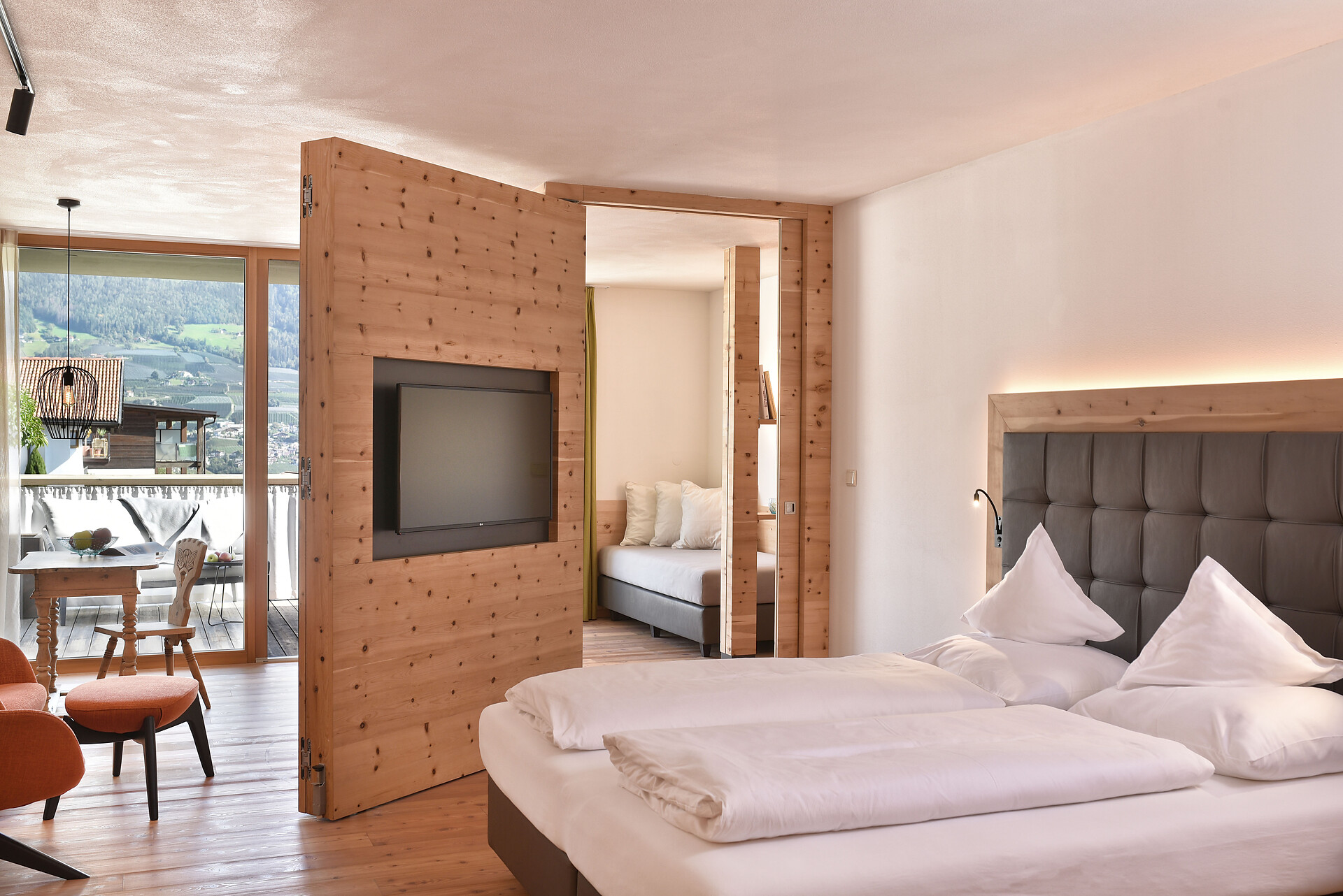Suite con mobili in cirmolo e pavimento in legno di larice,