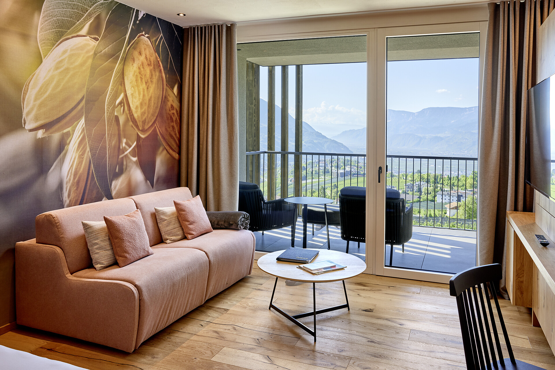* Posizione unica – tranquilla, centrale, strada pianeggiante verso il paese (senza traffico di passaggio) con vista libera sui nostri meli e su Merano.