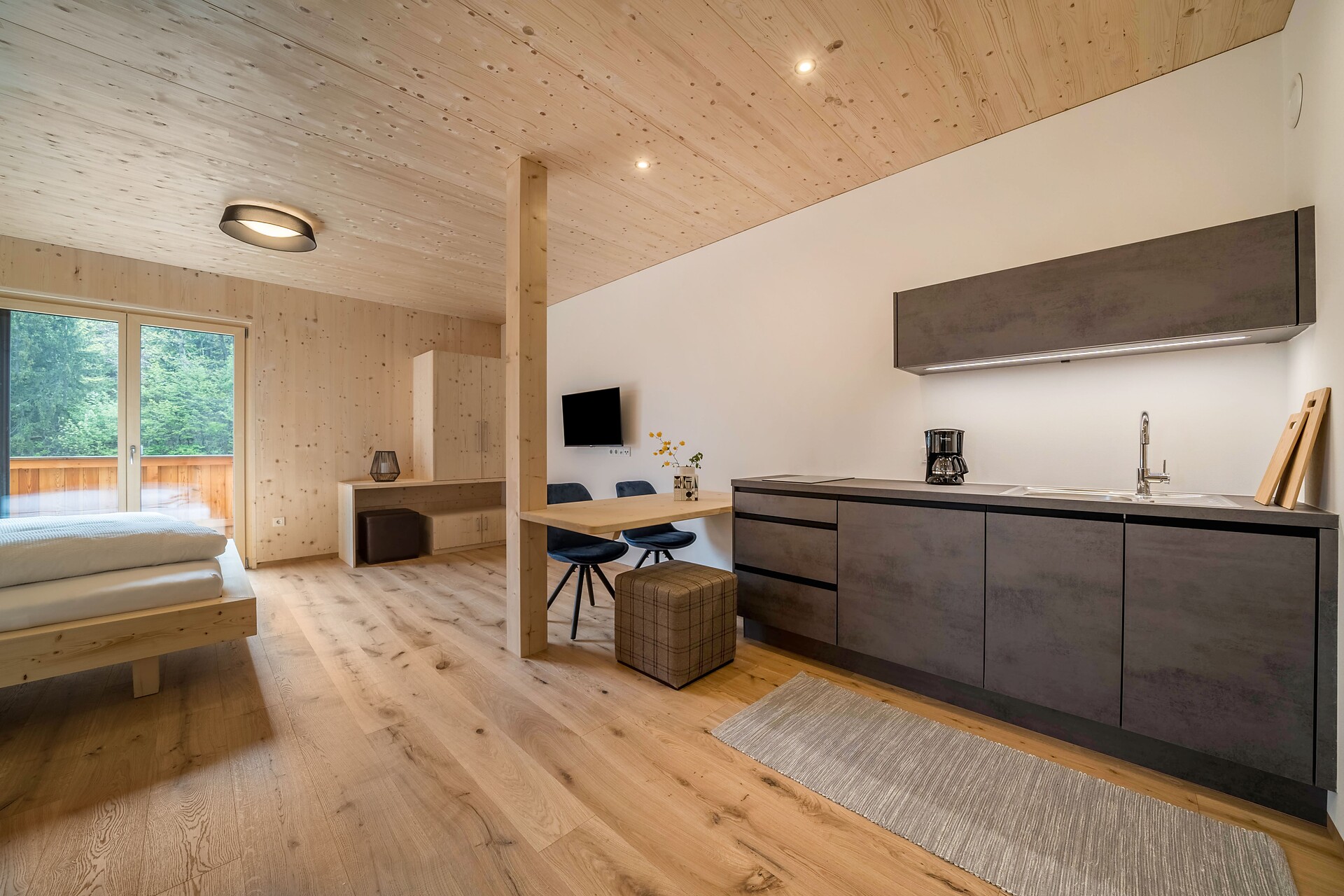 Il nostro monolocale in abete rosso è piccolo ma accogliente. Adatto a chi ama l'intimità. Il monolocale dispone di un balcone esposto a sud-est dove potrete gustare il vostro caffè mattutino al sole.