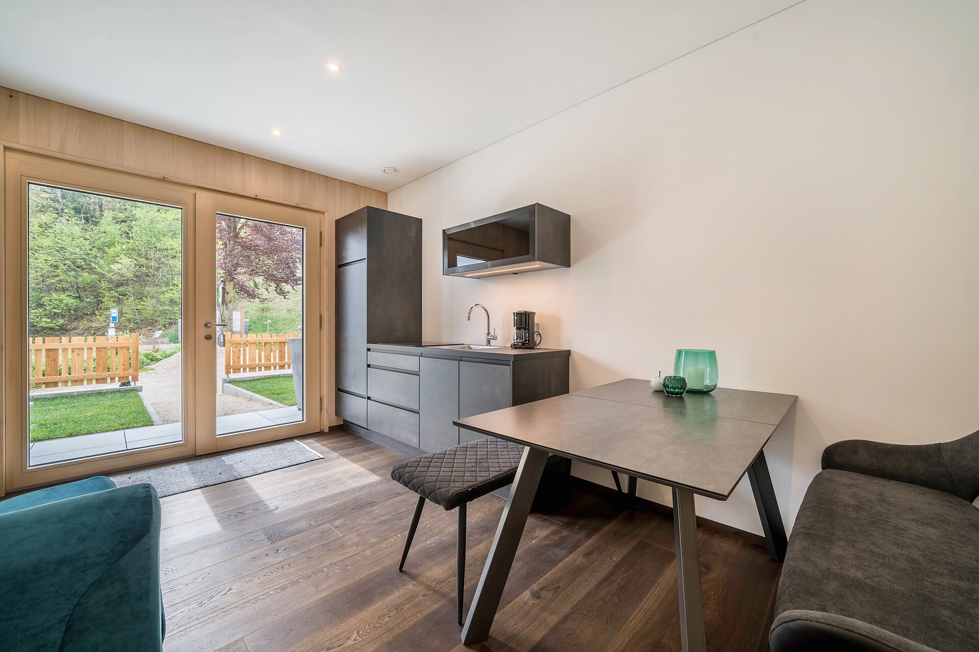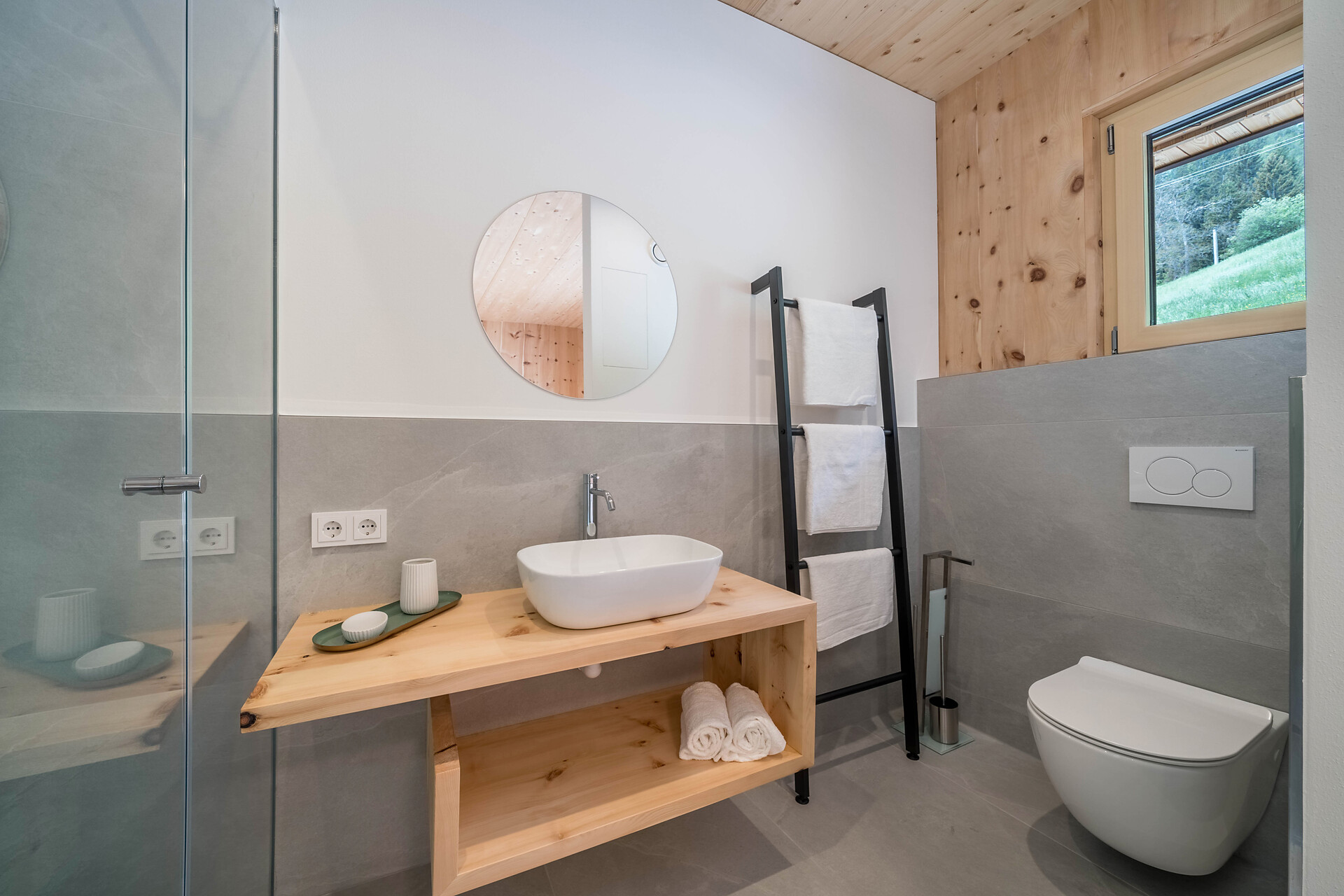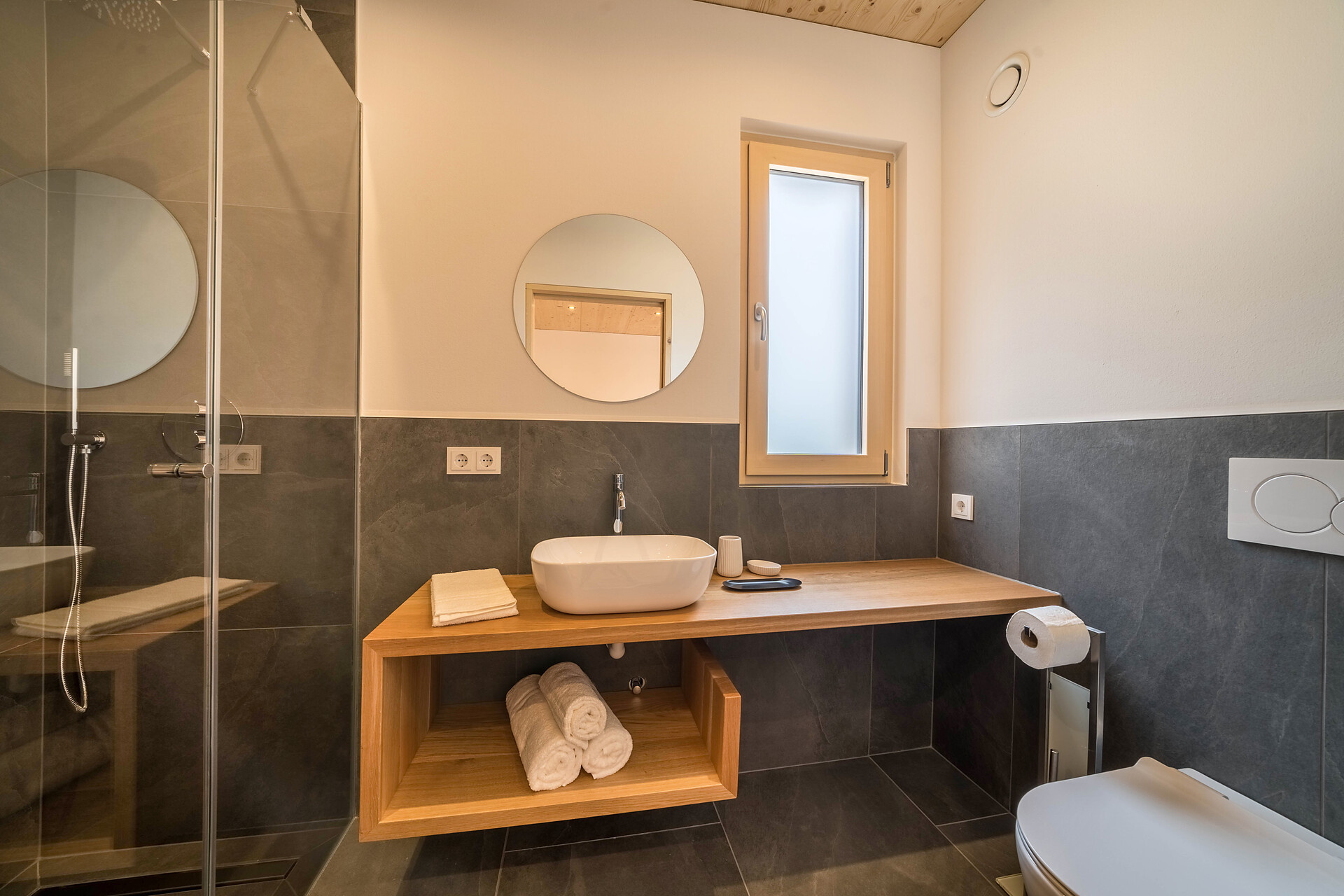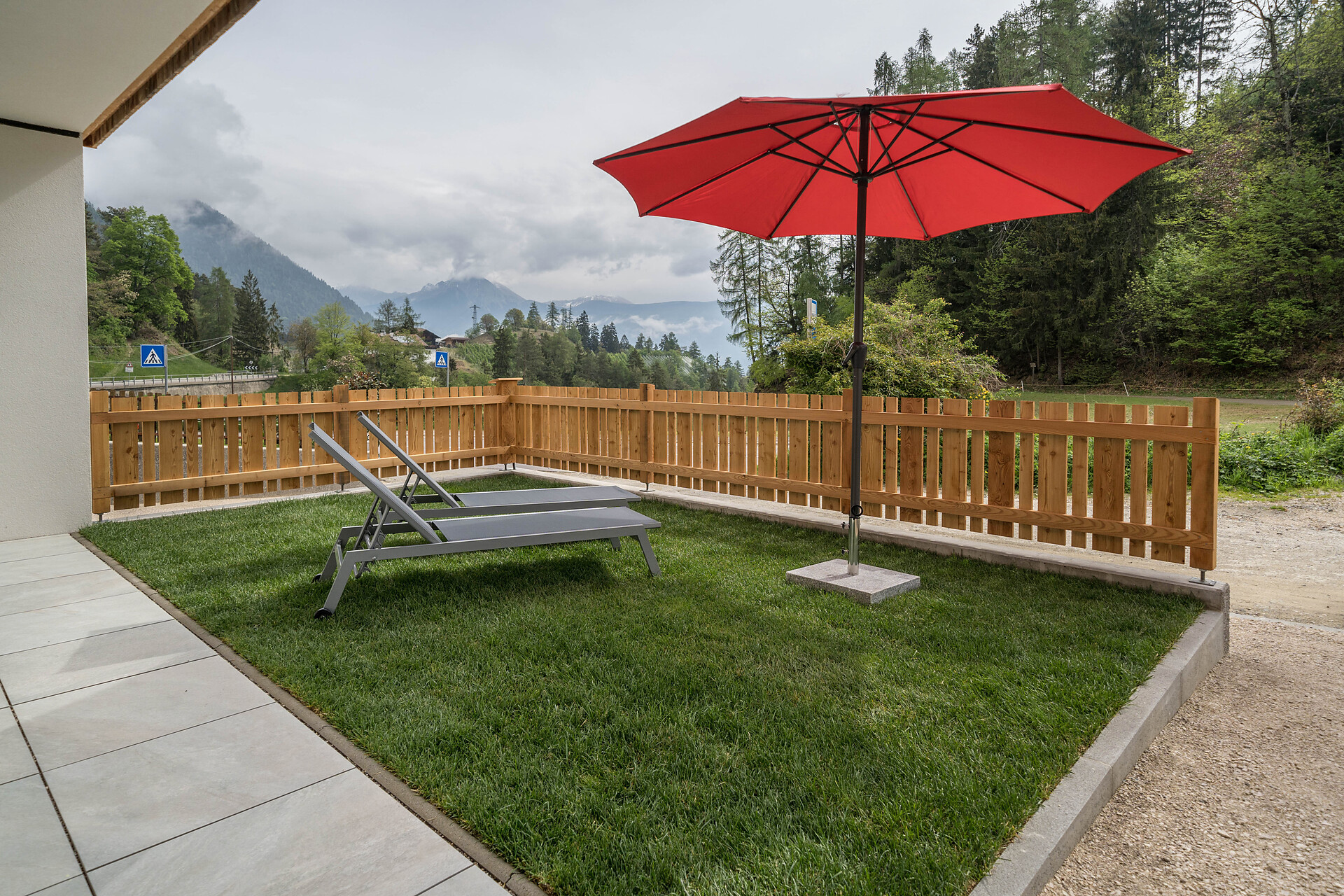 Il legno chiaro, quasi bianco, dell'abete rende l'appartamento luminoso e gli accenti colorati gli conferiscono un proprio stile. Nell'ampio giardino esposto a sud-est si può godere del sole dalle prime ore del mattino fino al tardo pomeriggio. Dopo una lunga giornata di escursioni, potrete rilassarvi nella spaziosa doccia a pioggia.